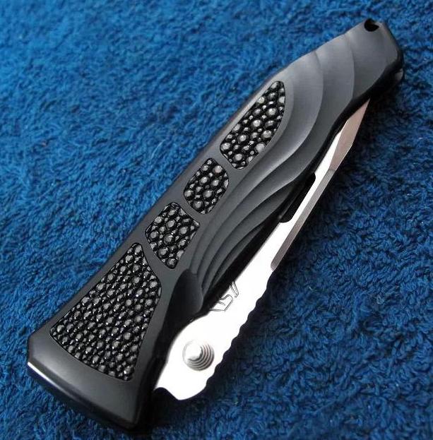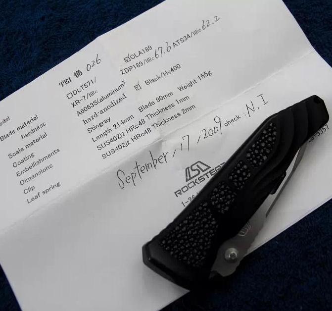 柄材:Aluminum 6063S+魟鱼皮+涂层硬度Hv400(线锁 SUS402j2,硬度48,厚度2mm)。