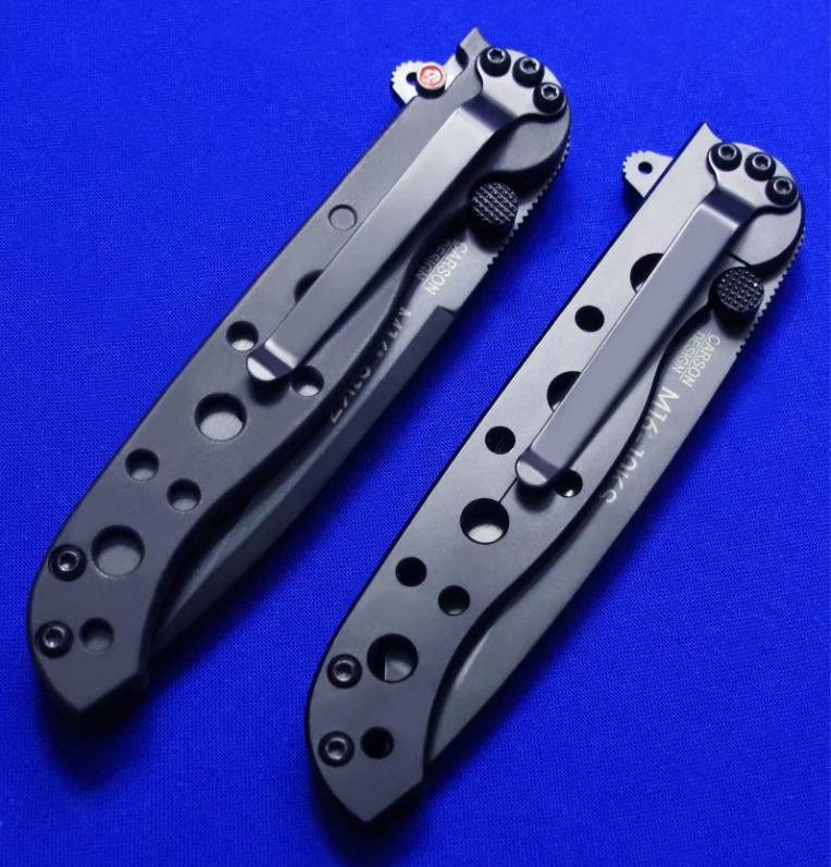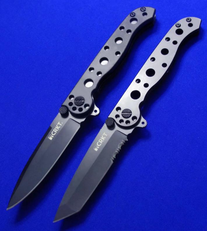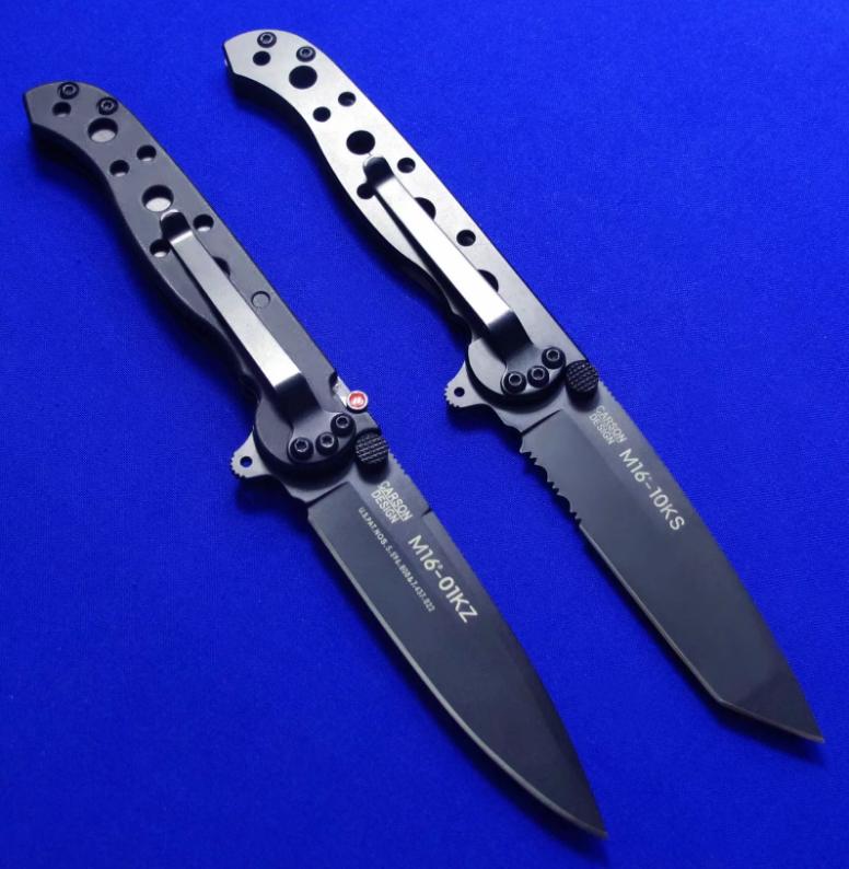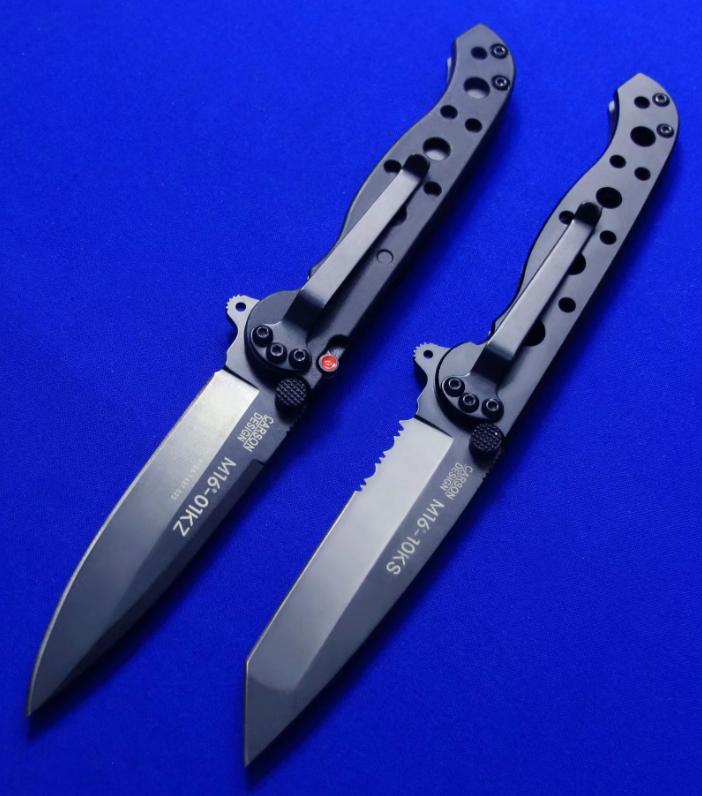 CRKT M16战术折刀,左款线锁,右款一体锁。 既可Flipper快开,也可传统手动(推刀钮)开启。