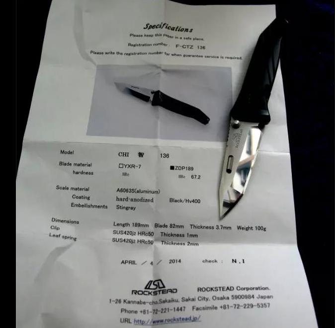 柄材:Aluminum 6063S+魟鱼皮+钻石涂层(涂层硬度Hv400。线锁 SUS420J2,硬度50,厚度2mm)。