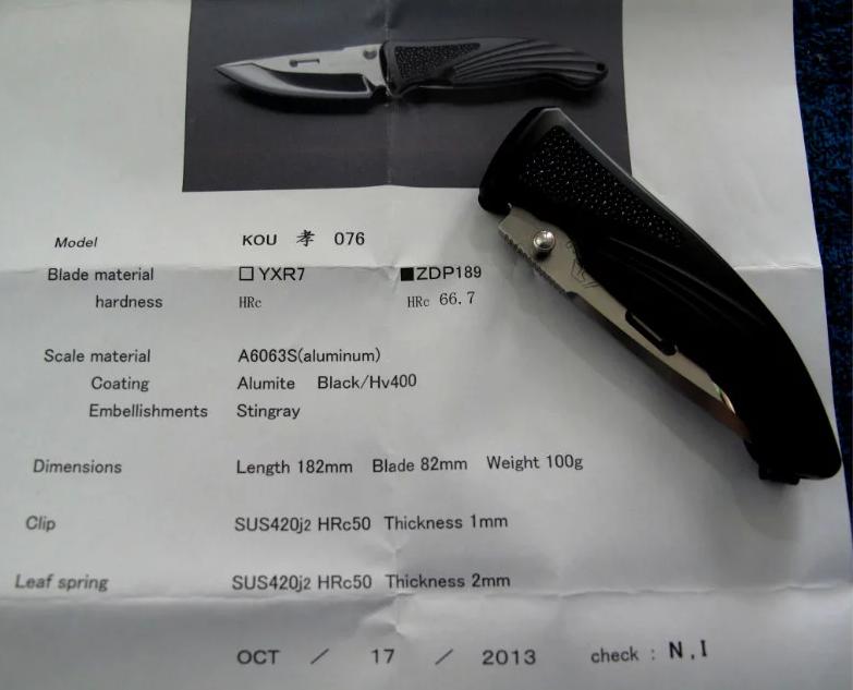 柄材:Aluminum 6063S+魟鱼皮+钻石涂层(涂层硬度Hv400。线锁 SUS420J2,硬度50,厚度2mm)。