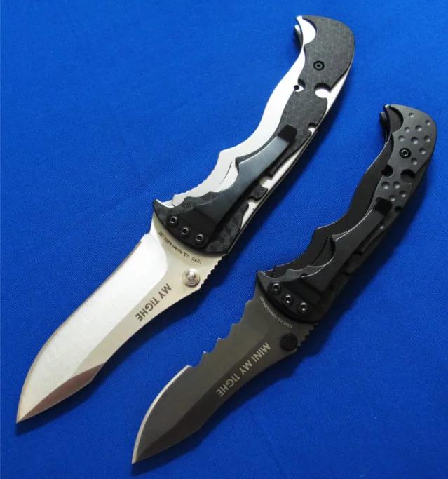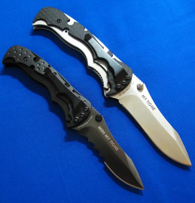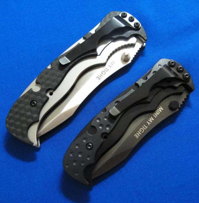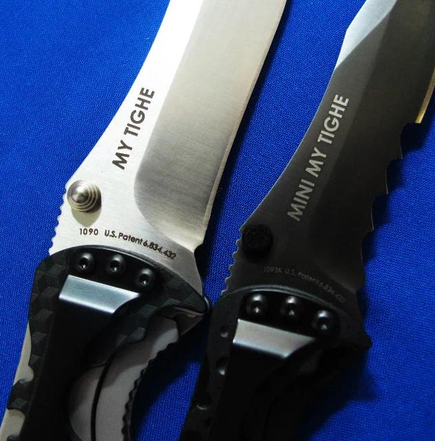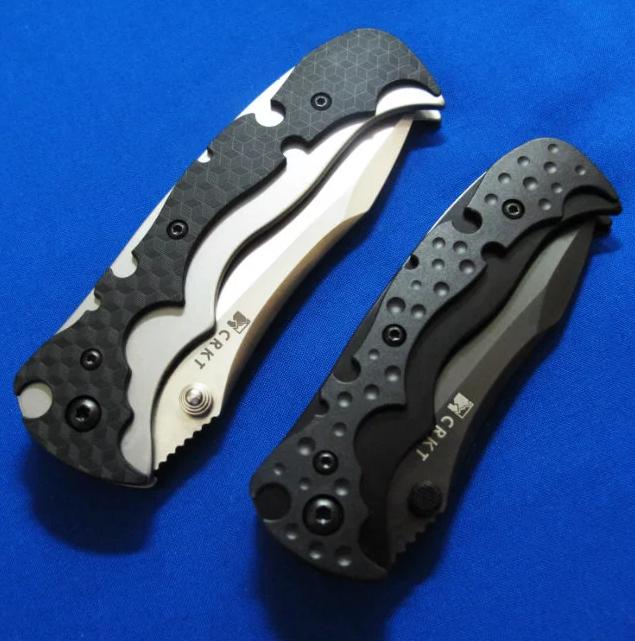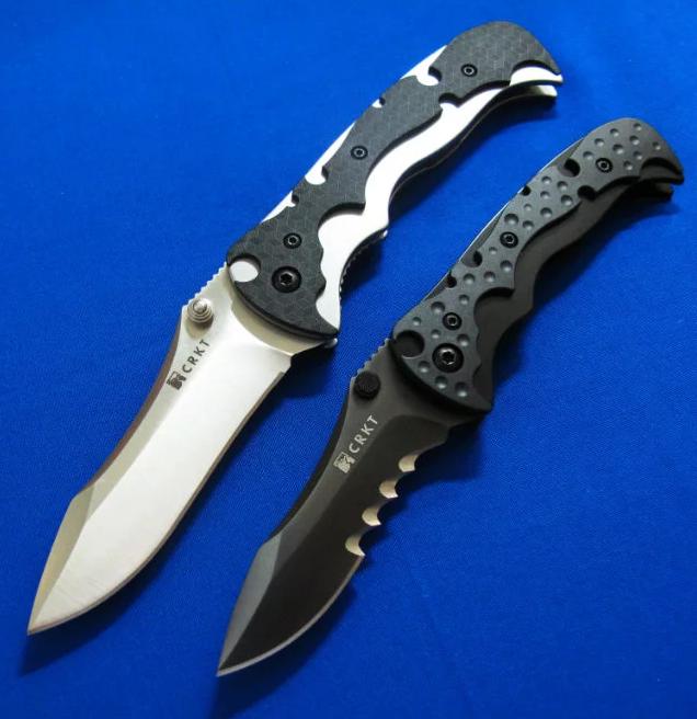 CRKT & Brian Tighe 布莱恩.泰(加拿大刀匠协会主席)合作 半自动侧跳。 全长:17.5(小)20.5(大)cm。 刃厚:8mm。 刃材:AUS 8。 硬度:58-60。 柄材:不锈钢+Zytel。 产地:台湾。