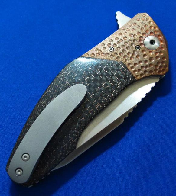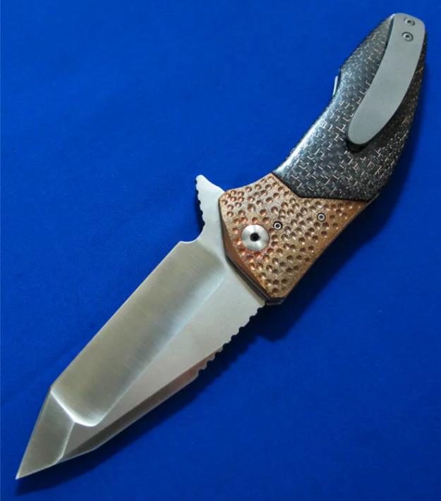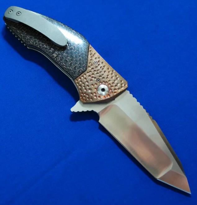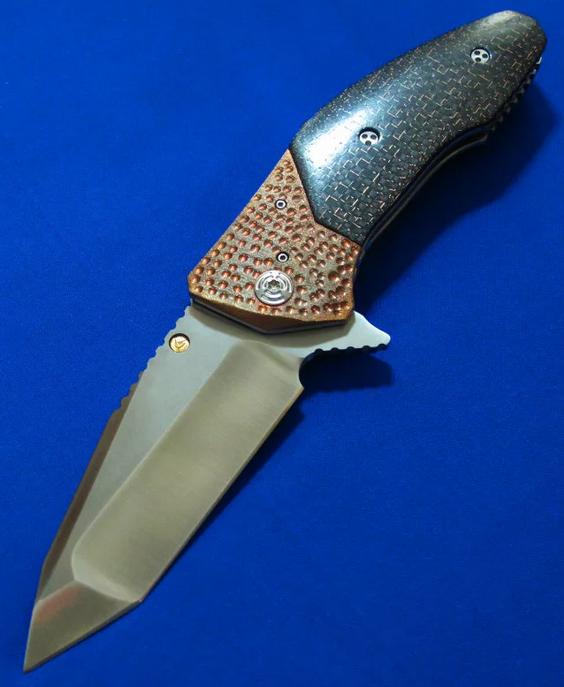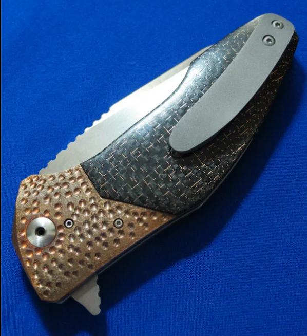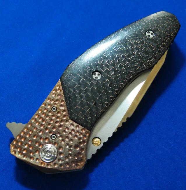 大师Allen Elishewitz 阿龙.艾利舍维茨 手工名作 Saboteur破坏者 Flipper快开版本。全长:21.8cm。刃厚:3.8mm。刃材:CPM154,镶嵌镀金LOGO。硬度:60-62。柄材:雷击碳纤维(金丝碳纤维)+钛合金。产地:美国。