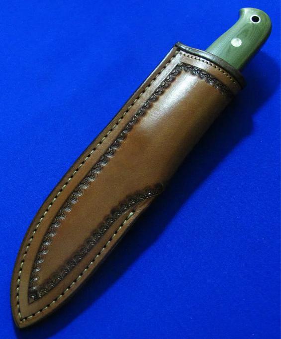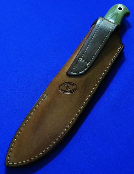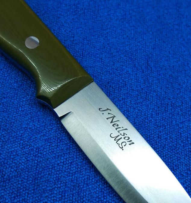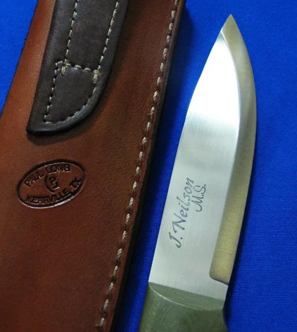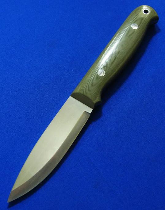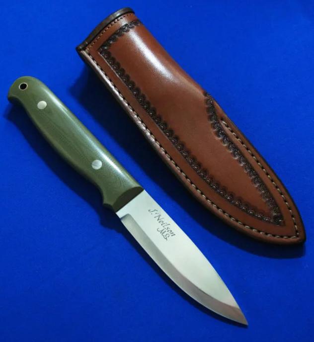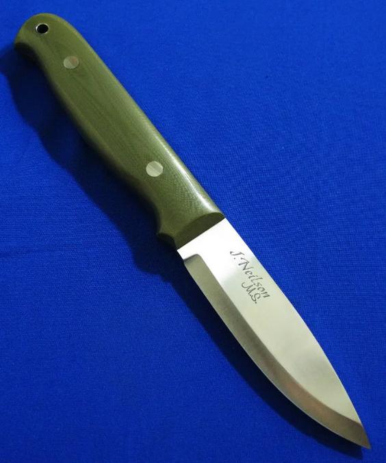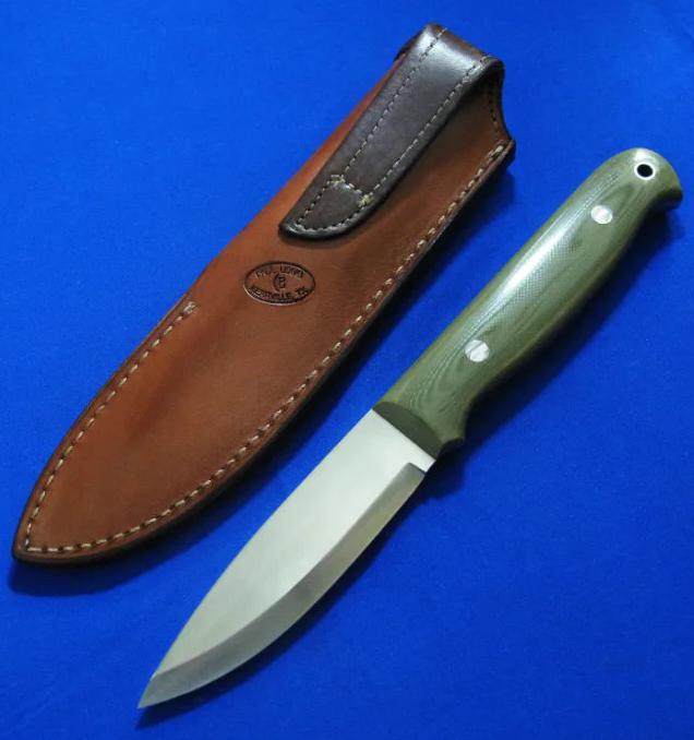 大师Neilson尼尔森 Bushcraft手工小直。 配Paul Long保罗.龙(皮具界的大师)手工皮鞘。全长:22.3cm。 刃厚:4.2mm。 刃材:52100。硬度:60-62。 柄材:G10。 鞘材:牛皮。产地:美国。