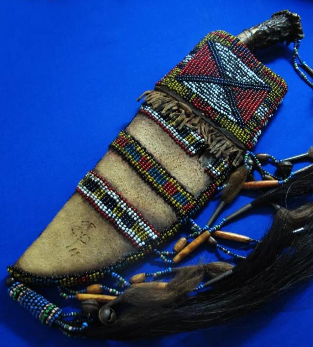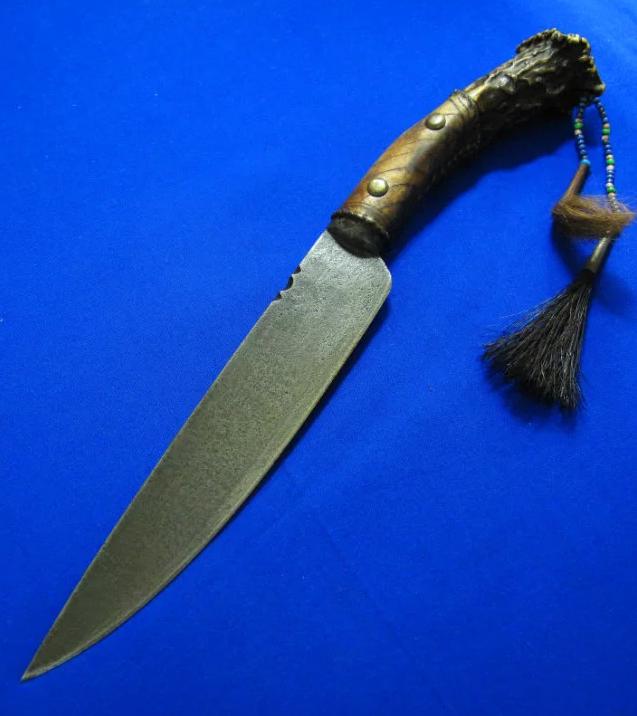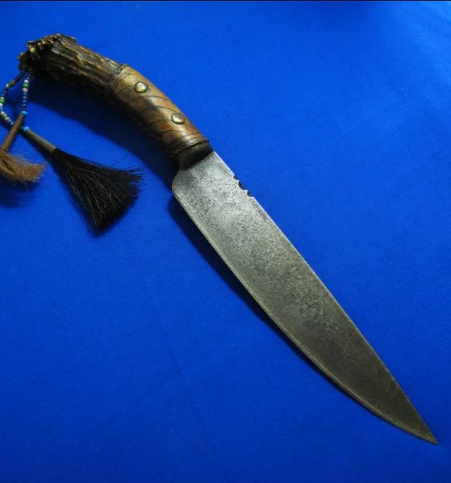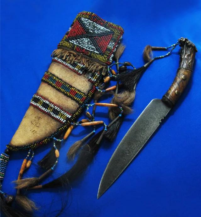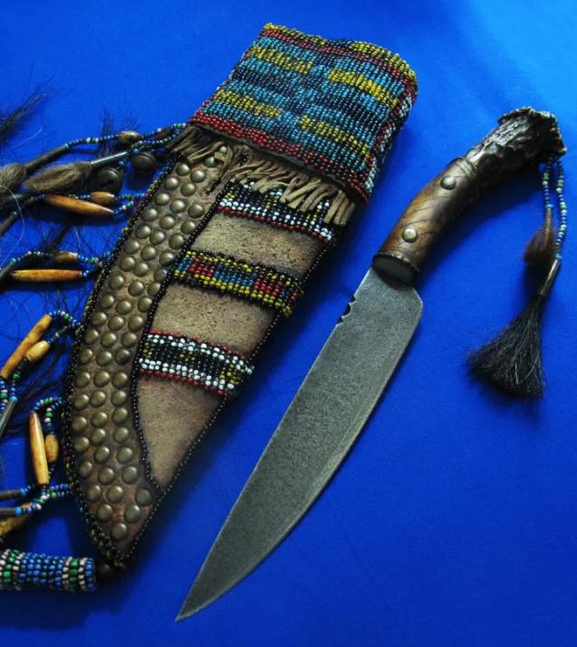 大师Taigoo手工 印第安原住民风格猎刀“屠狼”。传奇刀匠Taigoo是目前大师级刀匠里面硕果仅存的坚持印第安原始风格及制作工艺的唯一人。以前本来还有Winkler与Taigoo并称印第安双雄,但现在Winkler已转做战术风格的量产刀具,留下Taigoo孤军作战,独自一人与整个时代抗衡,这无形中更加剧了原住民文化保护者们对Taigoo的膜拜,尊奉其为“新世纪的末代英雄”。 全长:31.8cm。 刃厚:4mm。 刃材:52100锻打。 硬度:60-62。 柄材:野驯鹿角+野狼皮+野马鬃+野狼鬃+黄铜钉+琉璃珠。 鞘材:野水牛皮+野麂子皮+野狼骨+野狼鬃+野马鬃+铃铛+琉璃珠。 产地:美国。