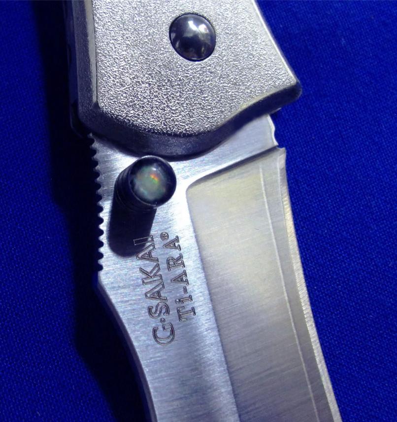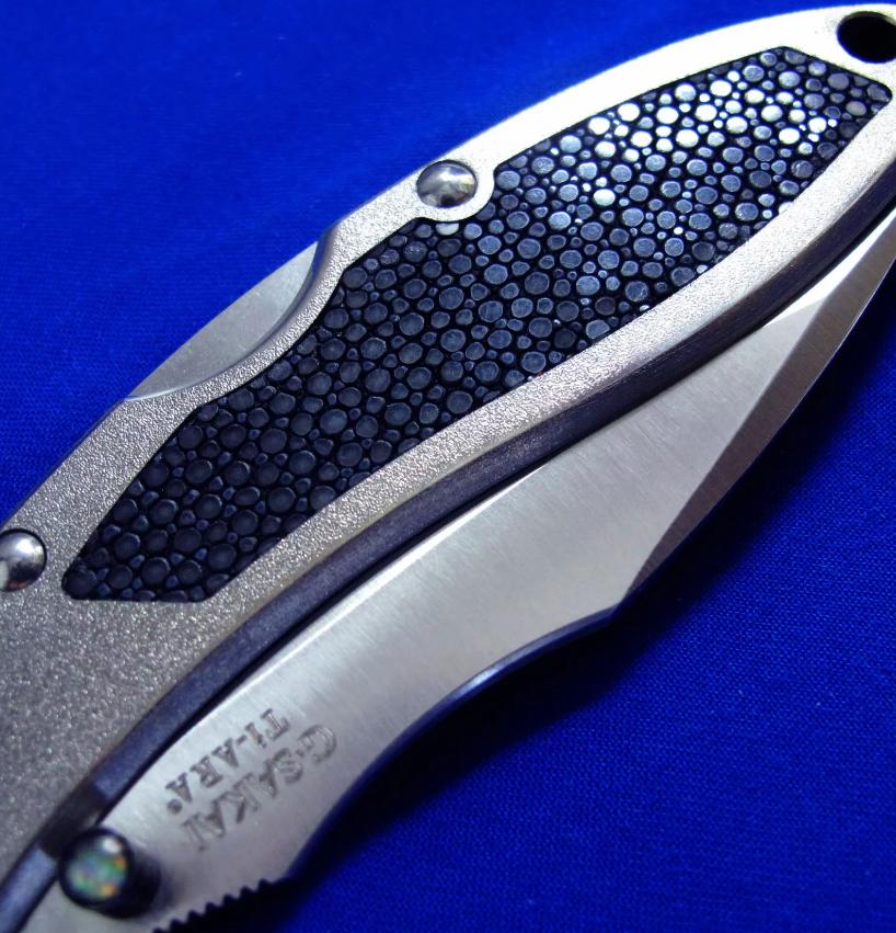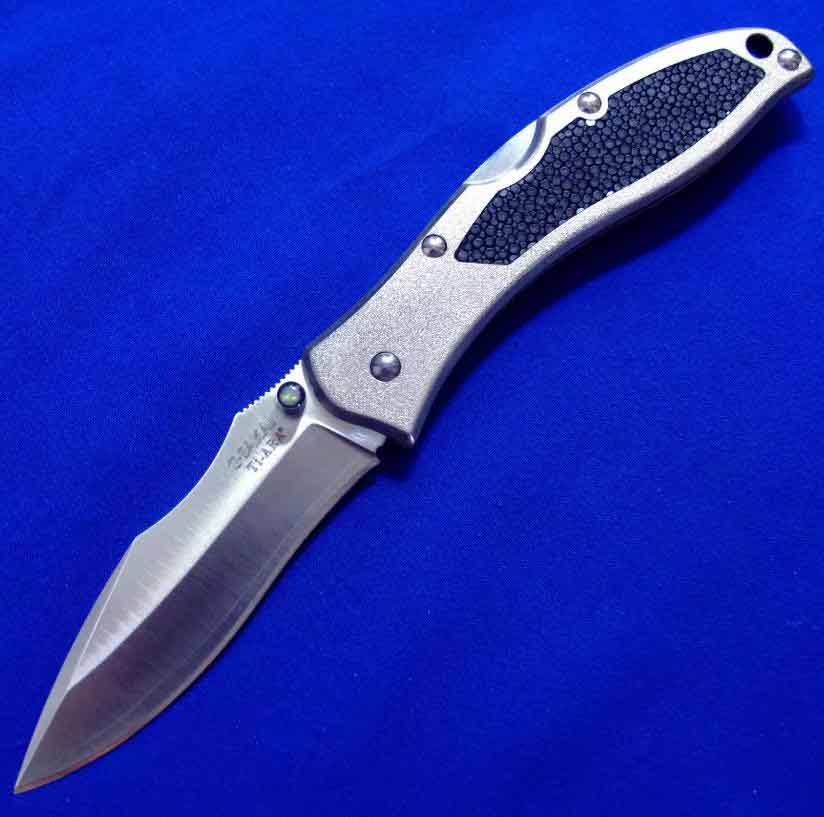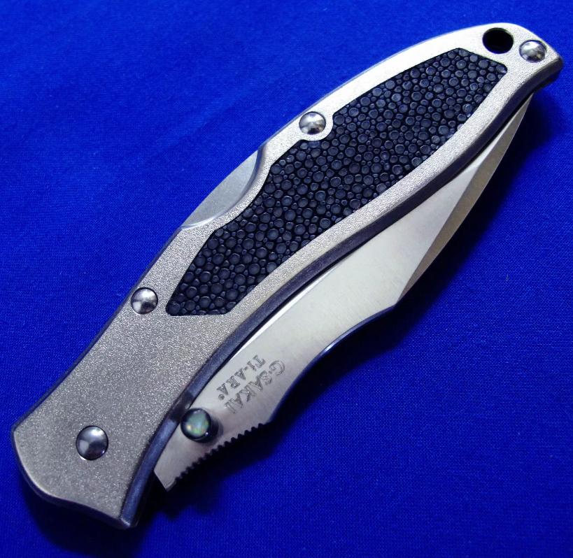 柄材:钛合金镶嵌魟鱼皮,推刀钮镶嵌鲍鱼贝。