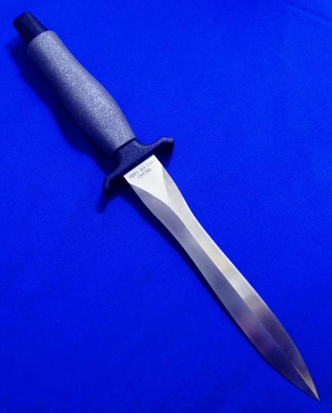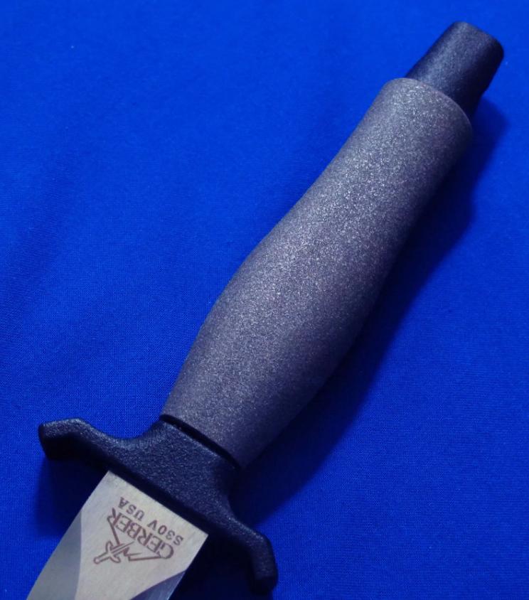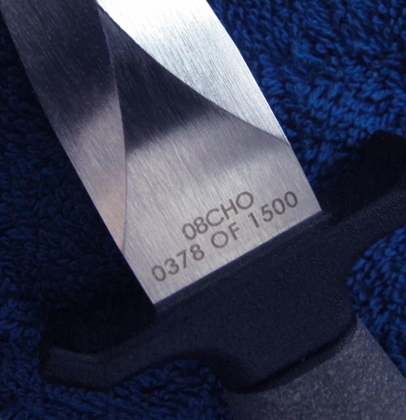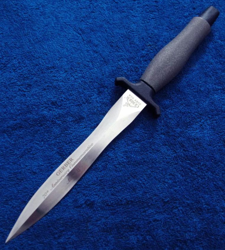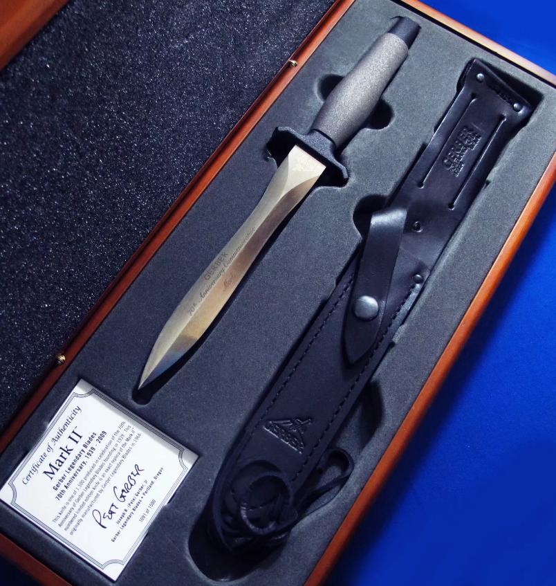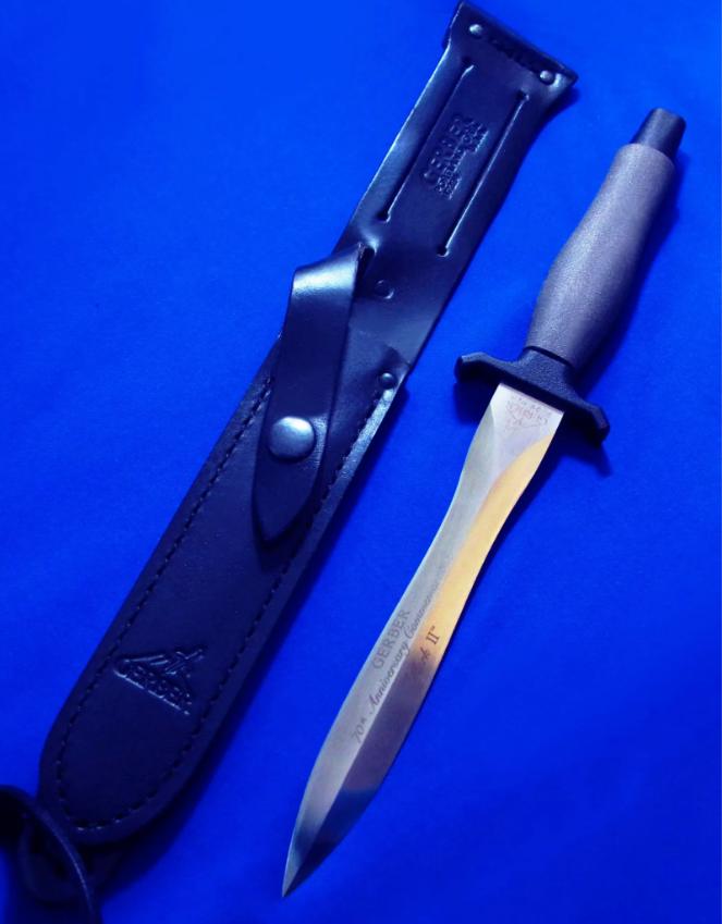 戈博 戈博 MARK II 70周年限量纪念版(已绝版,亦是MARK II的顶配版本)。全长:30.5cm。刃厚:6mm。刃材:S30V。硬度: 60-62。柄材:T6 6061。鞘材:牛皮。产地:美国。