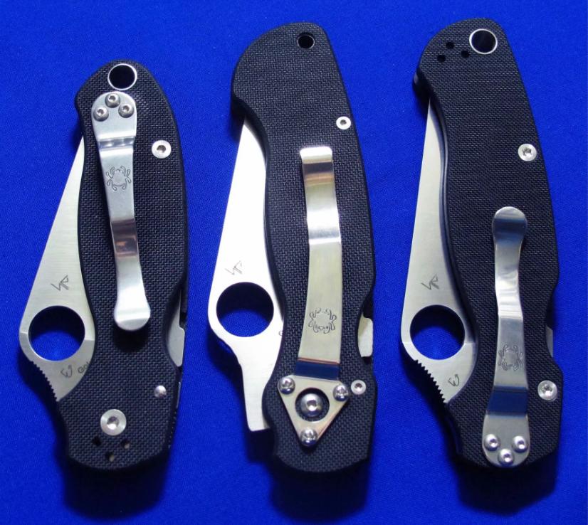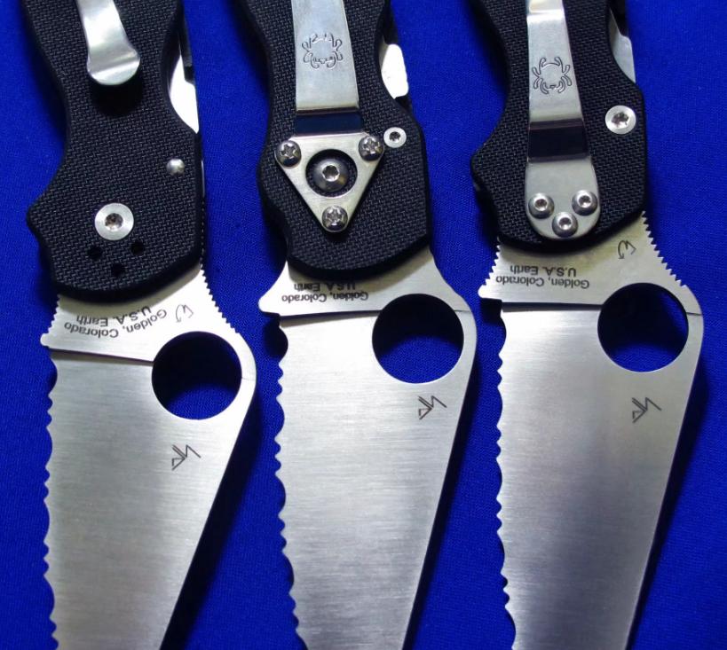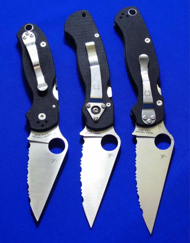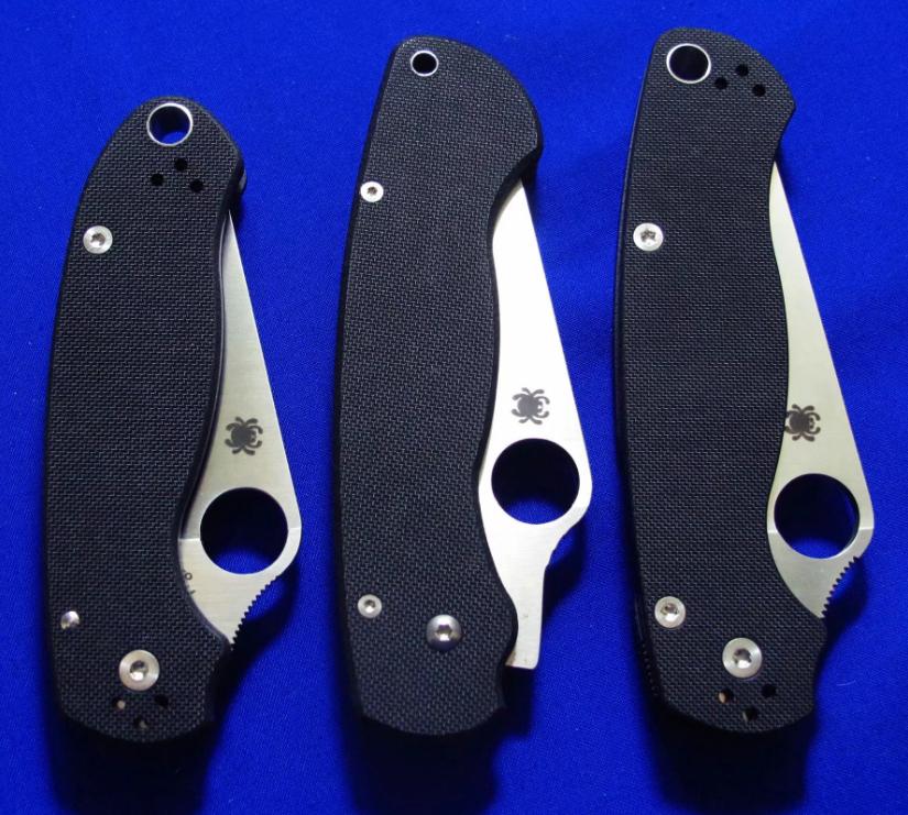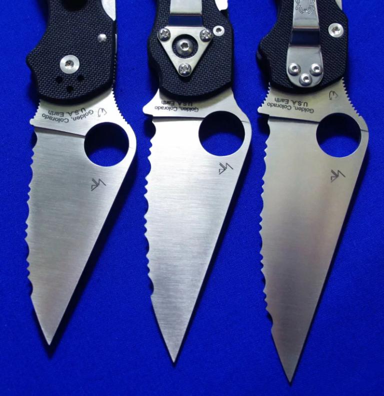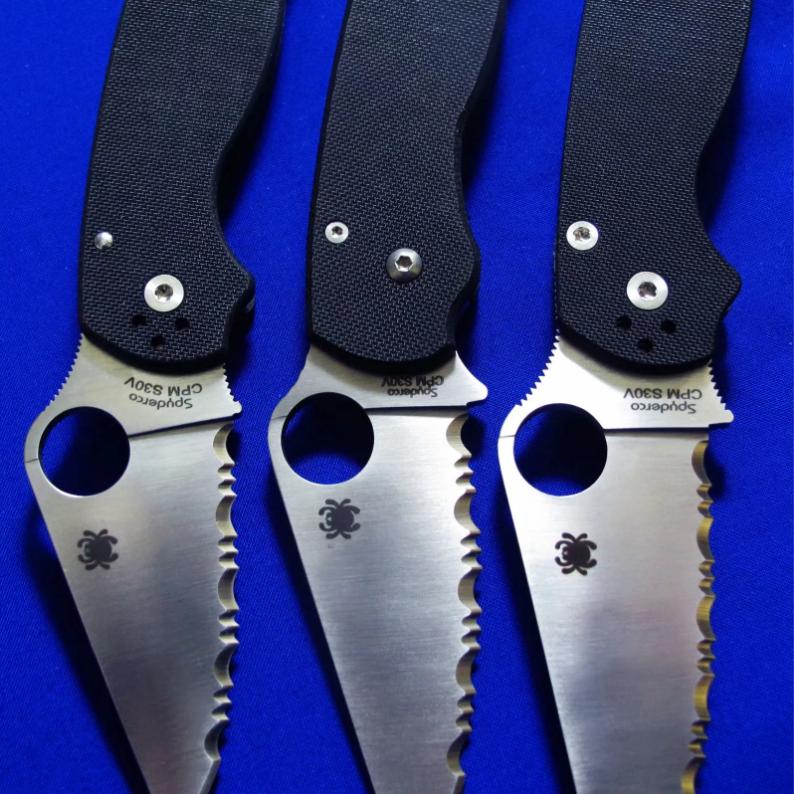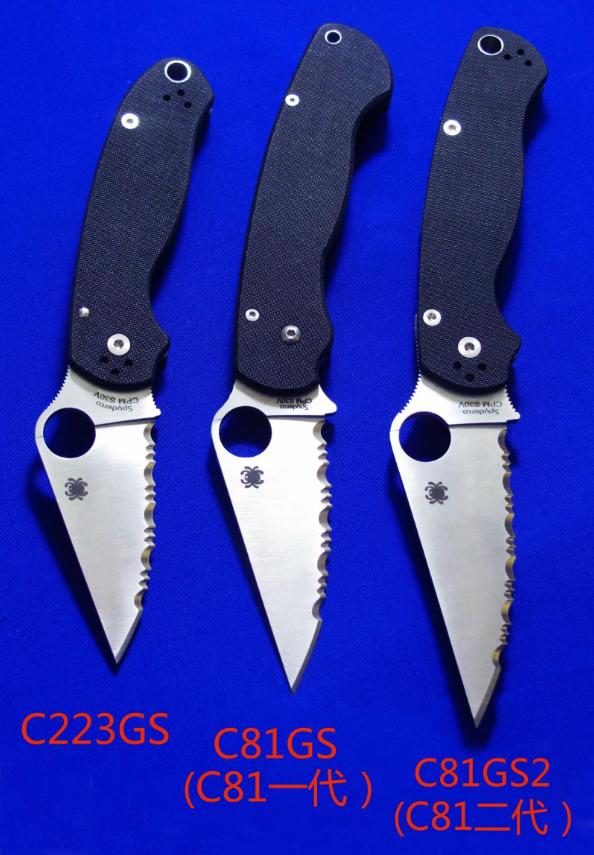 蜘蛛C81GS2(C81二代,右),C81GS(C81一代,中),C223GS(左)。其中C81GS(中)已绝版,非常稀有。全长:18.4(左)20.1(中)21.2(右)cm。刃厚:3.8mm。刃材:CPM S30V。硬度:60-62。柄材:G10。产地:美国。
