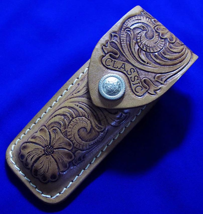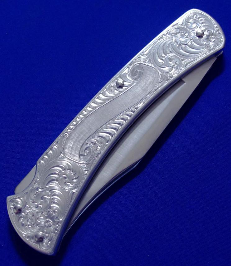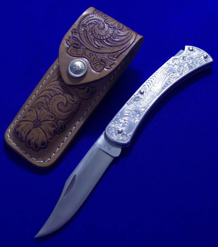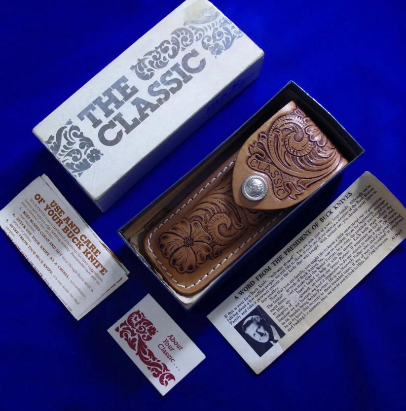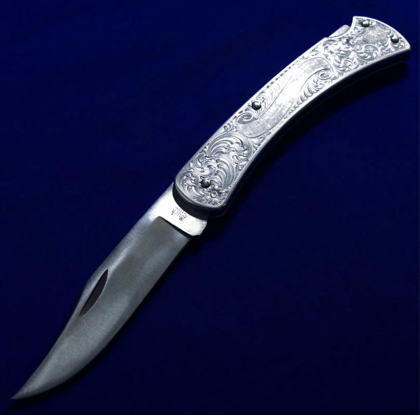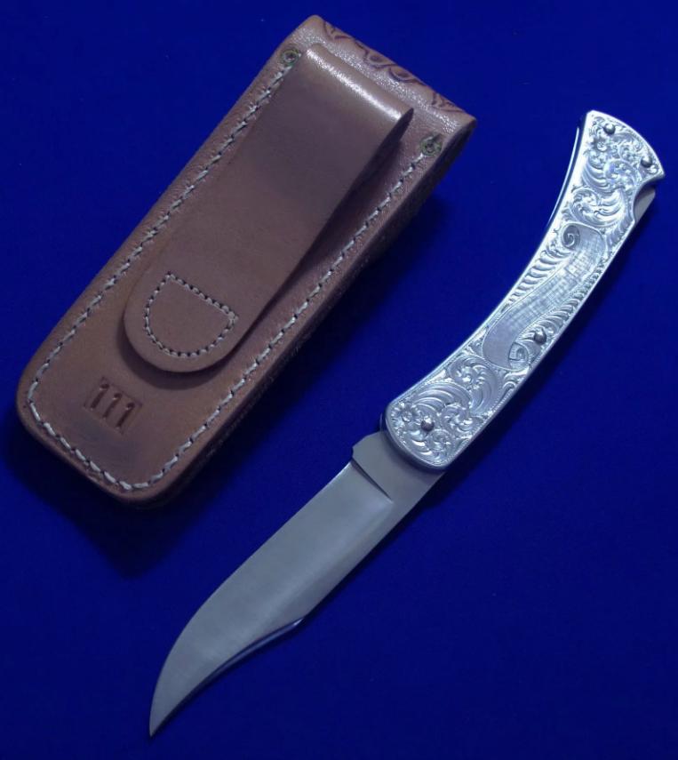 BUCK 1981年 Classic 111 收藏版古典雕花折刀,已绝版,极稀有。全长:21.8cm。刃厚:3mm。刃材:425M(绝版钢材,巴克1981-91年间用的是425M钢)。硬度:60-62。柄材:铝。鞘材:手工雕花牛皮。产地:美国。