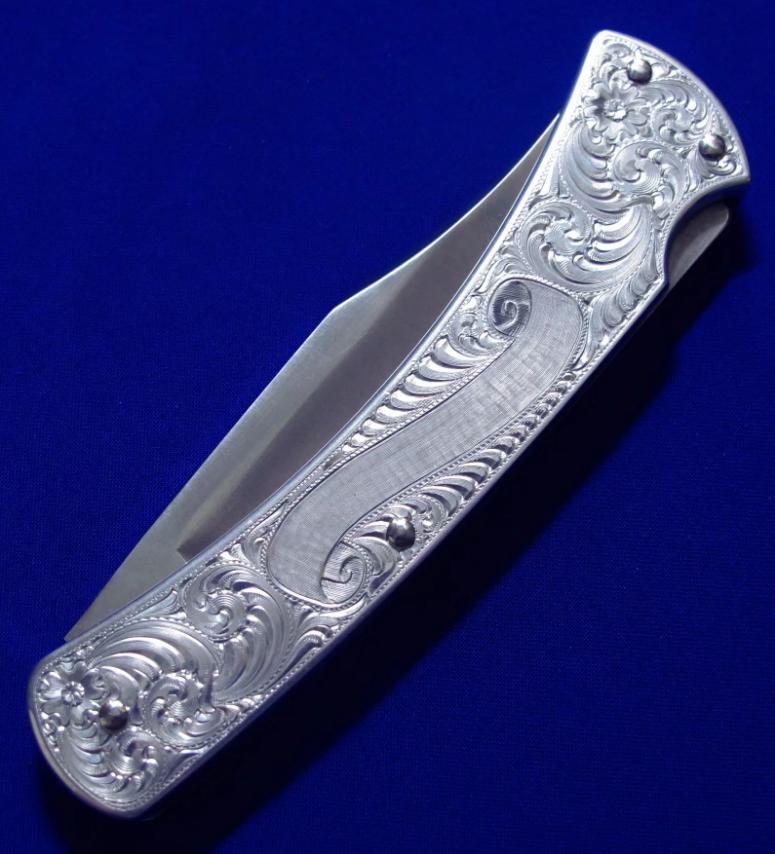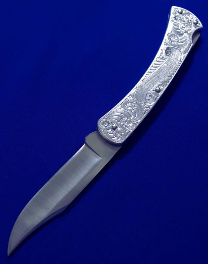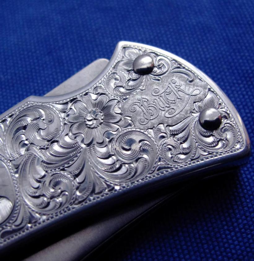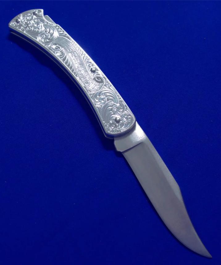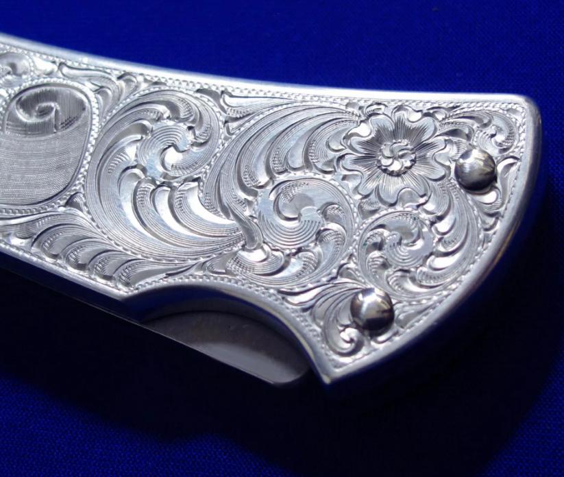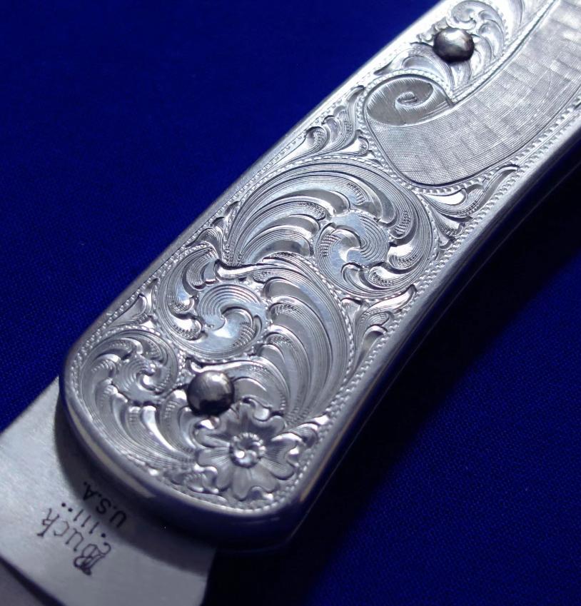 BUCK 1981年 Classic 111 收藏版古典雕花折刀,已绝版,极稀有。全长:21.8cm。刃厚:3mm。刃材:425M(绝版钢材,巴克1981-91年间用的是425M钢)。硬度:60-62。柄材:铝。鞘材:手工雕花牛皮。产地:美国。