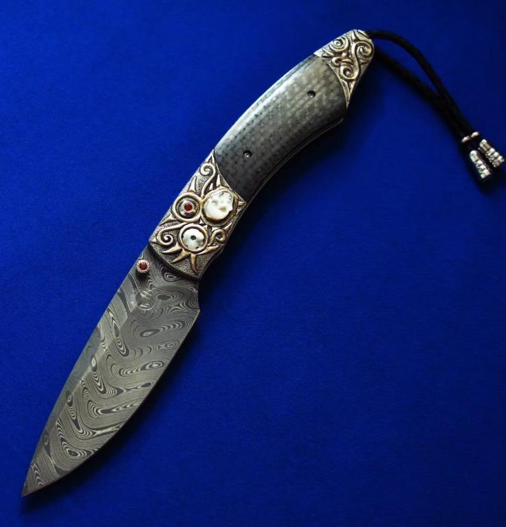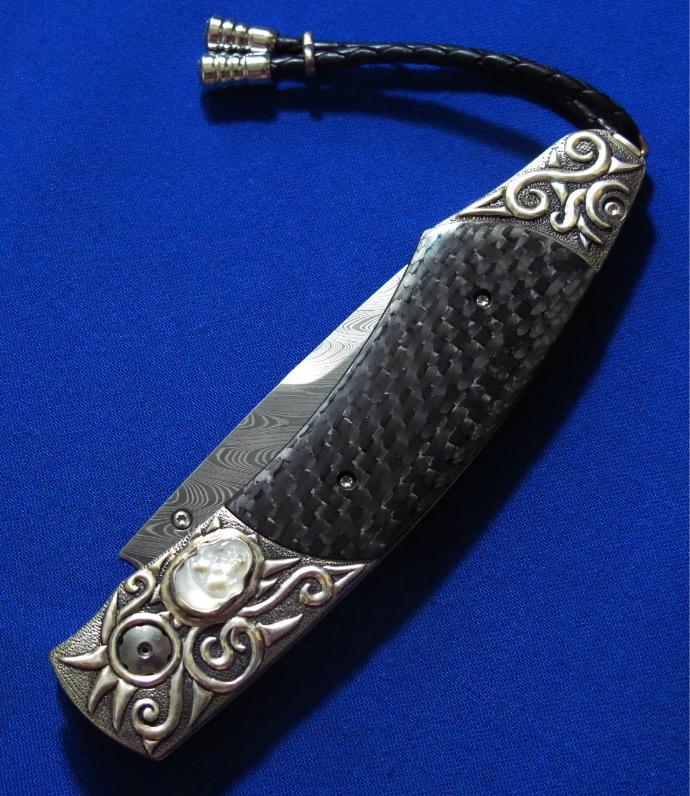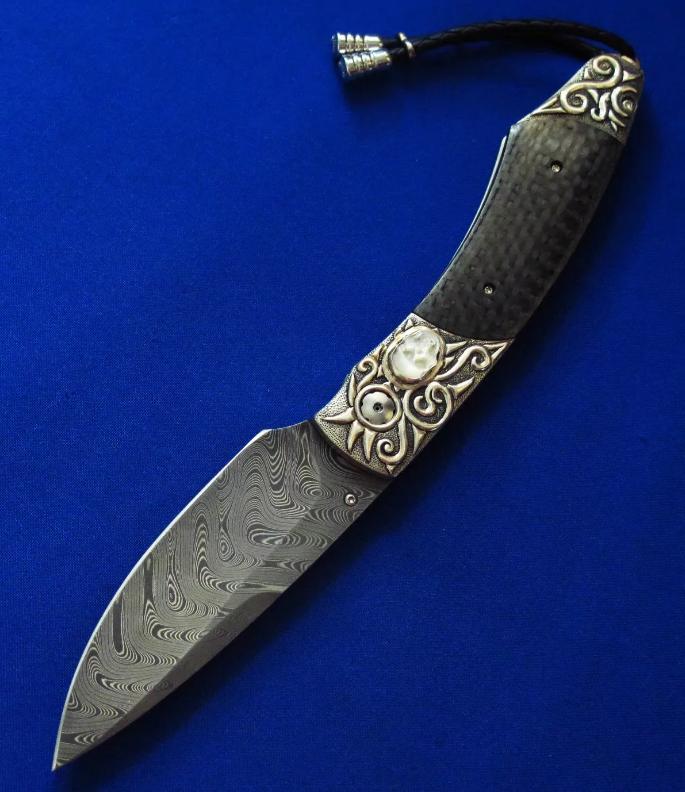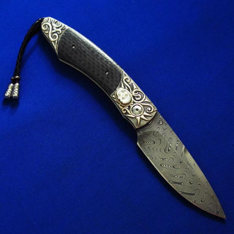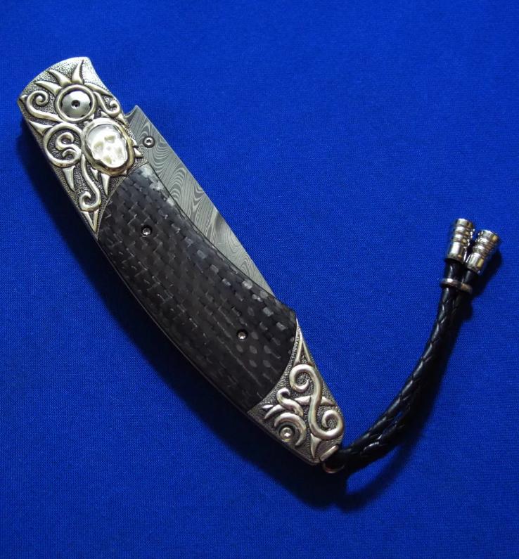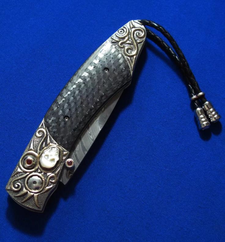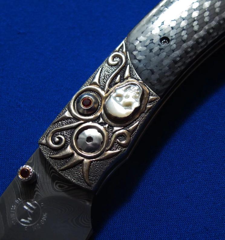 威廉亨利 大马士革 限量版 绅士折刀。全长:18.3cm。刃厚:2.2mm。刃材:大马士革。硬度:60-62。柄材:墨西哥银手工立体雕刻,镶嵌白玉雕刻骷髅头,开刀钮及解锁按钮镶嵌红宝石。碳纤维贴片。产地:美国。