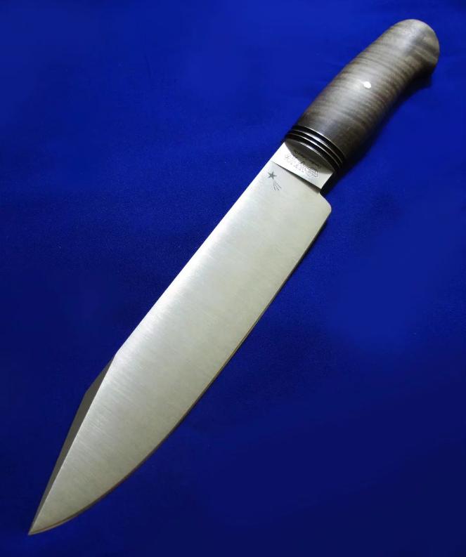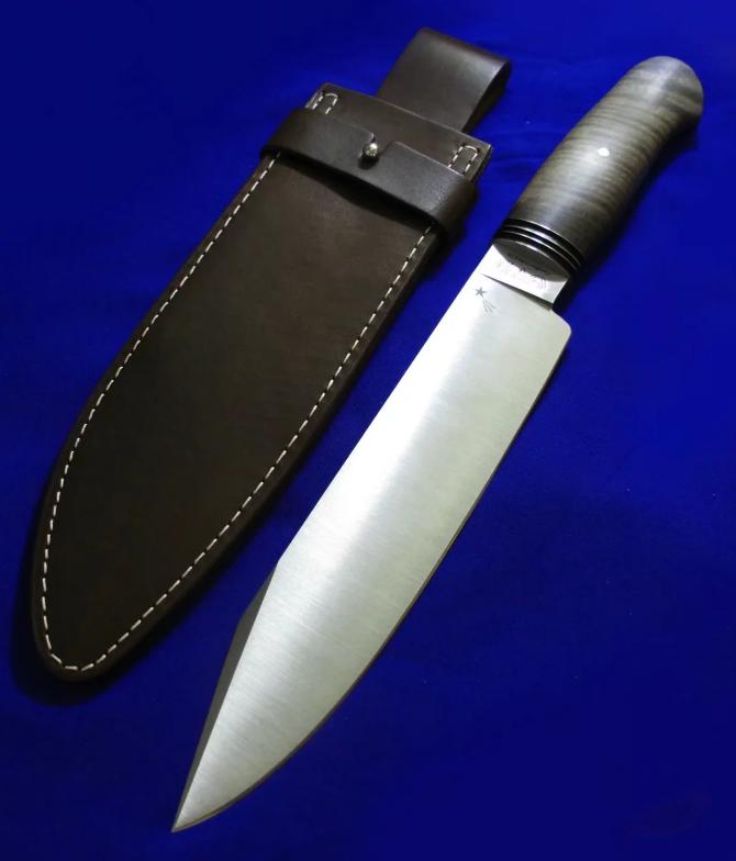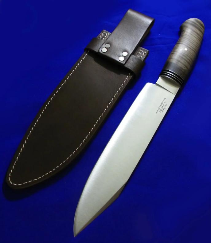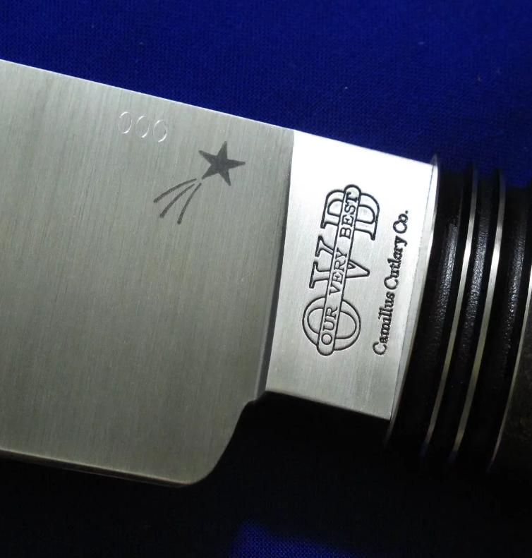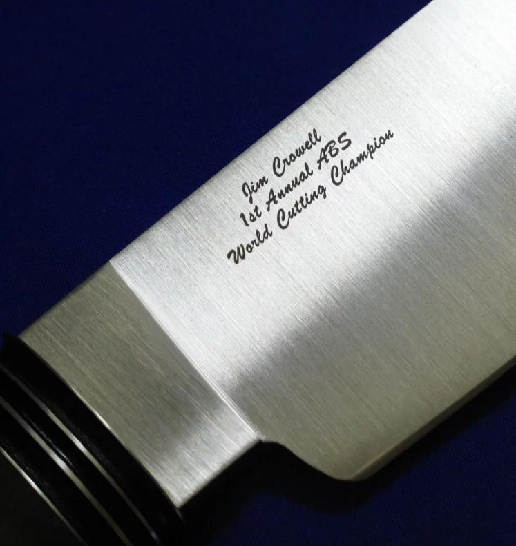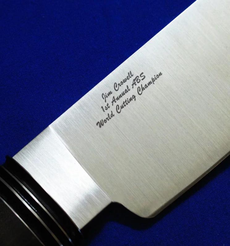 000号原型刀。大师 Jim Crowell(ABS MS级,累计11次世界劈砍大赛总冠军得住)& 卡米卢斯 OVB 限量合作:纪念美国ABS刀匠协会第一届世界劈砍大赛冠军刀(卡米卢斯将Crowell的冠军刀做成限量纪念版,本只为编号000的原型刀,孤品唯一)。全长:38.2cm。 刃厚:7mm。 刃材:CARBON V。 硬度:60-62。 柄材:虎纹枫。 鞘材:牛皮。 产地:美国。