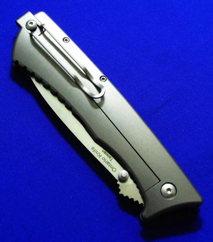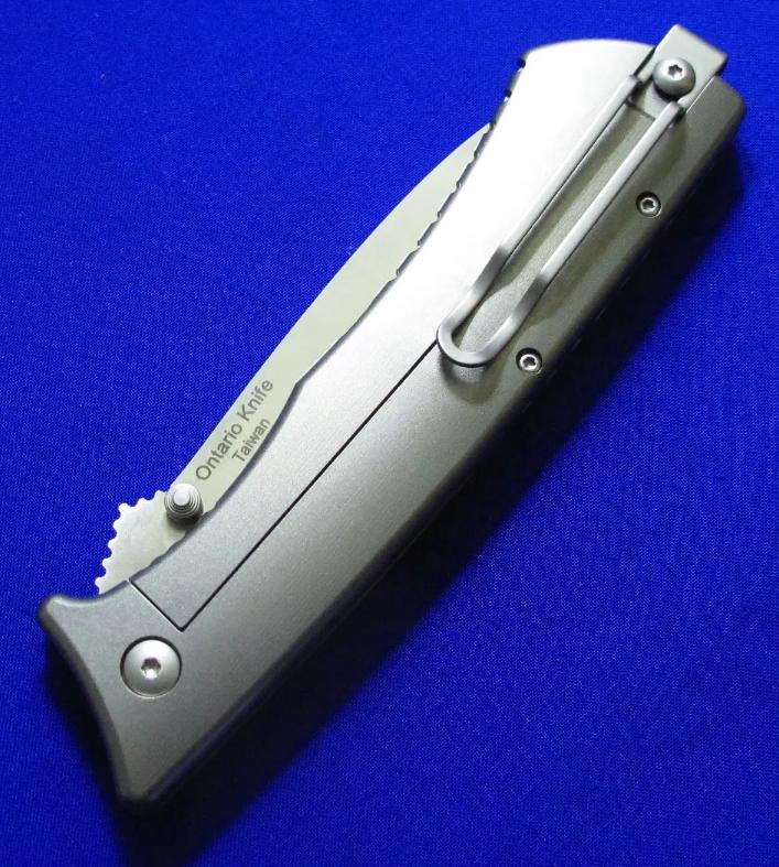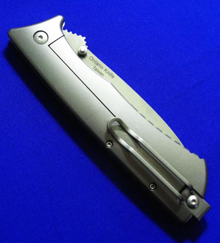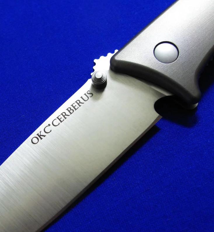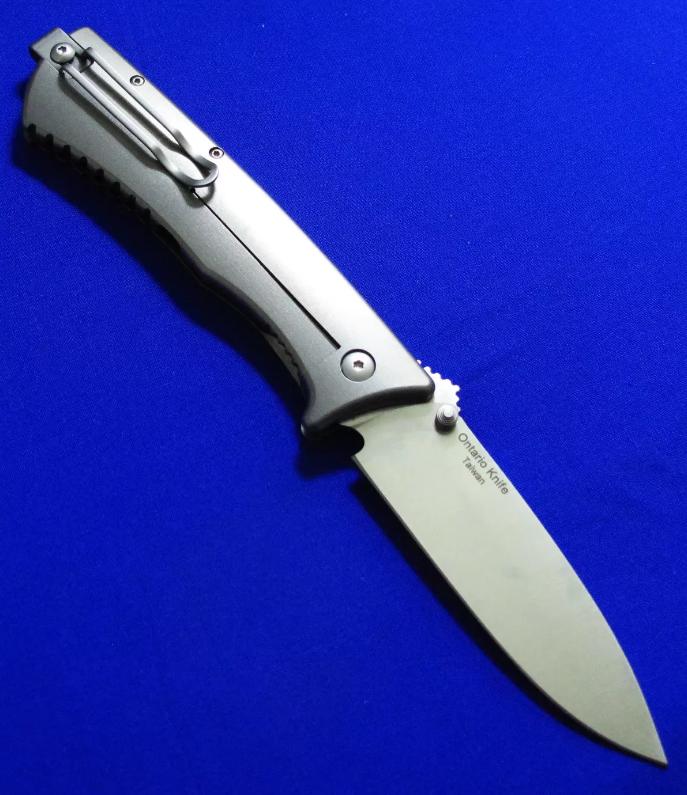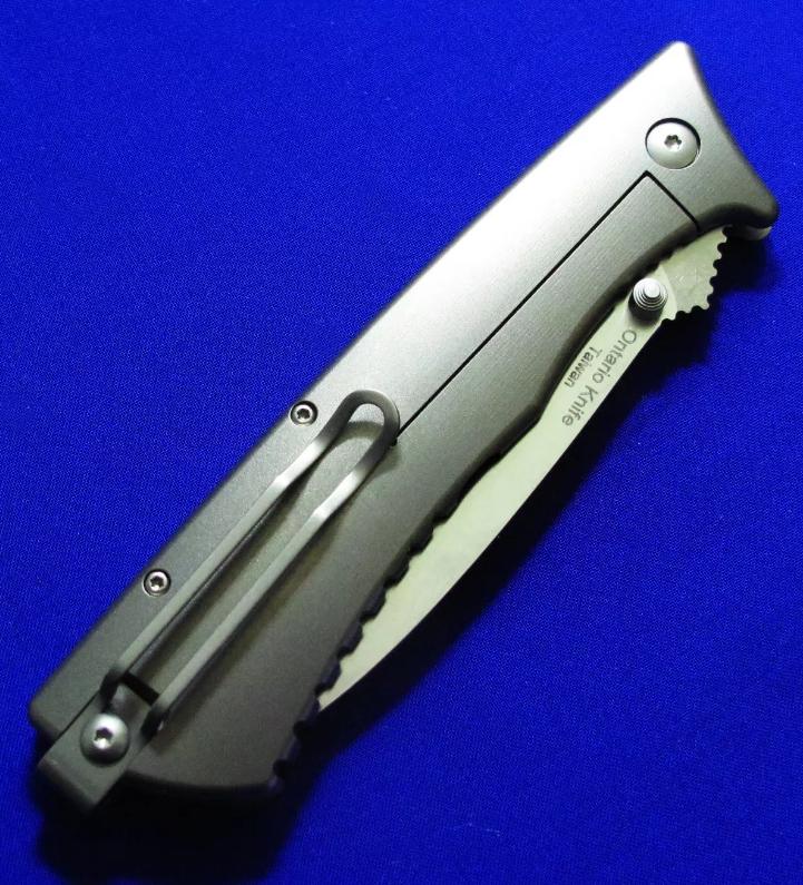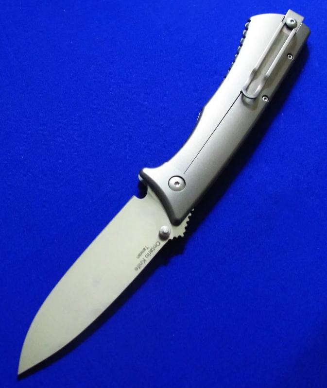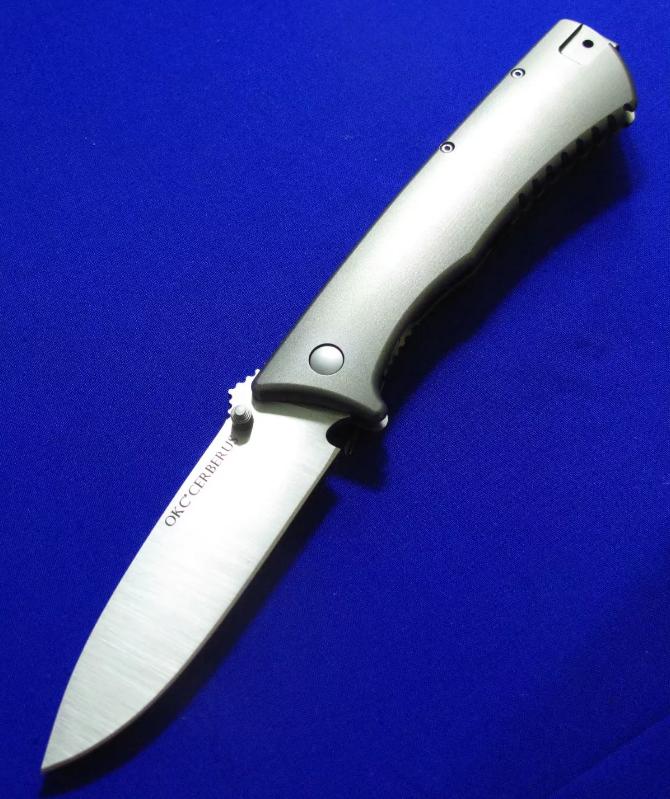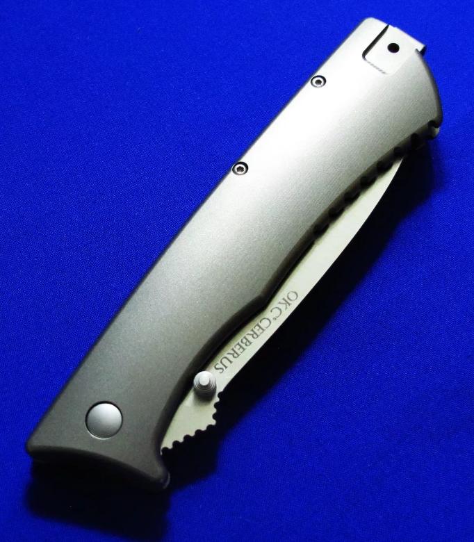 安大略 Cerberus 地狱犬 全钛柄重折。这是安大略首款进军高品质折刀的产品,做工很好(不比蝴蝶差),全钛柄,框架锁。全长:23.3cm。刃厚:3mm。刃材:D2。硬度:60-62。柄材:钛合金。产地:台湾。