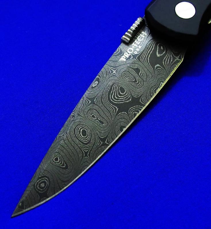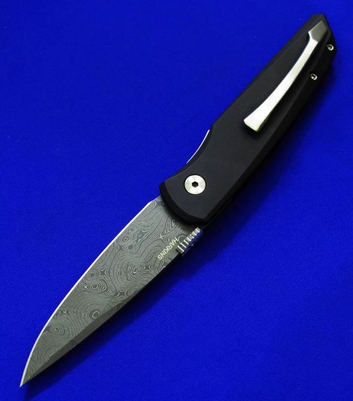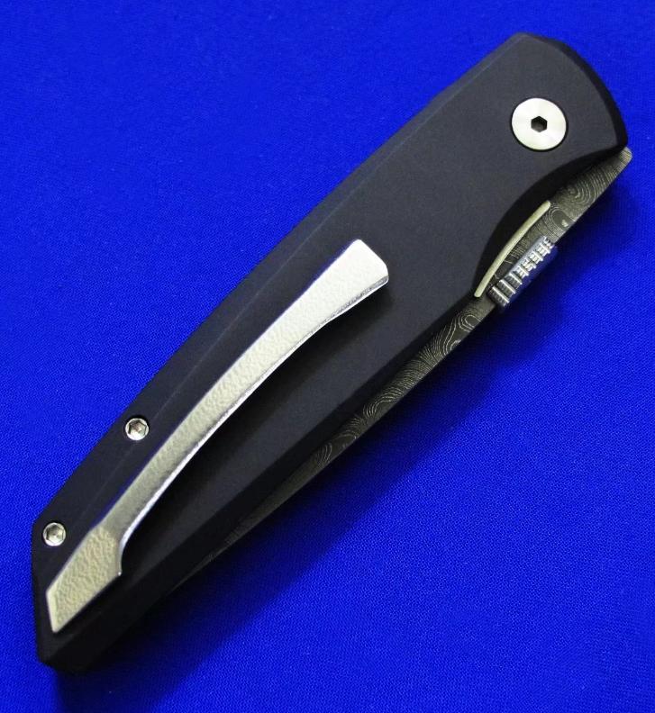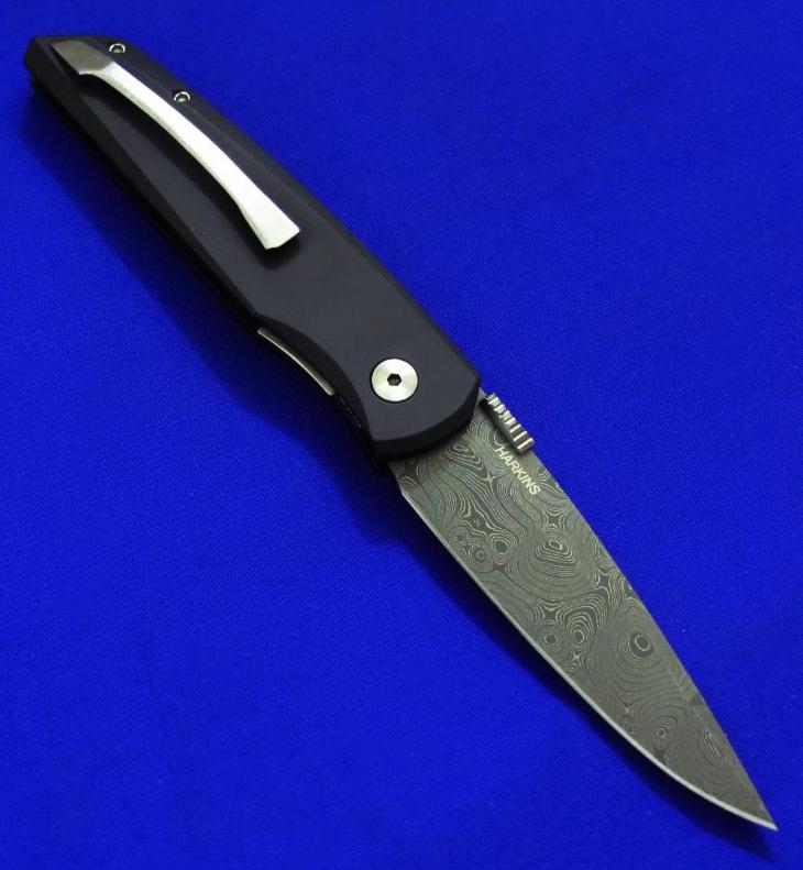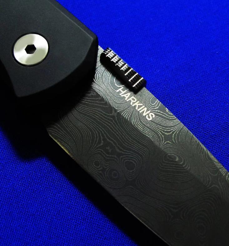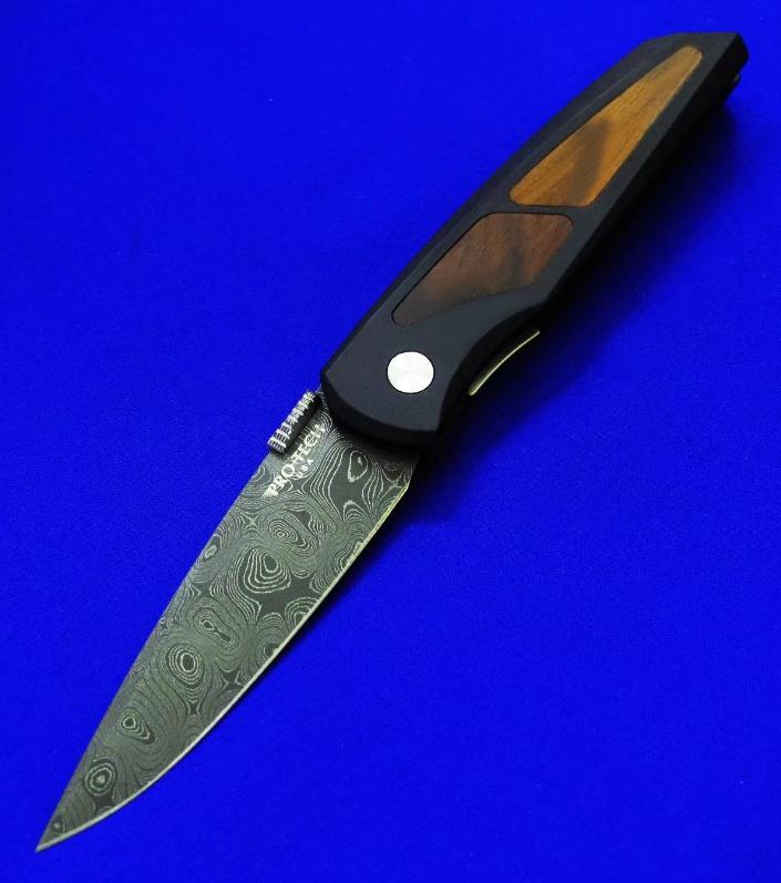 Protech超技术 全球限量版 Harkins哈金斯 大马士革 双动折刀。既可手动开启,也可全自动侧跳(见图4)。全球30支,本支编号22。全长:20.1cm。刃厚:3mm。刃材:大马士革。硬度:60-62。柄材:枫木,T6 6061,钛合金3D立体背夹。产地:美国。