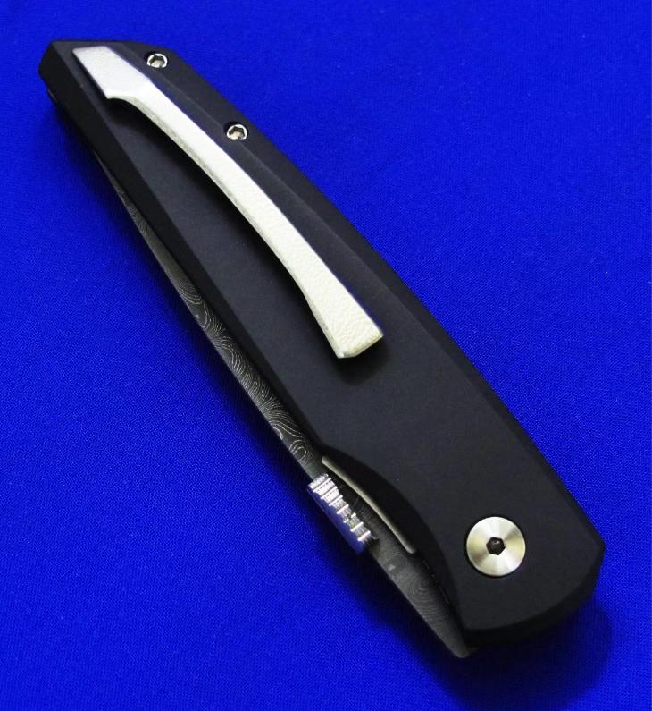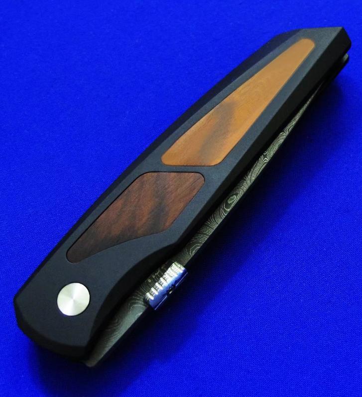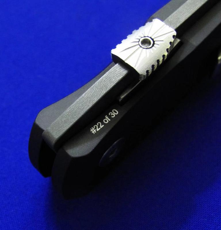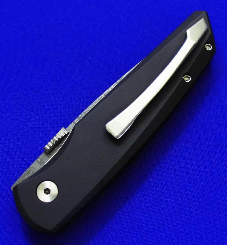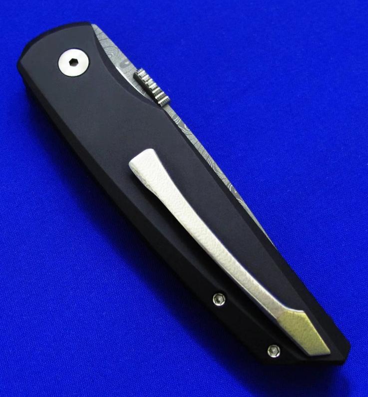 Protech超技术 全球限量版 Harkins哈金斯 大马士革 双动折刀。既可手动开启,也可全自动侧跳(见图4)。全球30支,本支编号22。全长:20.1cm。刃厚:3mm。刃材:大马士革。硬度:60-62。柄材:枫木,T6 6061,钛合金3D立体背夹。产地:美国。