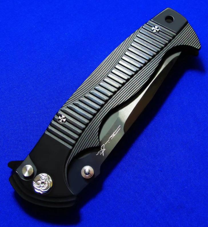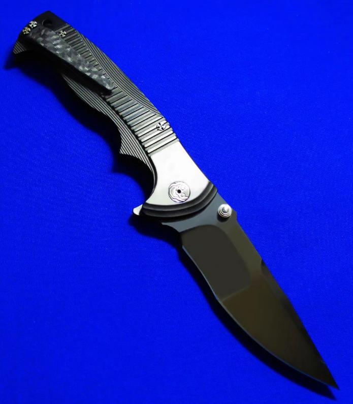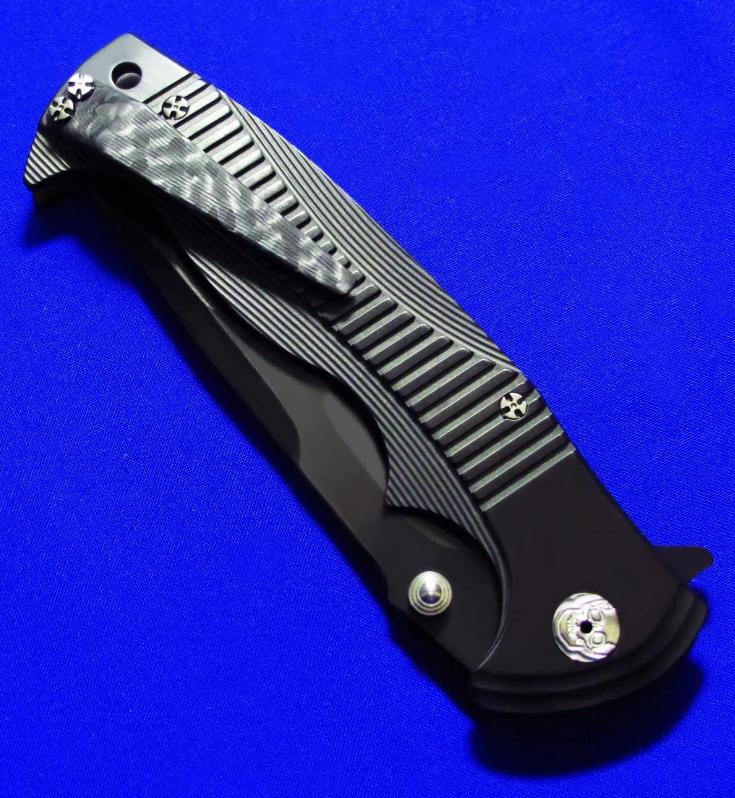 Brian Tighe 布莱恩.泰(加拿大刀匠协会现任主席)Flipper快开 顶级手工折刀。两种开刀方式,既可Flipper快开,也可传统(推刀钮)手动开启。 通体DLC钻石涂层。全长:23.3cm。 刃厚:4mm。 刃材:瑞粉RWL34+DLC钻石涂层。硬度:60-62。柄材:手柄钛合金+DLC钻石涂层,碳纤维背夹,主轴雕刻骷髅。产地:加拿大。
