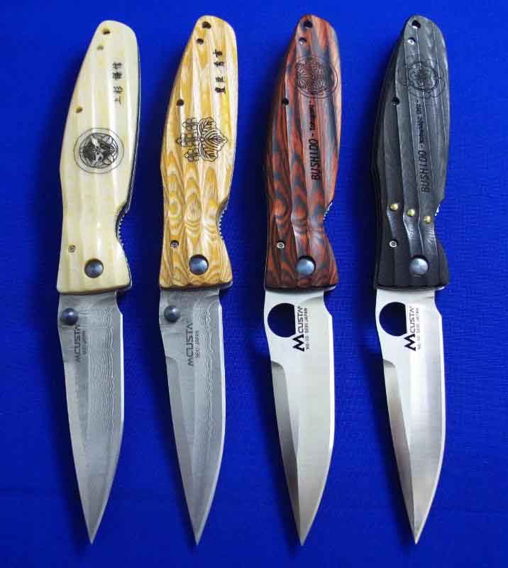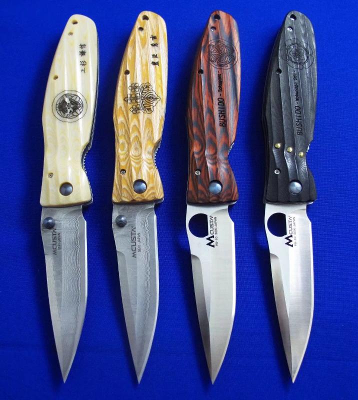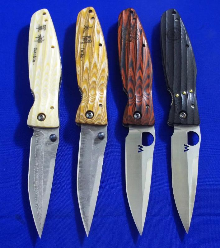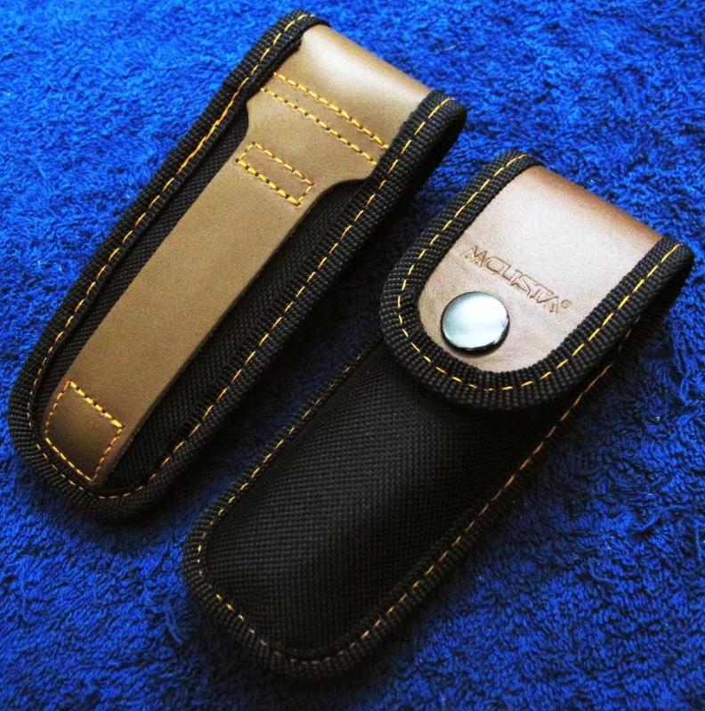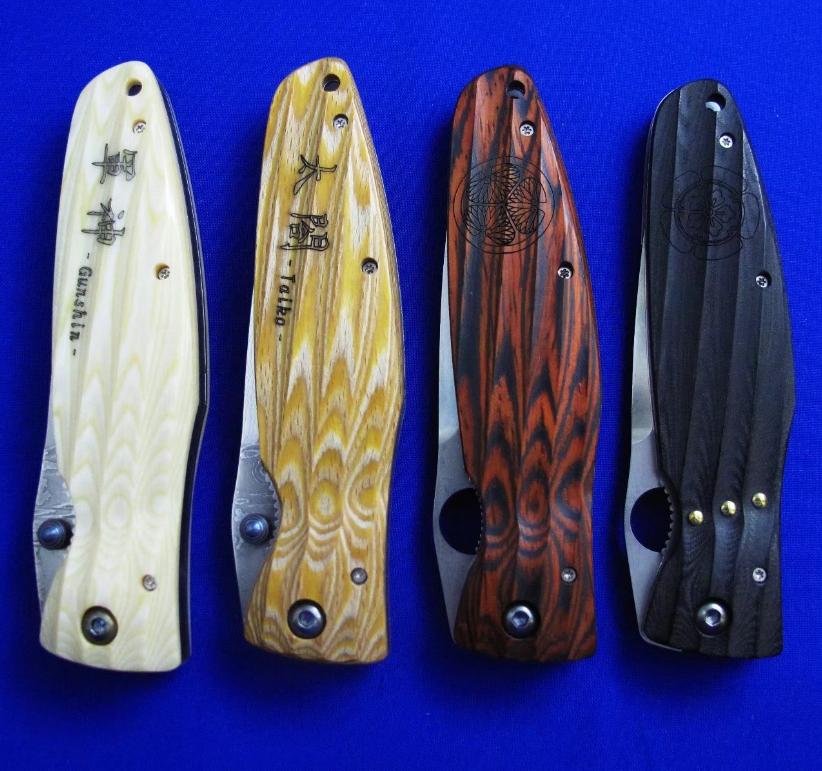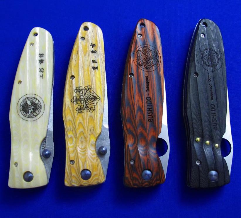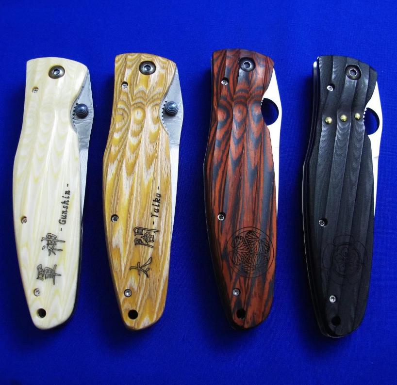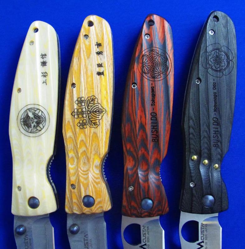 传世家徽 绅士折刀。 全长:21.1cm。 刃厚:3mm。 刃材:大马士革(左1、2)VG10(右1、2)。 硬度:60-62。 柄材:G10(右1)耐力木(右2、3)电木(左1)。 鞘材:牛皮+Cordura。 产地:日本。