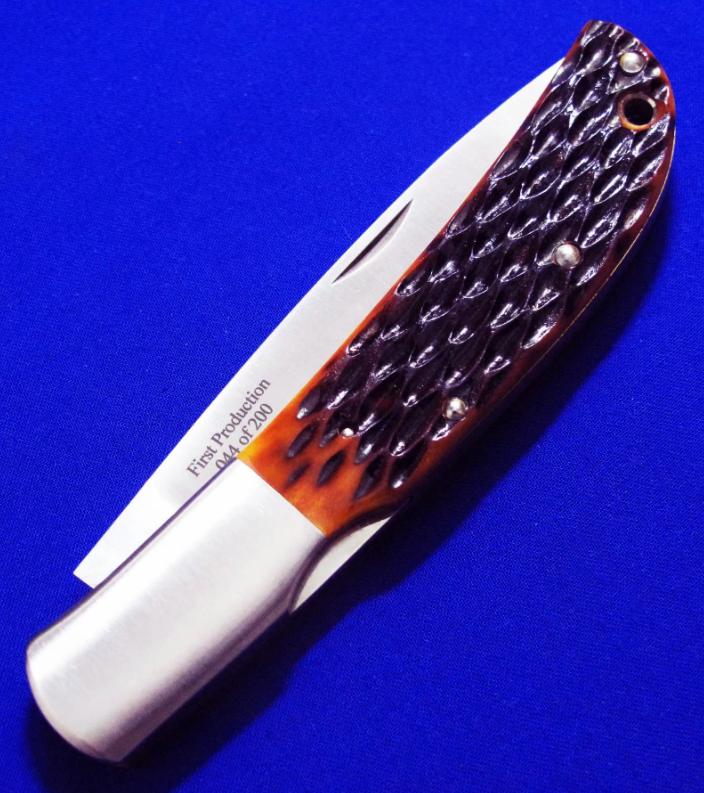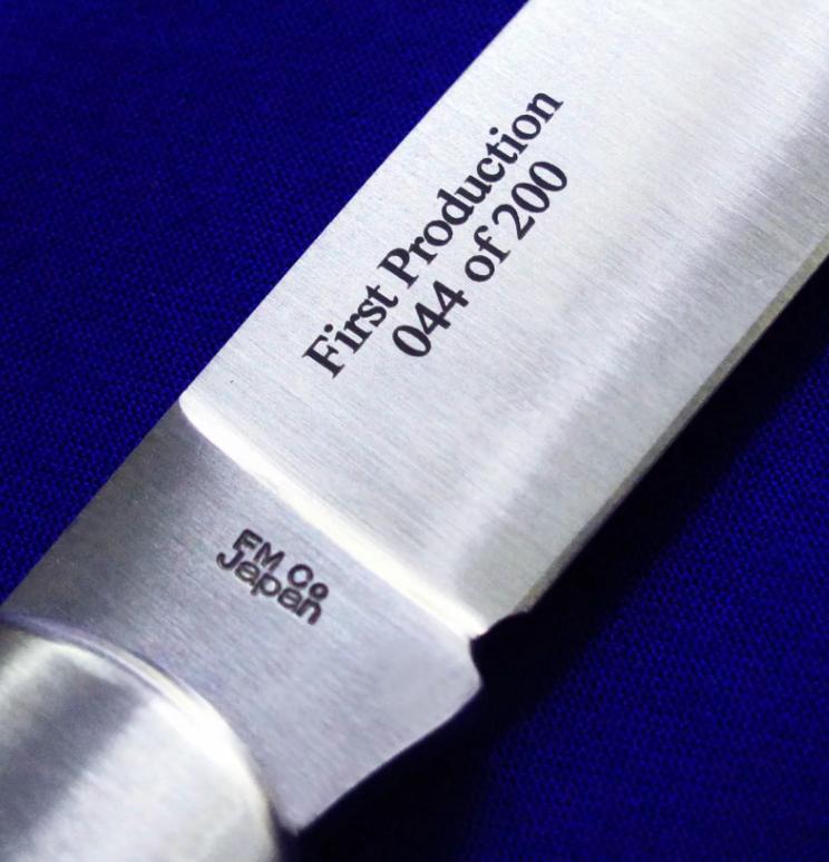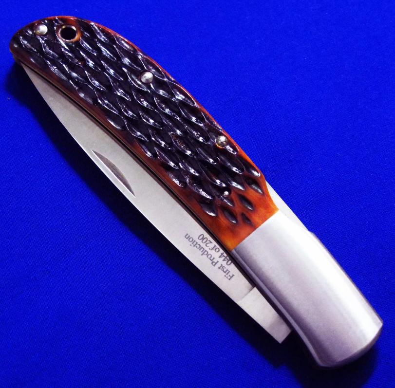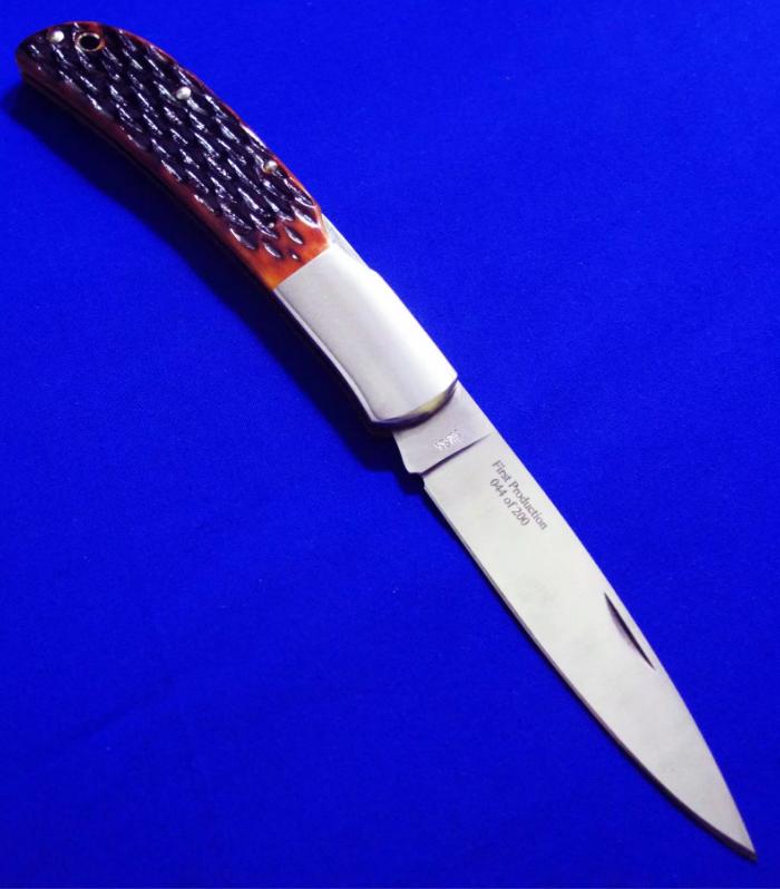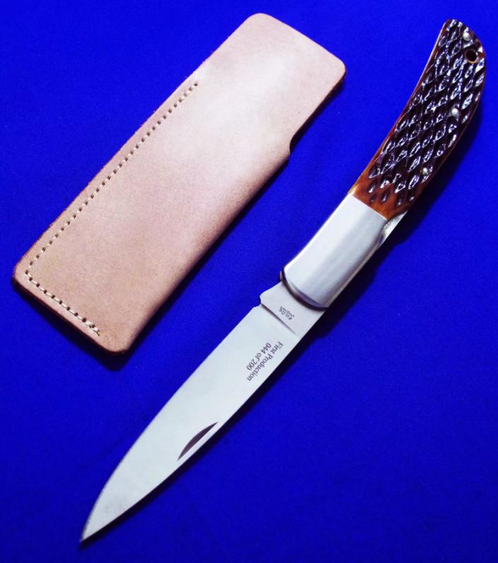 马国森 Eagle 经典绅士折刀 First Production(初版),大号顶配,限量版。 全长:22.2cm。 刃厚:2.8mm。 刃材:VG-10。 硬度:60-62。 柄材:沁色驼骨。 鞘材:牛皮。 产地:日本。