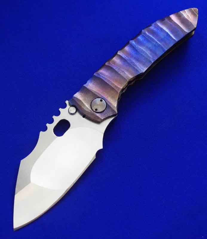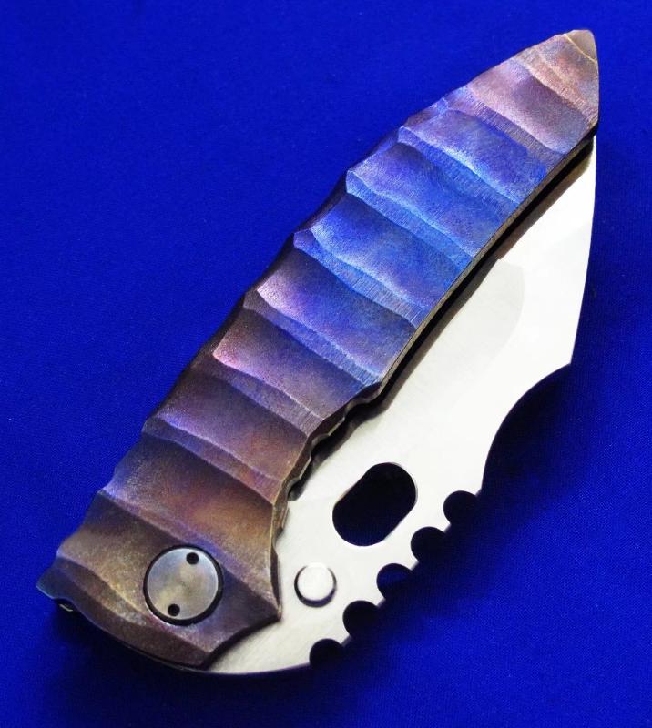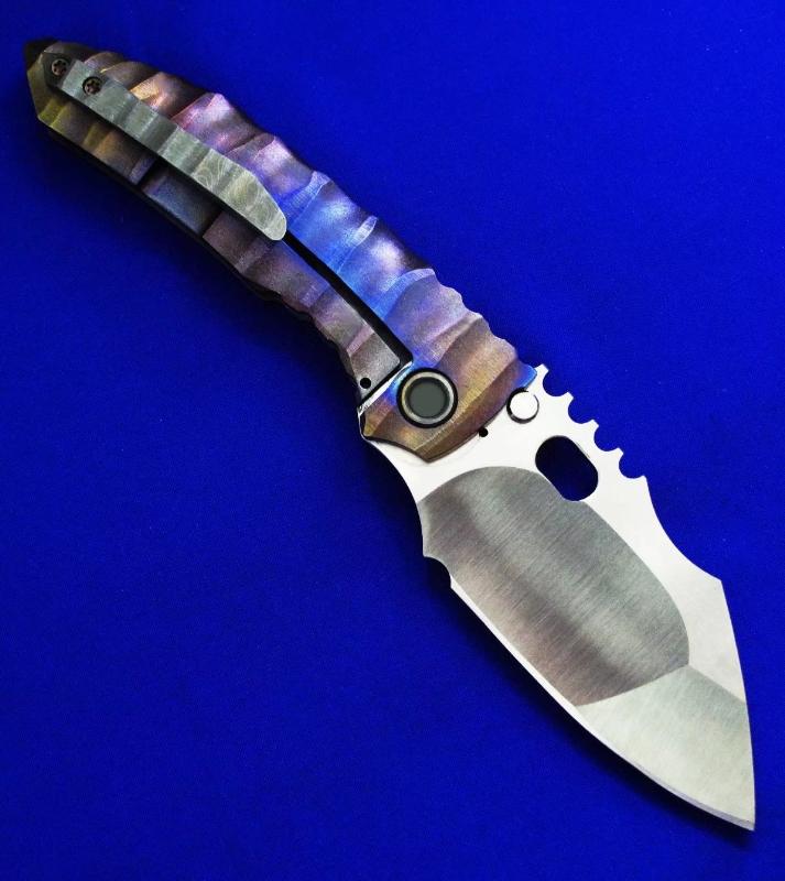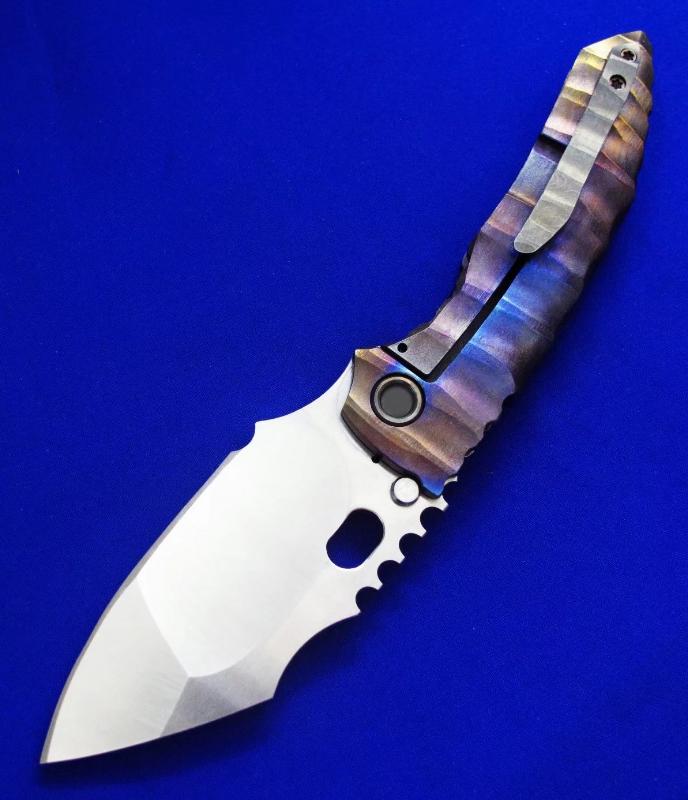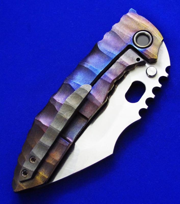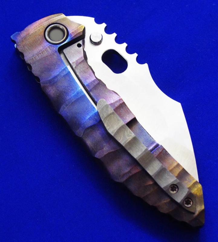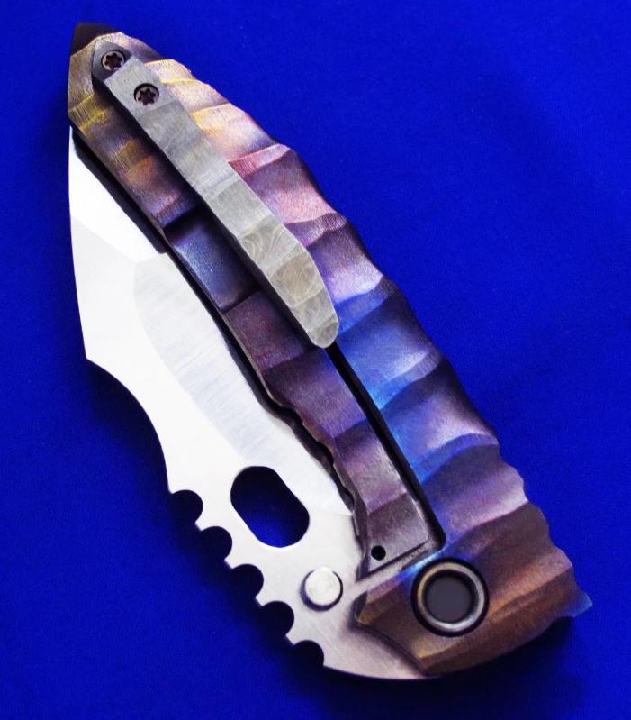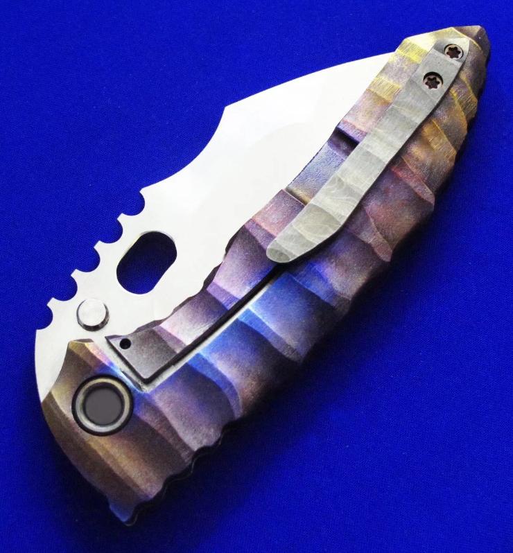 Dalibor 大力波 高端手工重折。一体结构钛柄(刀柄是一整块钛合金掏出来的,非贴片结构)。全长:22cm。刃厚:5mm。刃材:CPM 3V。硬度:60-62。柄材:钛合金(手柄)大马士革(腰夹)。产地:美国。
