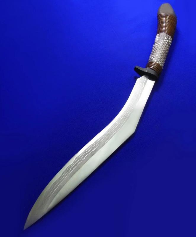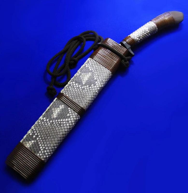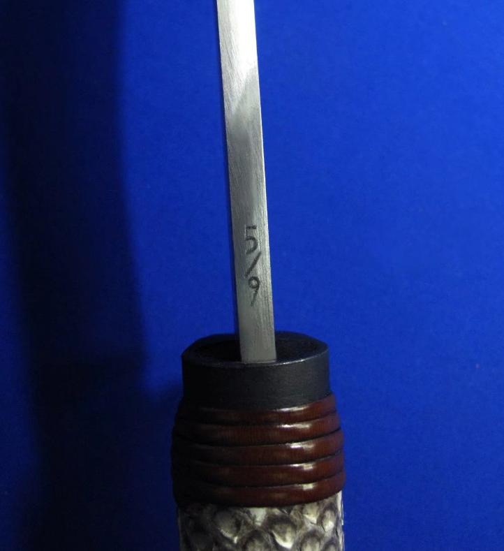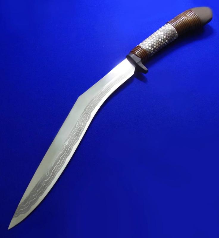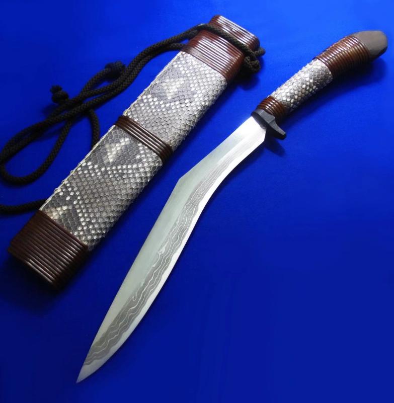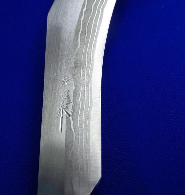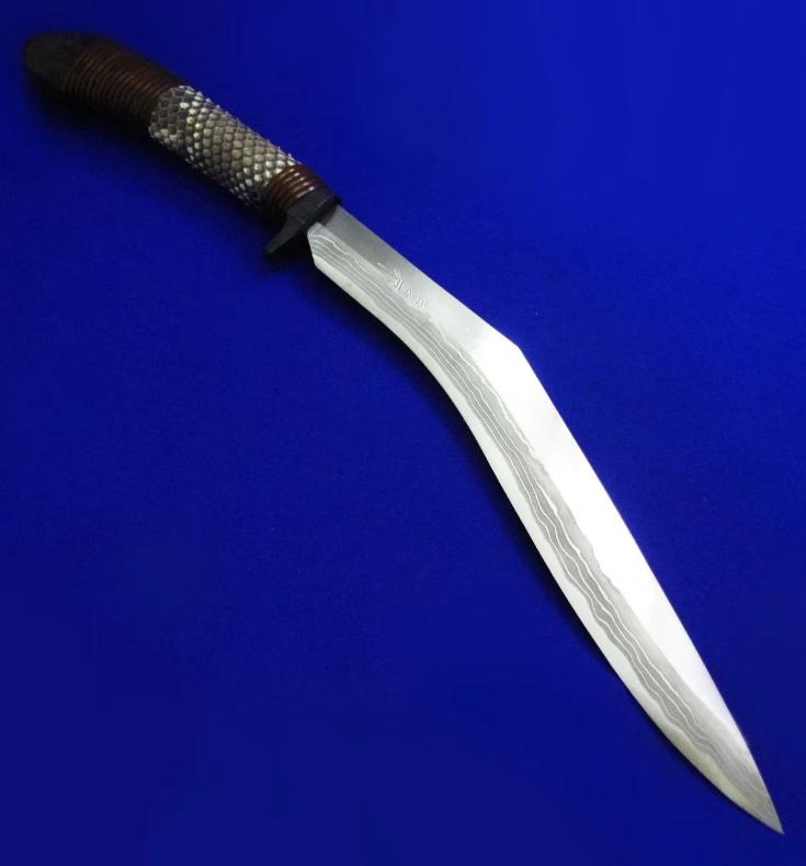 佐治武士 手工限量版 顶级旗舰系列 狗腿。 此限量系列一共只做了9套(每套6款),皆为旗舰大刀,此套编号5。因佐治年事已高(目前已70高龄),已多年不做大刀,目前国际市场上流通的多为他的中小尺寸系列,大刀已是一刀难求。此限量版系列更是收藏极品。 佐治武士:1947年生人,日本传统锻造刀具大师。1994年获颁日本国家传统工艺大师称号,成为日本历史上最年轻的国家级工艺大师。目前除了尚少量制作中小尺寸刀具,已处于半退休状态。 全长:46.5cm。 刃厚:5.2mm。 刃材:Surper Blue Steel Damascus(超级蓝钢大马士革)。 硬度:62-64。 柄材:花蟒皮,樱花木,藤。 鞘材:花蟒皮,樱花木,藤。 产地:日本。 附注:因6款皆为相同的编号5/9,因此所示编号图片为同一张,不再对每款编号做重复拍摄。