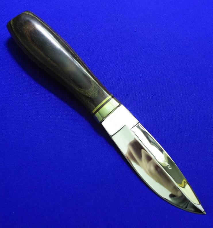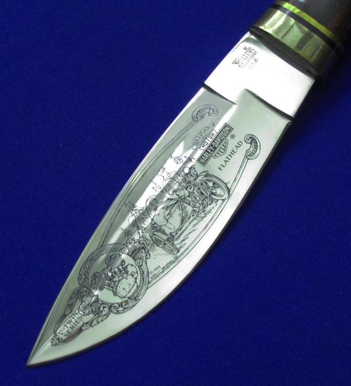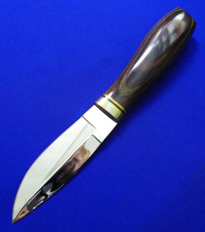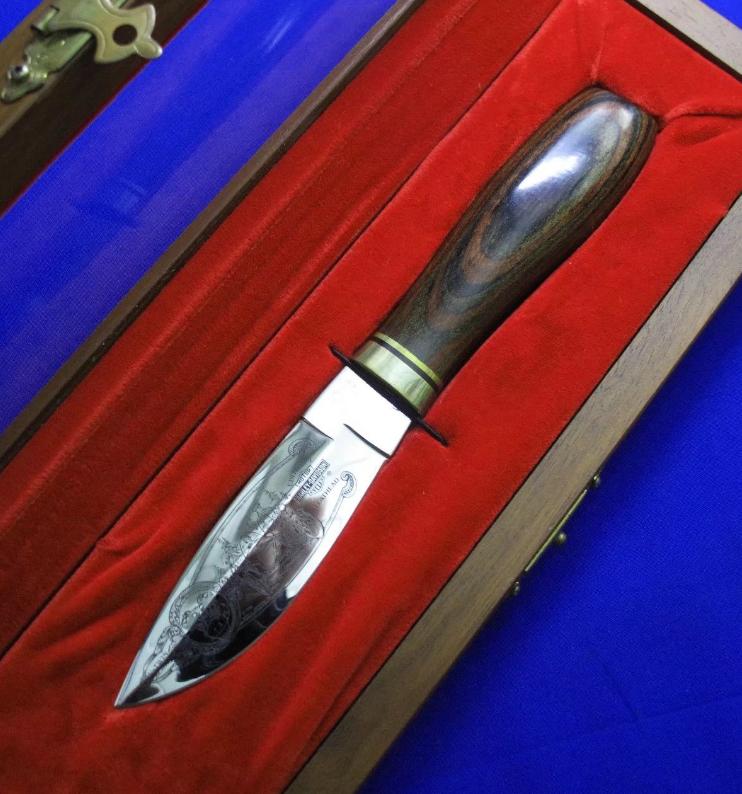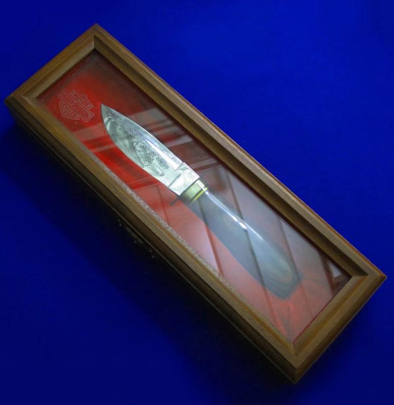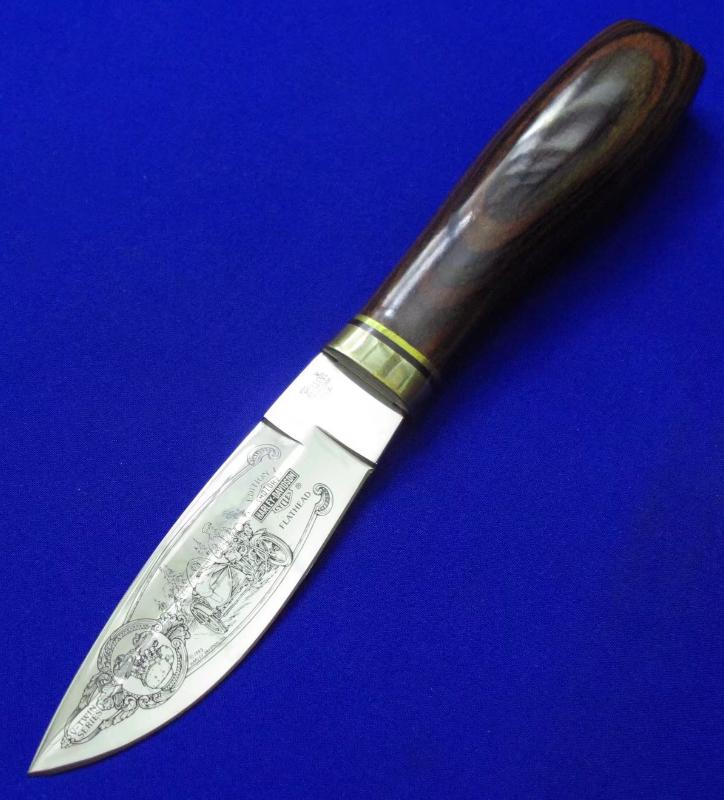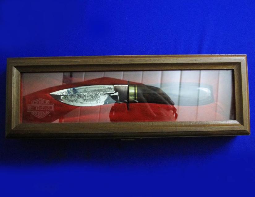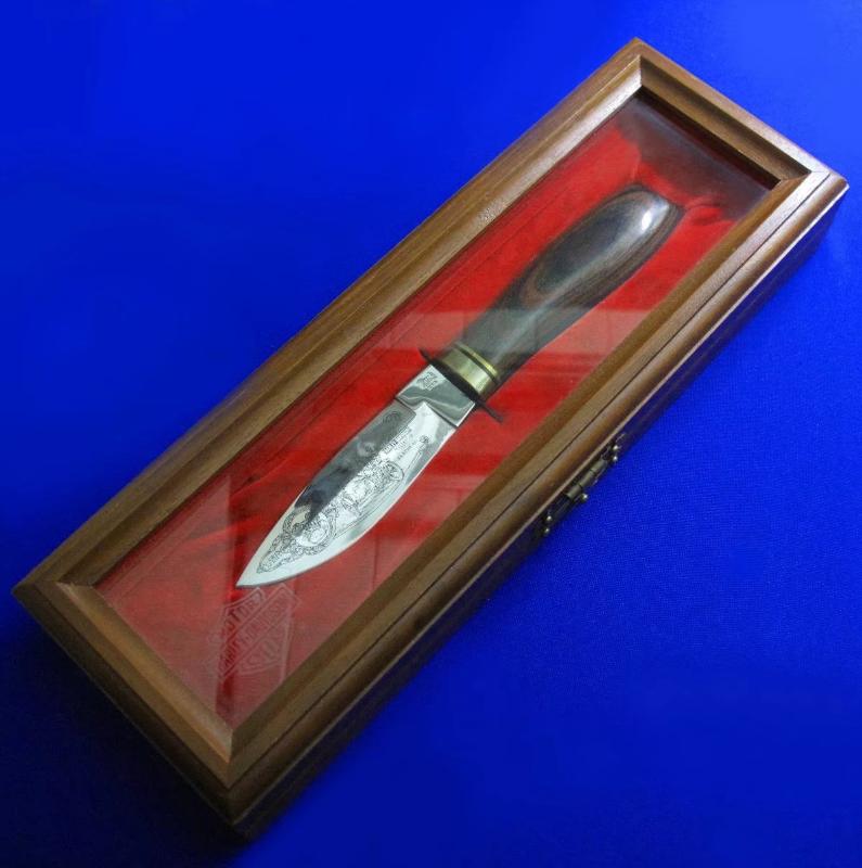 古董:巴克 哈雷戴维森 限量定制版 镜面柳叶刀(已绝版,稀有)。全长:21cm。刃厚:3.2mm。刃材:420HC。硬度:58-60。柄材:黄铜+实木。鞘材:无鞘(巴克的礼盒版直刀一般都不配鞘)。附件:玻璃盖收藏木盒。产地:美国。