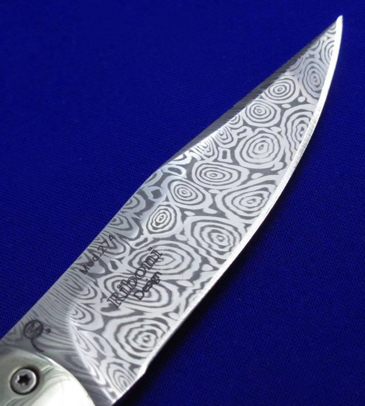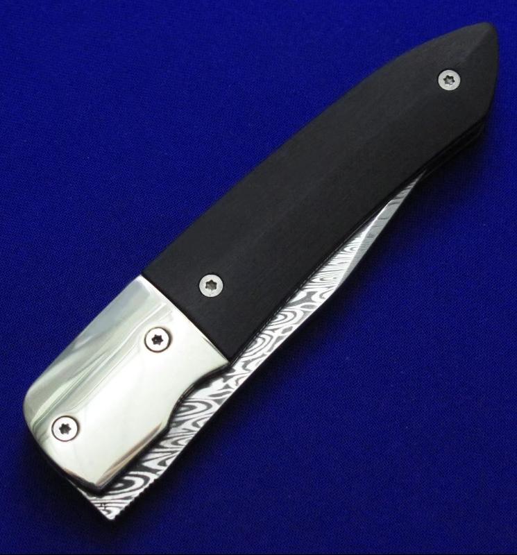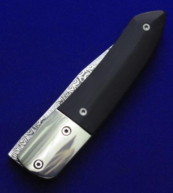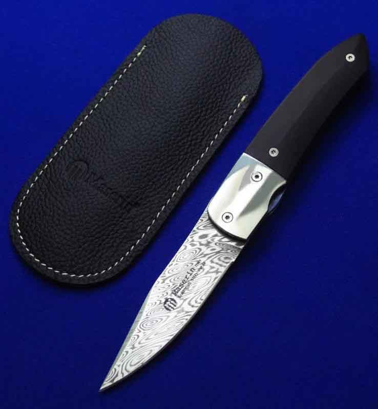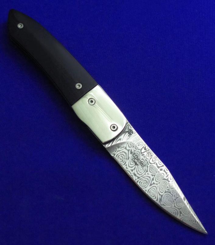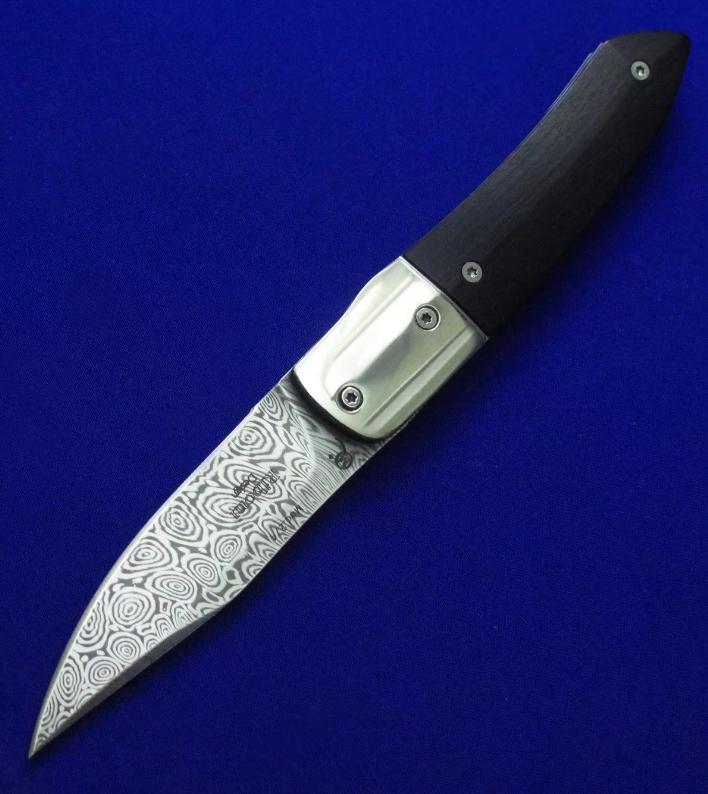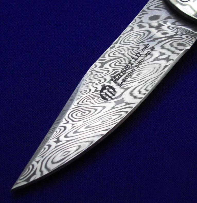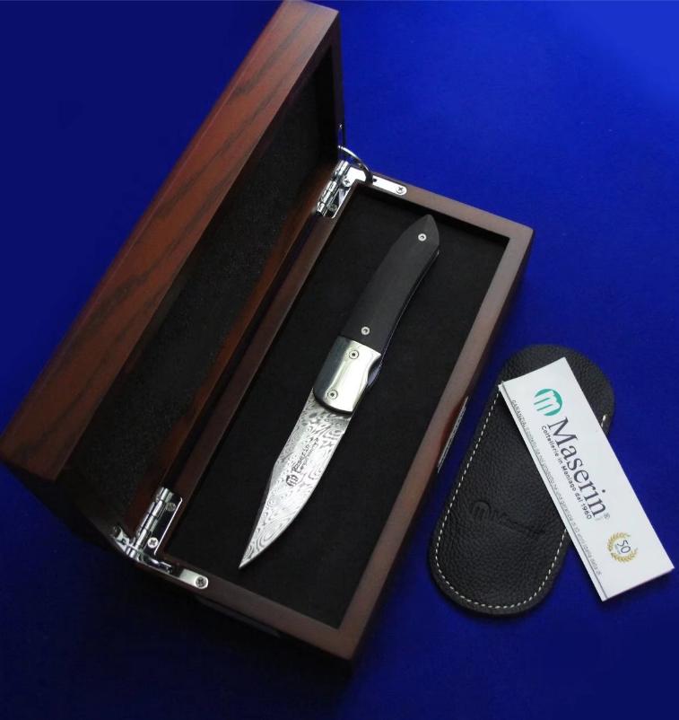 Maserin 马萨里 50周年纪念版 大马士革绅士折刀。 全长:17.6。 刃厚:3mm。 刃材:瑞粉大马士革。 硬度:60-62。 柄材:镍银(刀枕),非洲乌木(贴片),蓝色钛合金(内衬)。 鞘材:羊皮。 附件:收藏木盒。 产地:意大利。