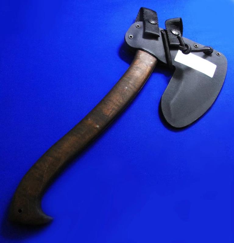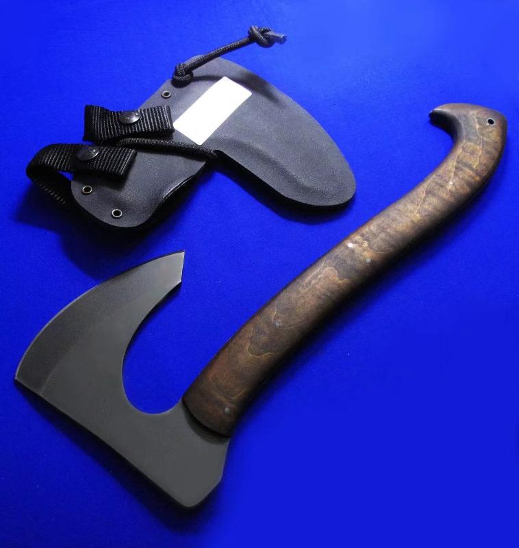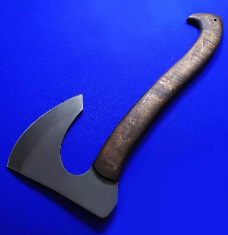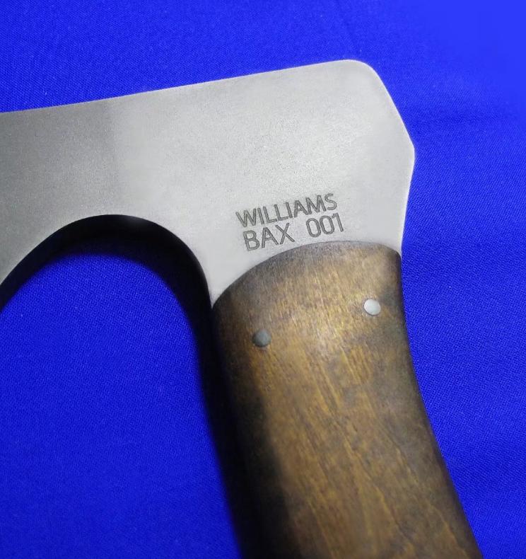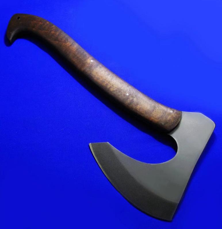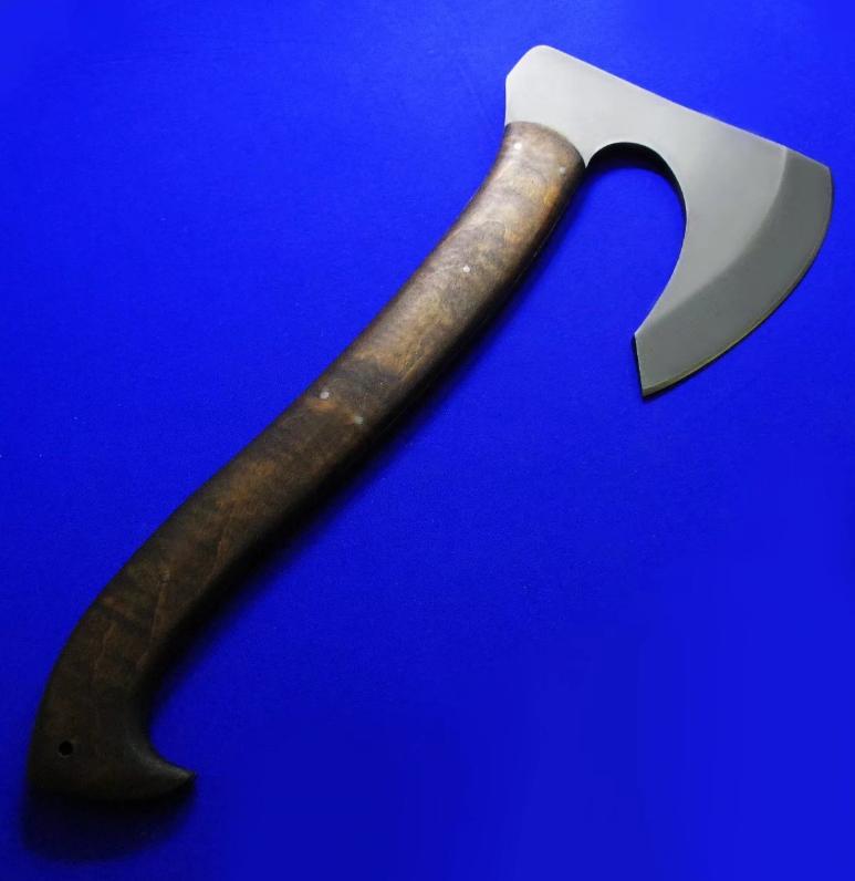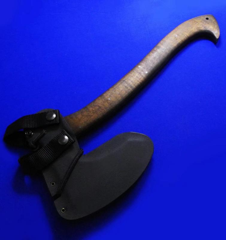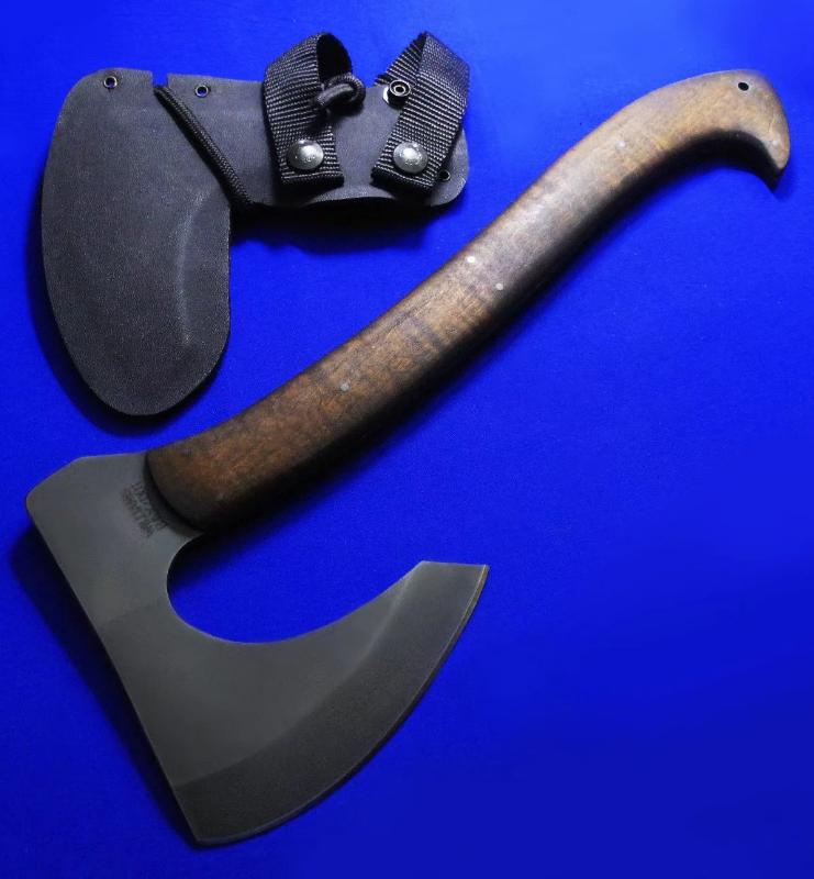 Williams & Winkler 大师合作版 一体锻造斧。Williams:刀具设计大师,。Winkler:美国ABS刀匠协会MS级大师,美军海豹特种部队现役佩刀供应商。全长:37cm。 刃厚:7mm。 刃材:80CrV2。 硬度:60。 柄材:80VrV2(等宽一体龙骨),枫木贴片。 鞘材:皮K混合静音鞘(牛皮外包K鞘)。产地:美国。