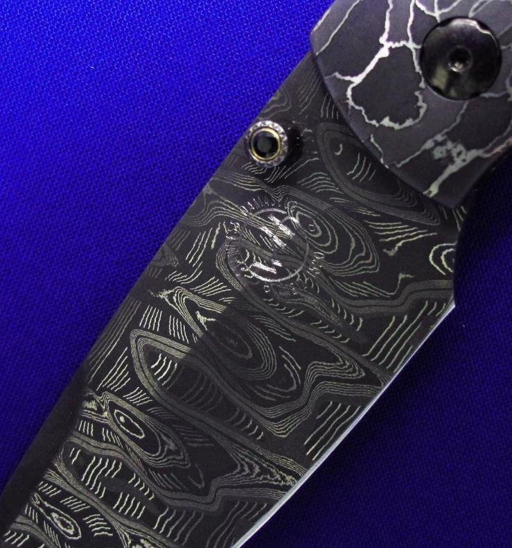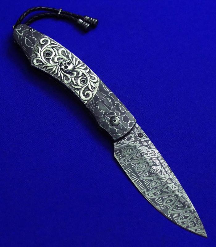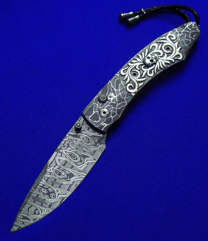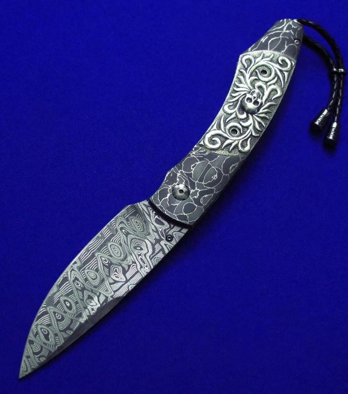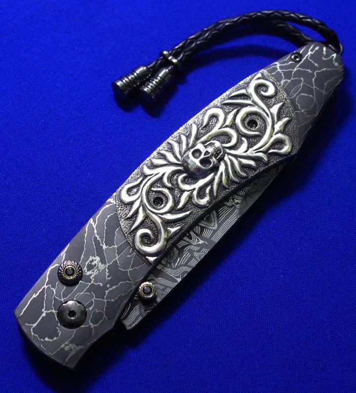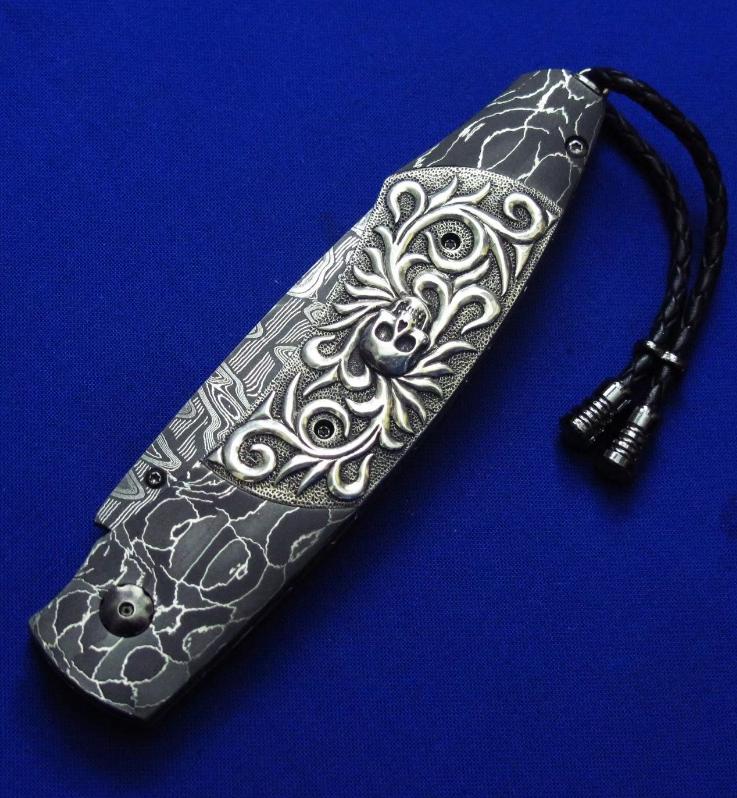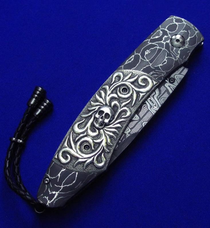 柄材:大马士革,镶嵌白银骷髅,墨西哥银手工立体盘花,开刀钮及解锁按钮镶嵌黑宝石。