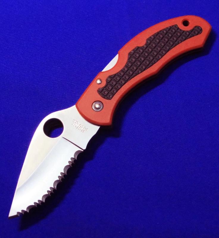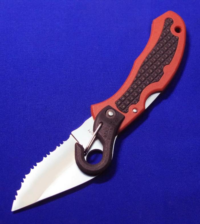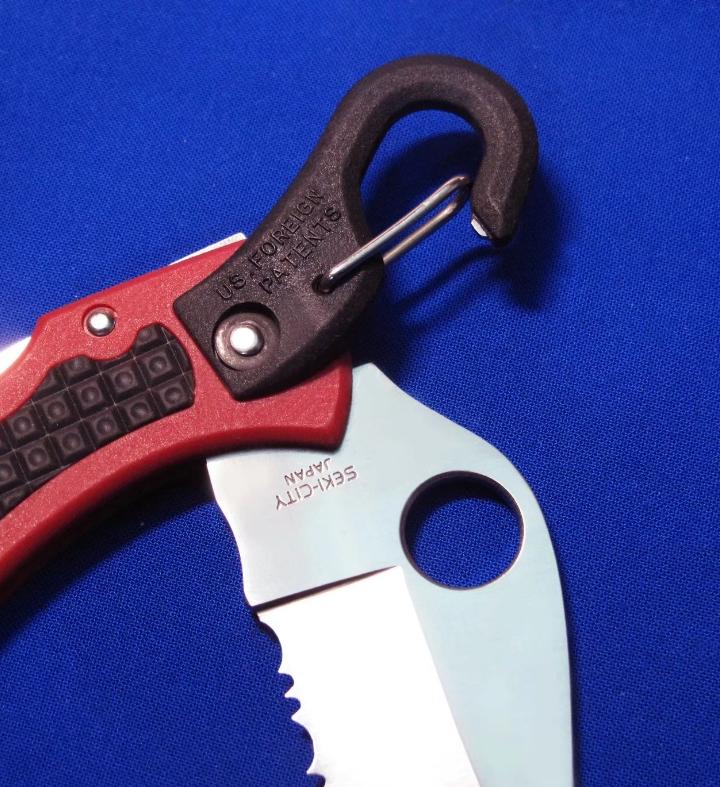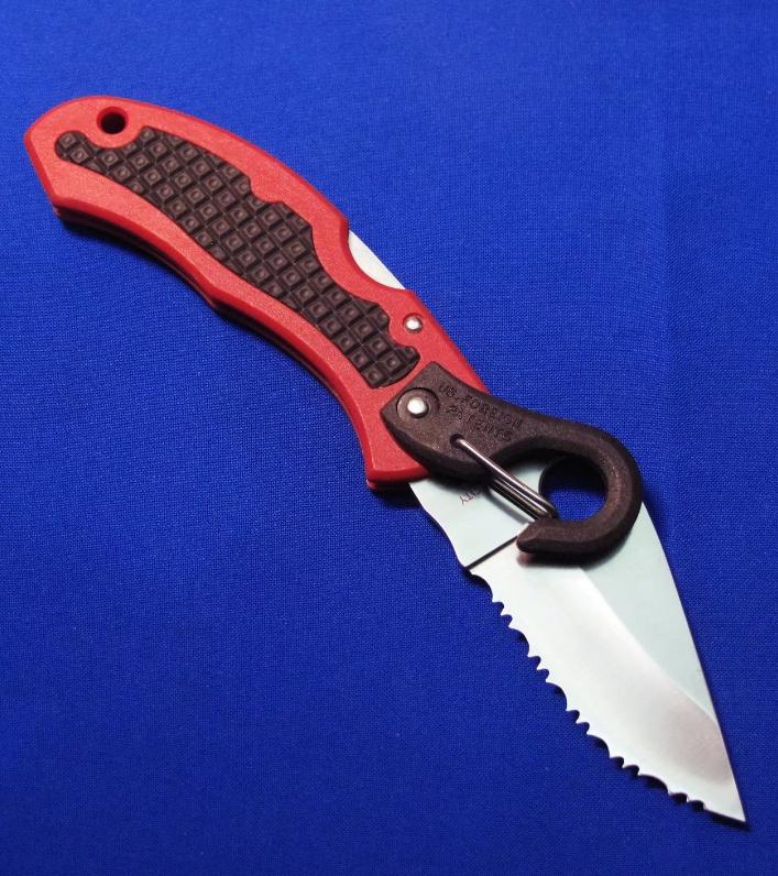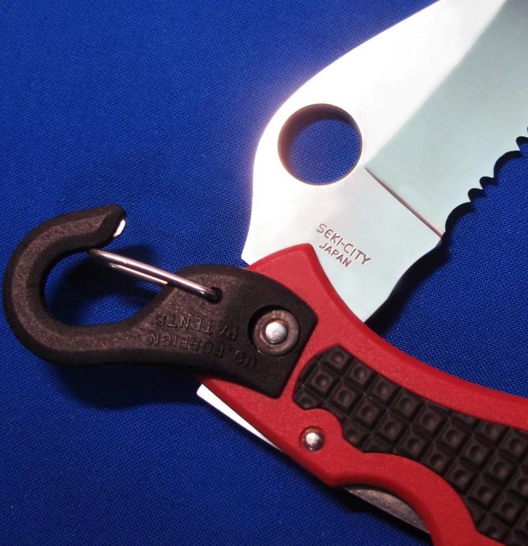 蜘蛛 C207S 全齿登山救援刀(已绝版,极稀有),自带快挂。 全长:17.6cm。 刃厚:3mm。 刃材:G2。 硬度:60-62。 柄材:FRN(刀柄)。不锈钢芯,外包FRN(快挂)。产地:日本。