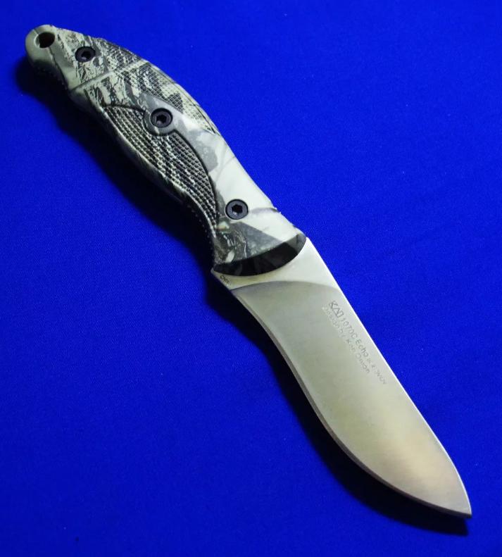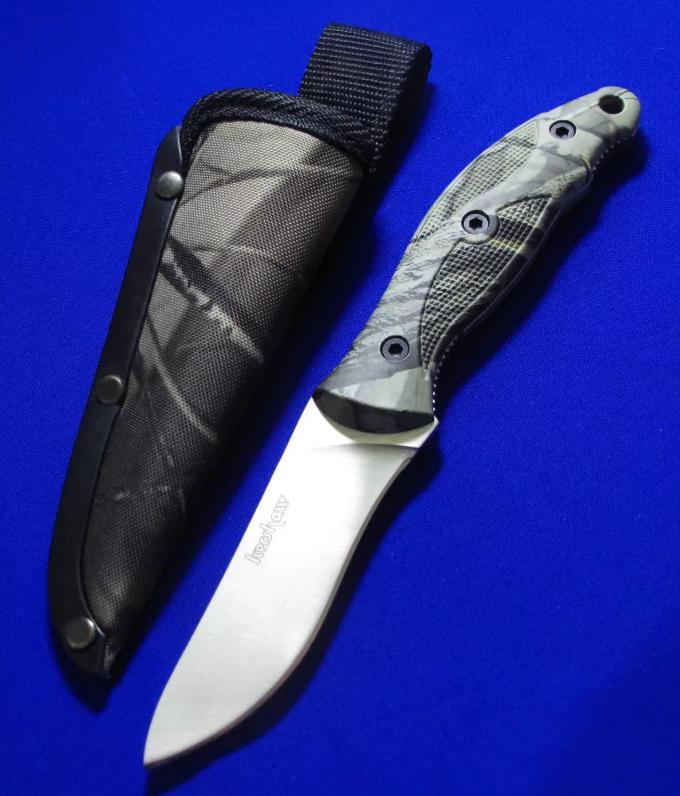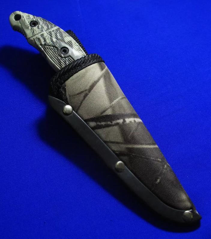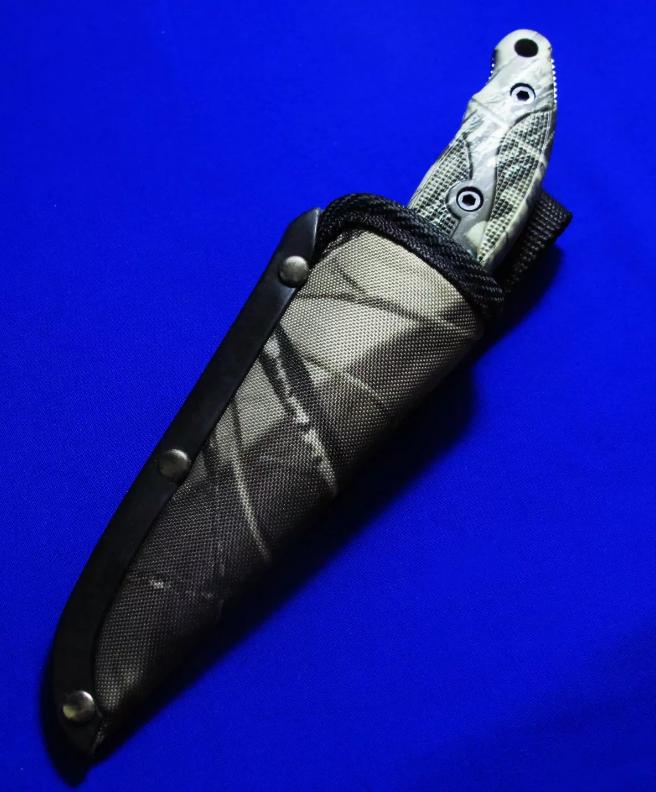 盒子压得变形,刀和鞘没问题。 全长:21.9cm。 刃厚:3.5mm。 刃材:8CR13MOV。 硬度:58-60。 柄材:Zytel。 鞘材:Nylon(内置K胆)。 产地:中国 代工。