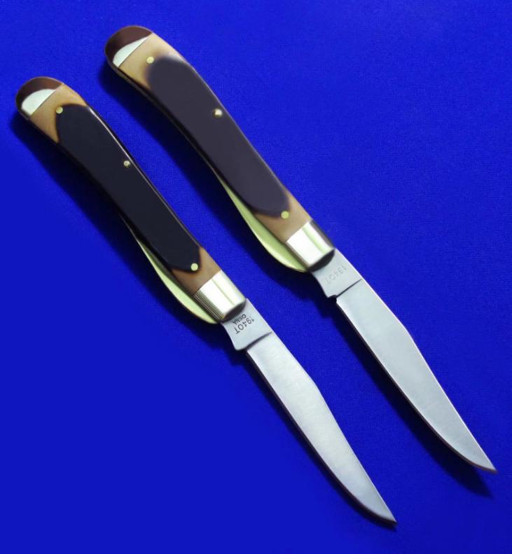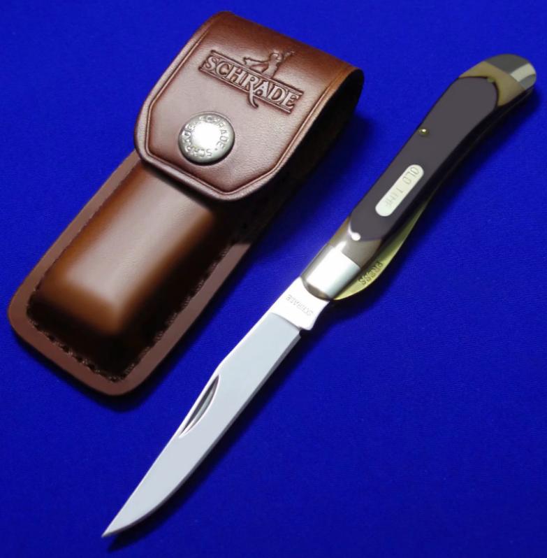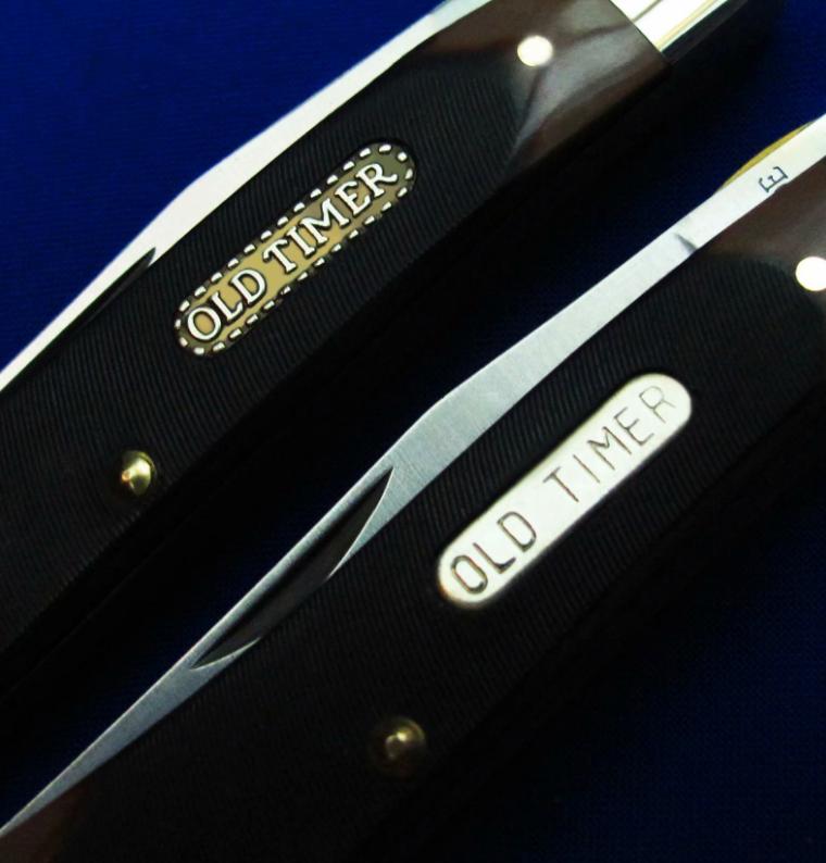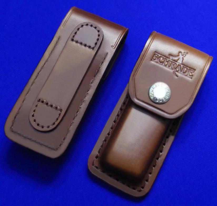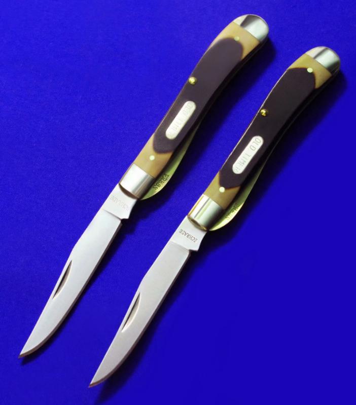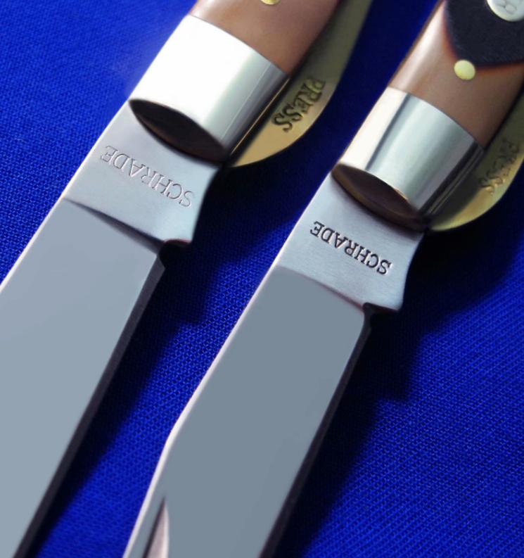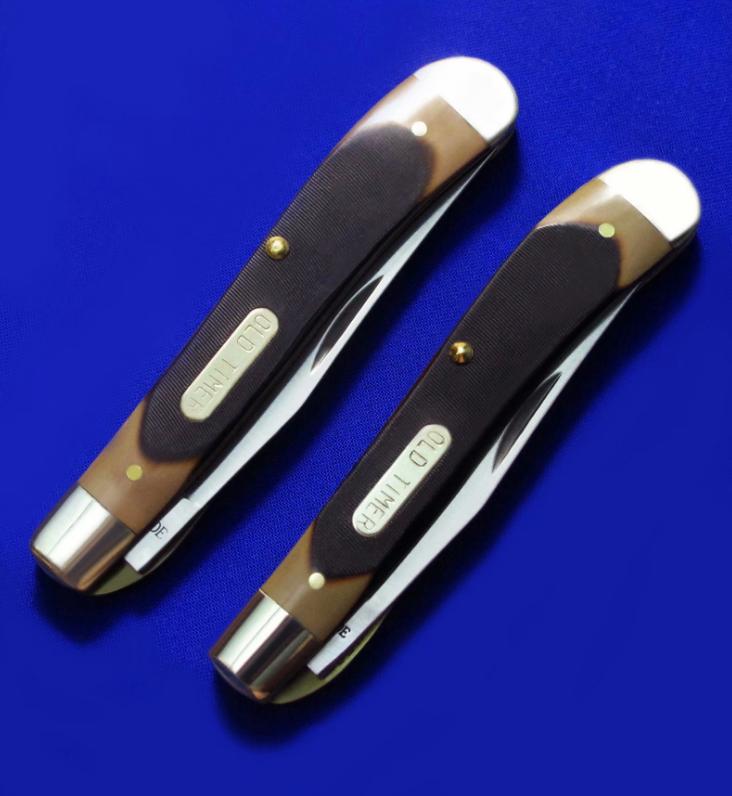 SCHRADE 单开绅士折刀,带锁定。说明:1,上为老版(美产,已绝版),下为新版(中国代工版)。2,老版徽标分阳刻(凸字)和阴刻(凹字)两种,见图6特写。购买老版时请说明选择哪种。新版只有阴刻(凹字),无凸字版本。3,两版刀片存在一点点造型区别,其它一样。全长:17.6cm。 刃厚:2.2mm。 刃材:440C。 硬度:58-60。 柄材:黄铜+Phenolic。