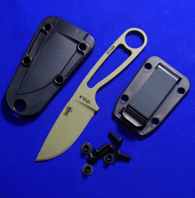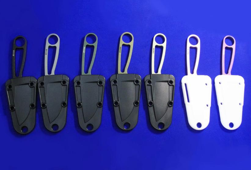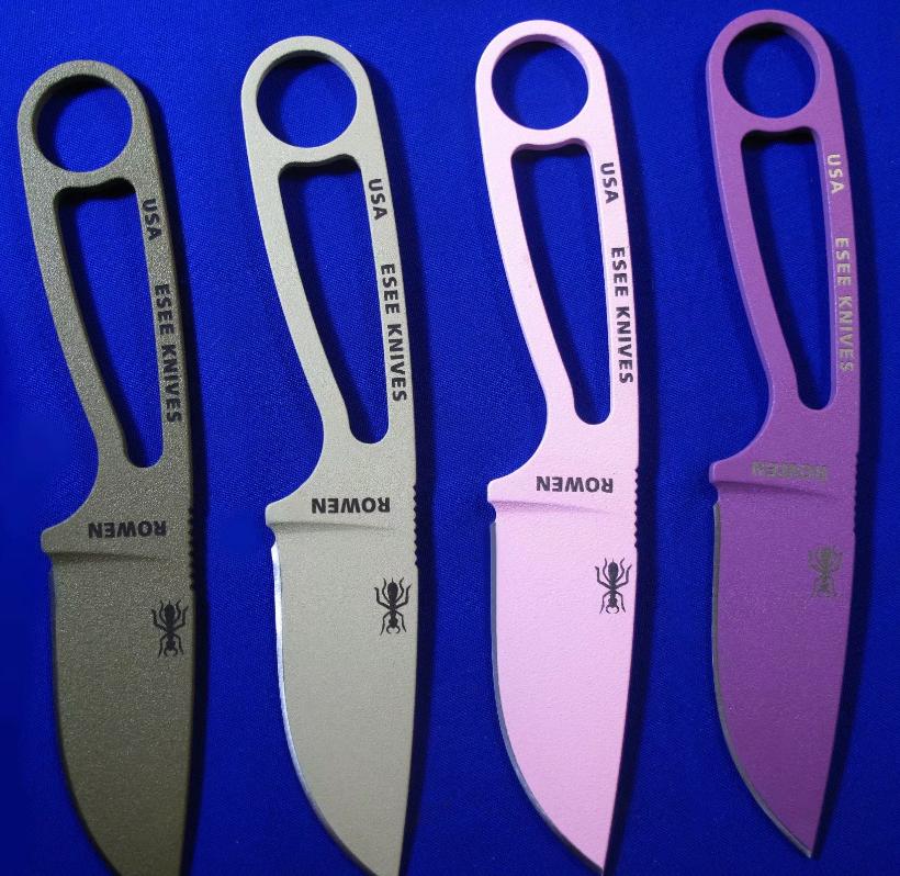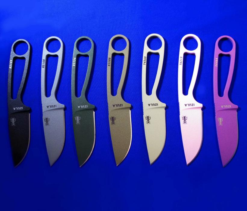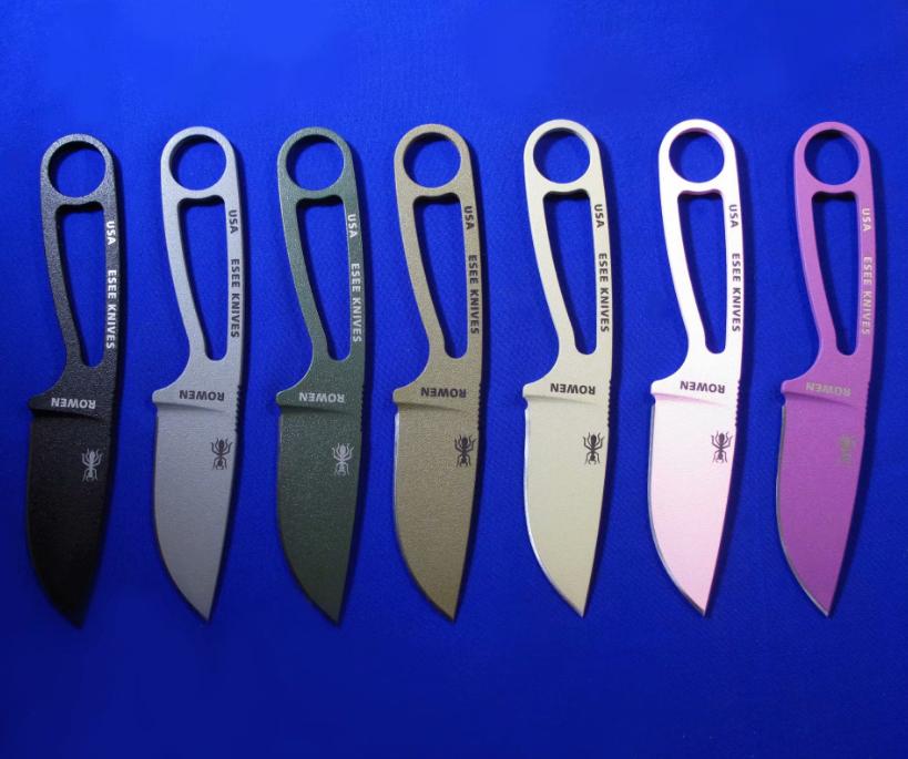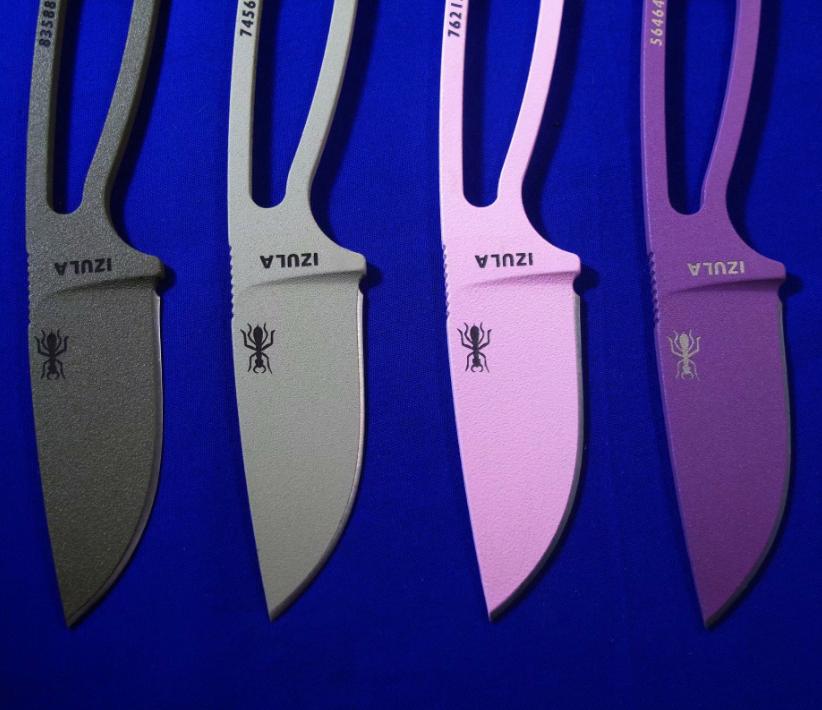 ESEE IZULA 蚂蚁小直 。 颜色左起:黑色、灰色、绿色、狼棕、沙色(米黄)、粉色、紫色。 全长:15.8。 刃厚:4mm。 刃材:1095。 硬度:58。 鞘材:K鞘+不锈钢腰夹。 产地:美国。