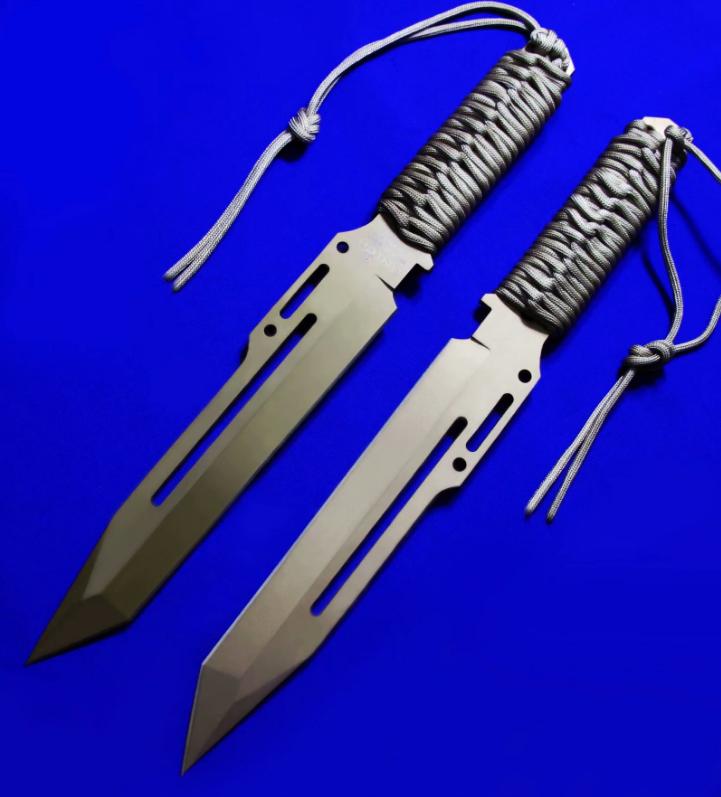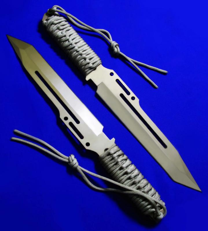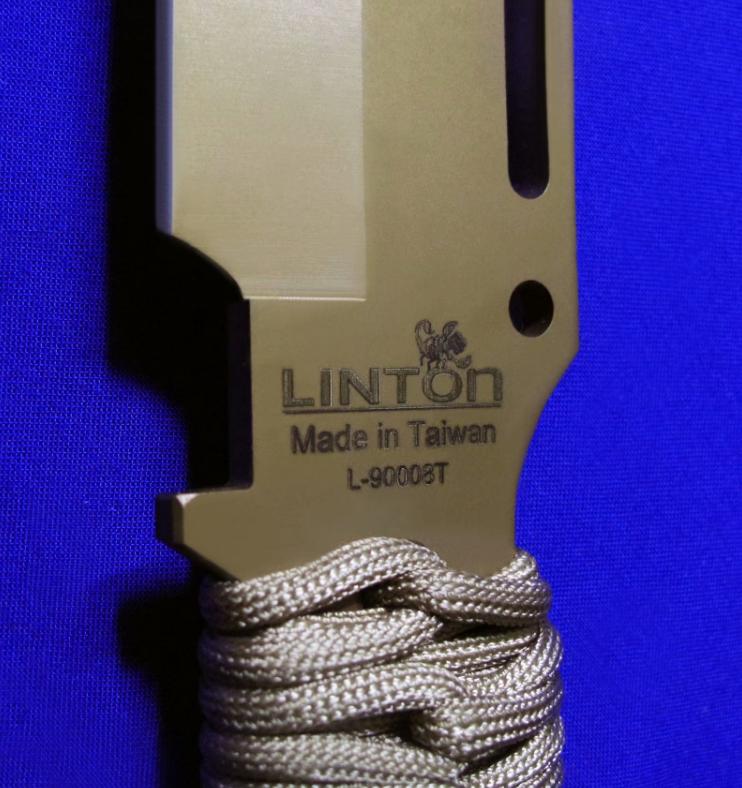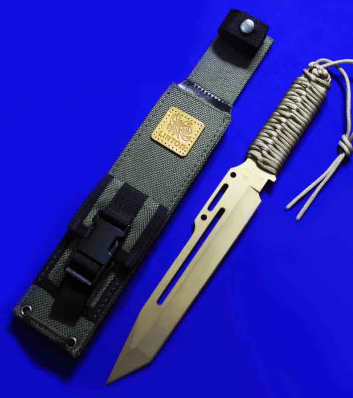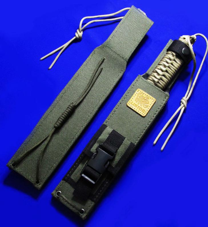 Linton & Strider 合作 蝎子中直 金色纪念版(绝版)。全长:36.7cm。刃厚:5.5mm。刃材:LV-04。硬度:59-61。柄材:伞绳。鞘材:Cordura(内置K胆)。产地:台湾。