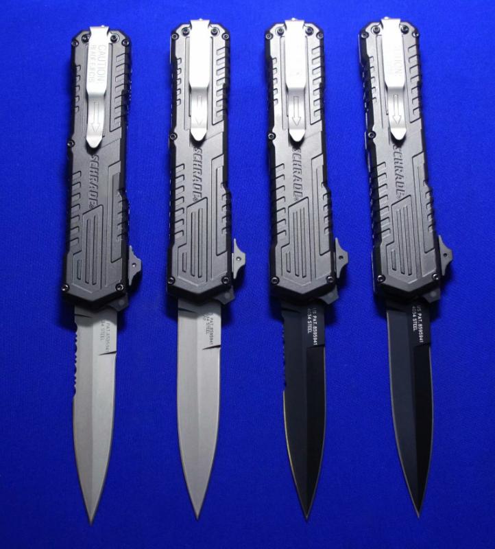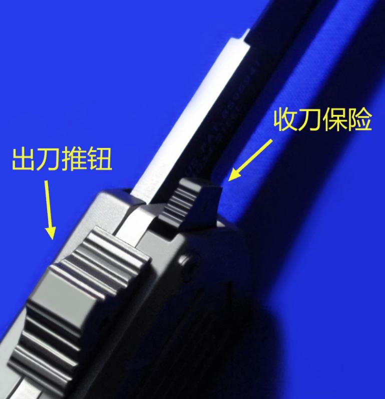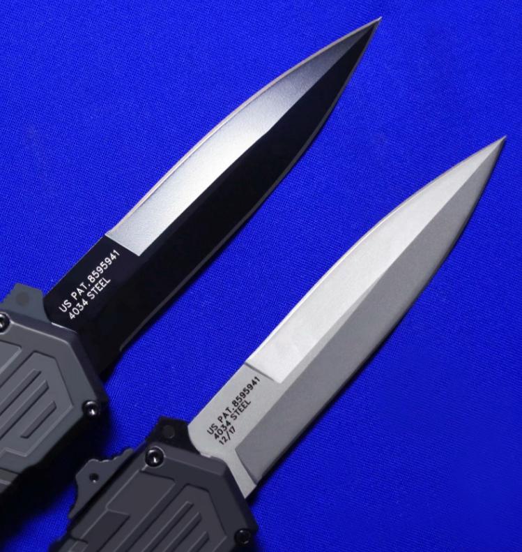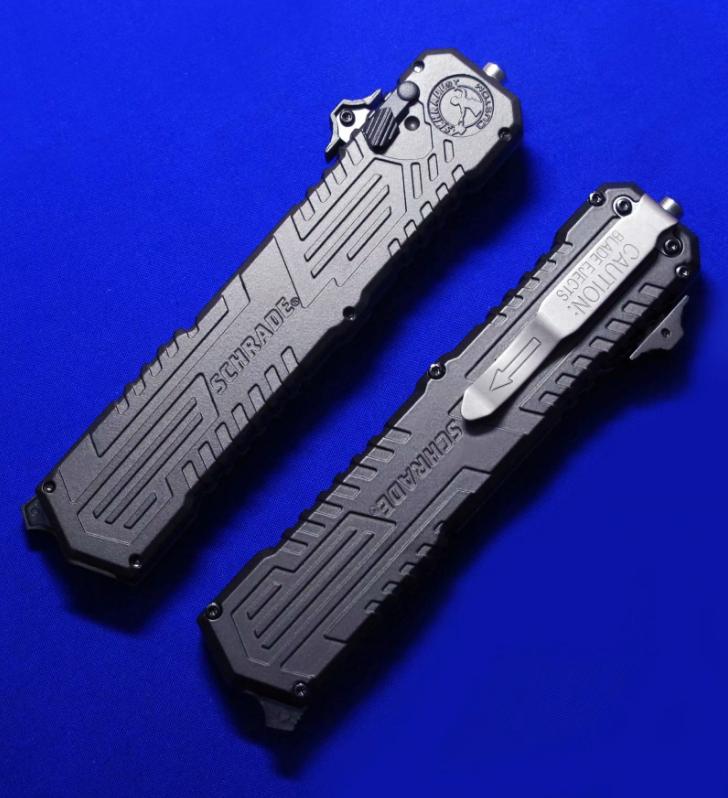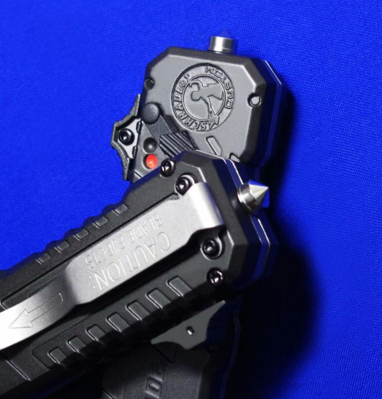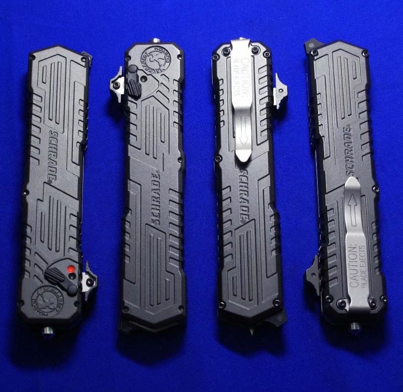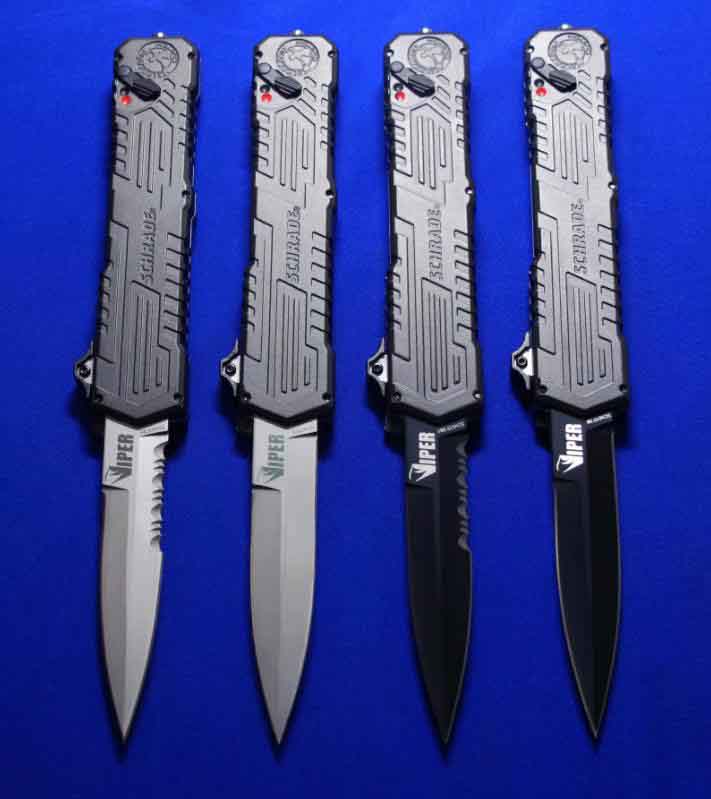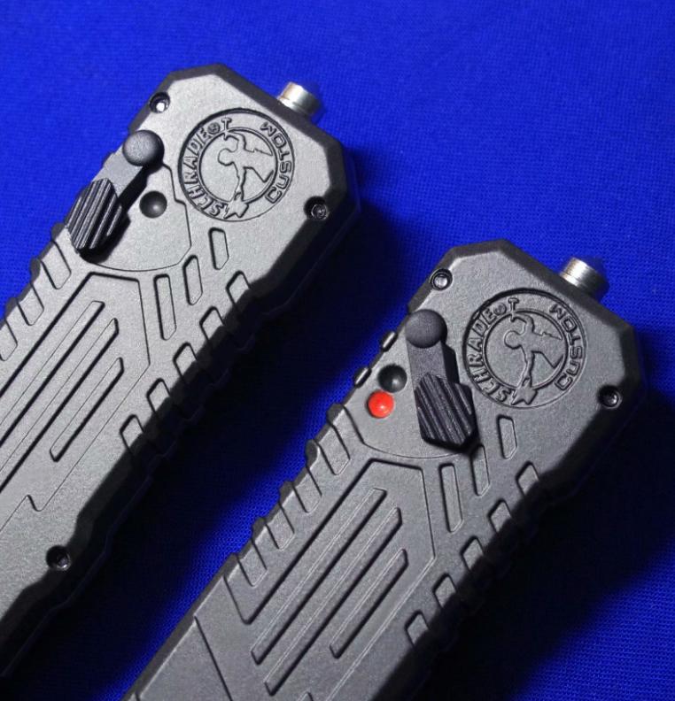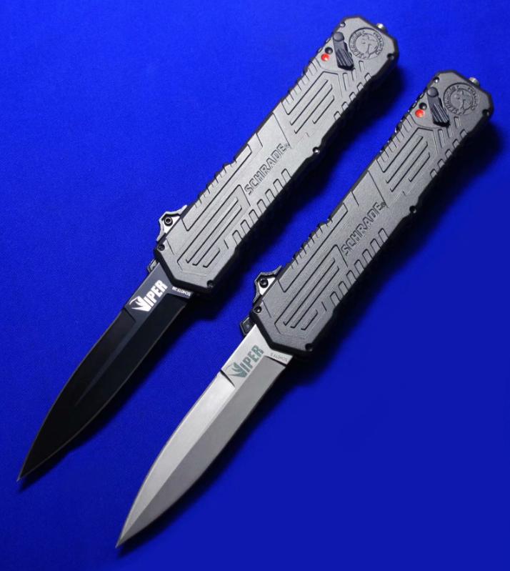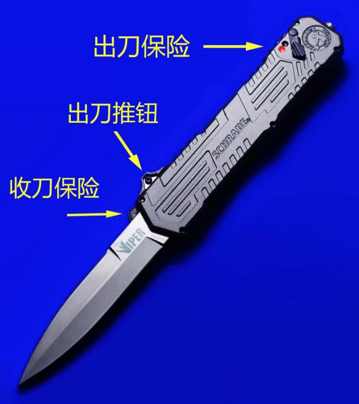 Viper & Schrade 合作 双刃军警直跳(双保险设计)。相当特立独行的直跳,操作设计与外形设计皆按照qiang械设计的理念来的。出刀、收刀皆有独立保险。柄尾有钨锥。全长:22.4cm。刃厚:3mm。刃材:4034工具钢。硬度:58-60。柄材:T6 6061+物质钨锥(钨是坦克穿甲弹头的材料)。产地:台湾。