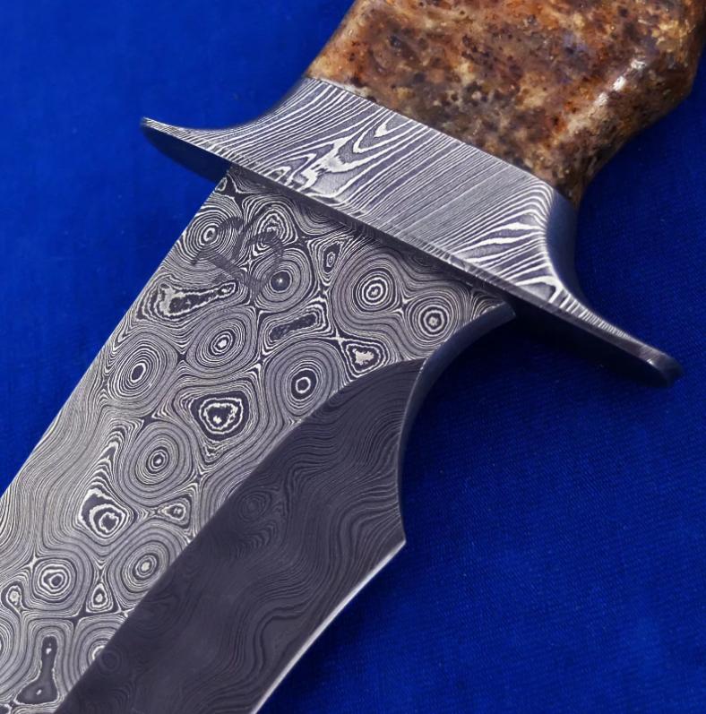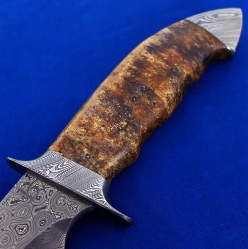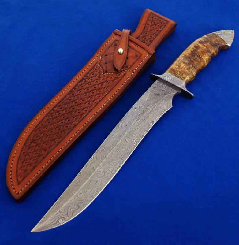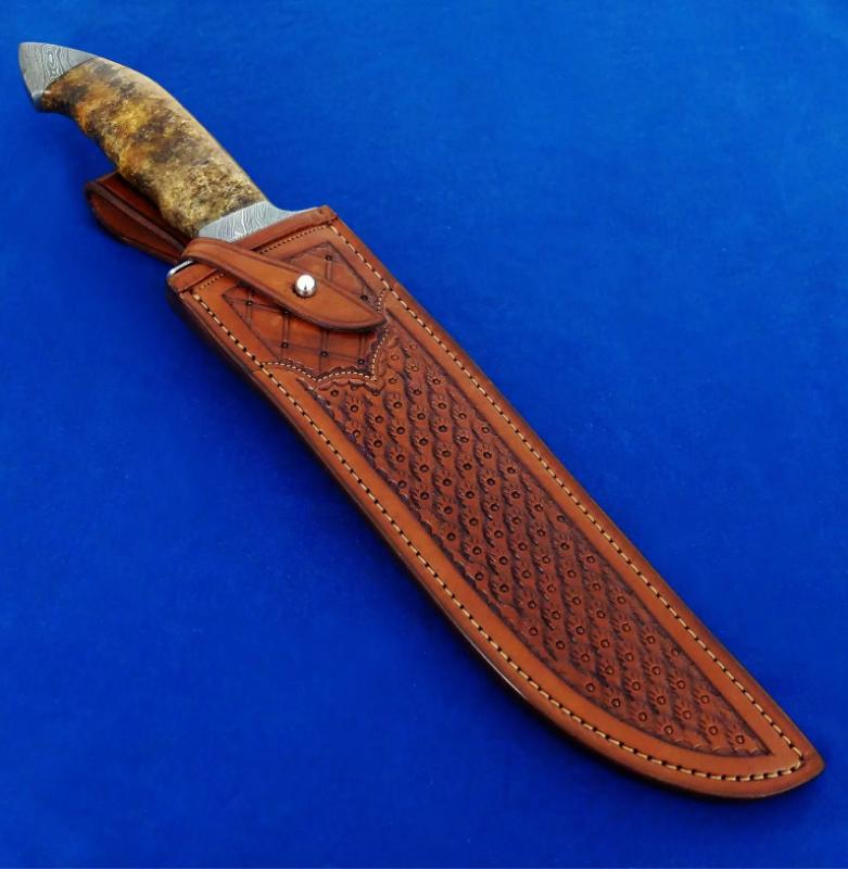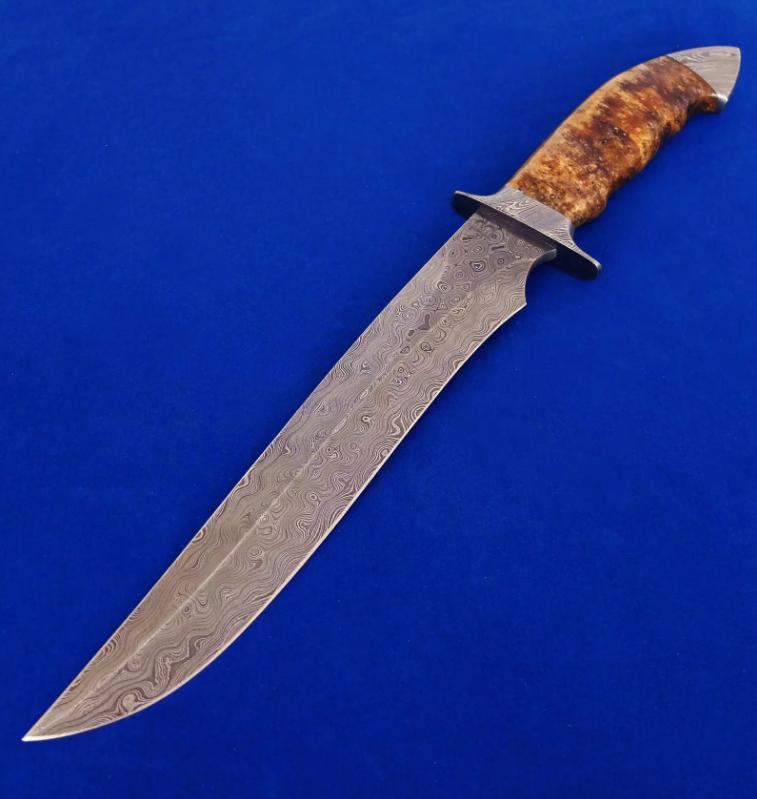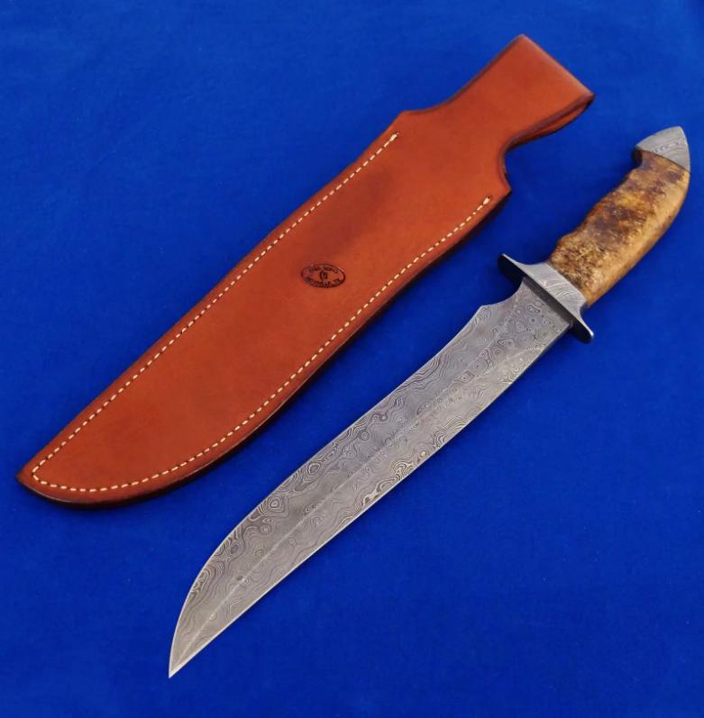 大师David Broadwell 大马士革 手工博伊。全长:37.8cm。刃厚:6.3mm。刃材:大马士革。硬度:60-62。柄材:鲸鱼骨化石(握柄),大马士革(护手及尾铁)。鞘材:牛皮。产地:美国。
