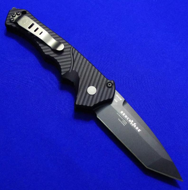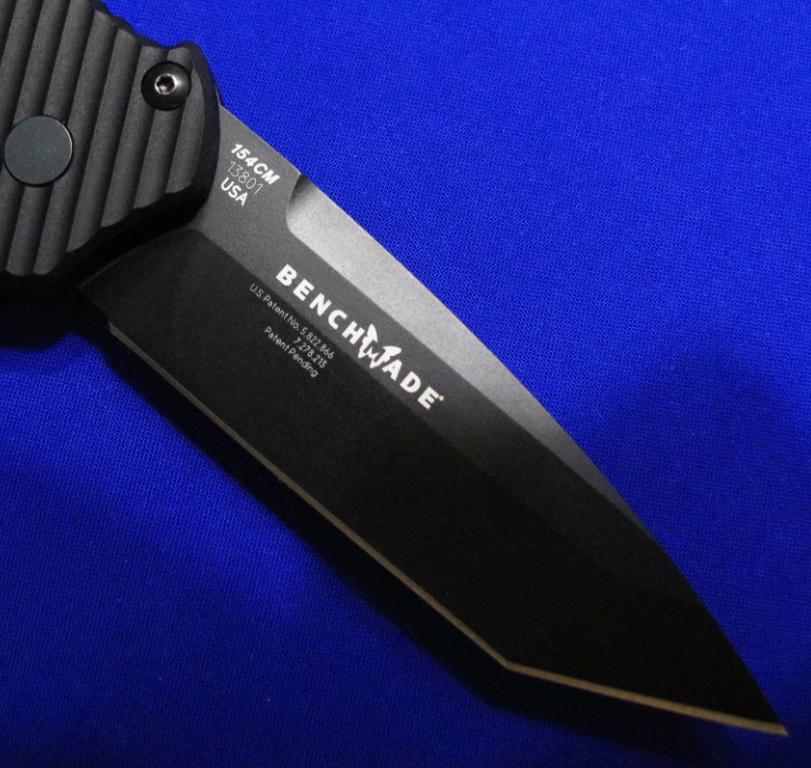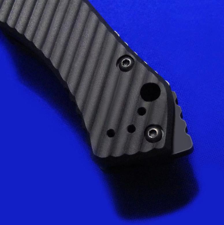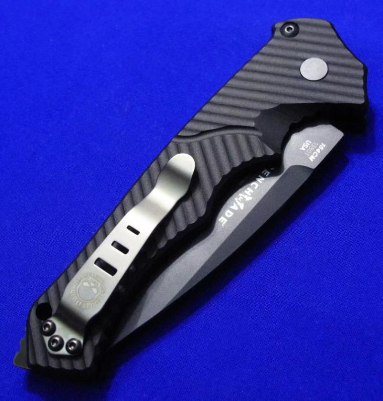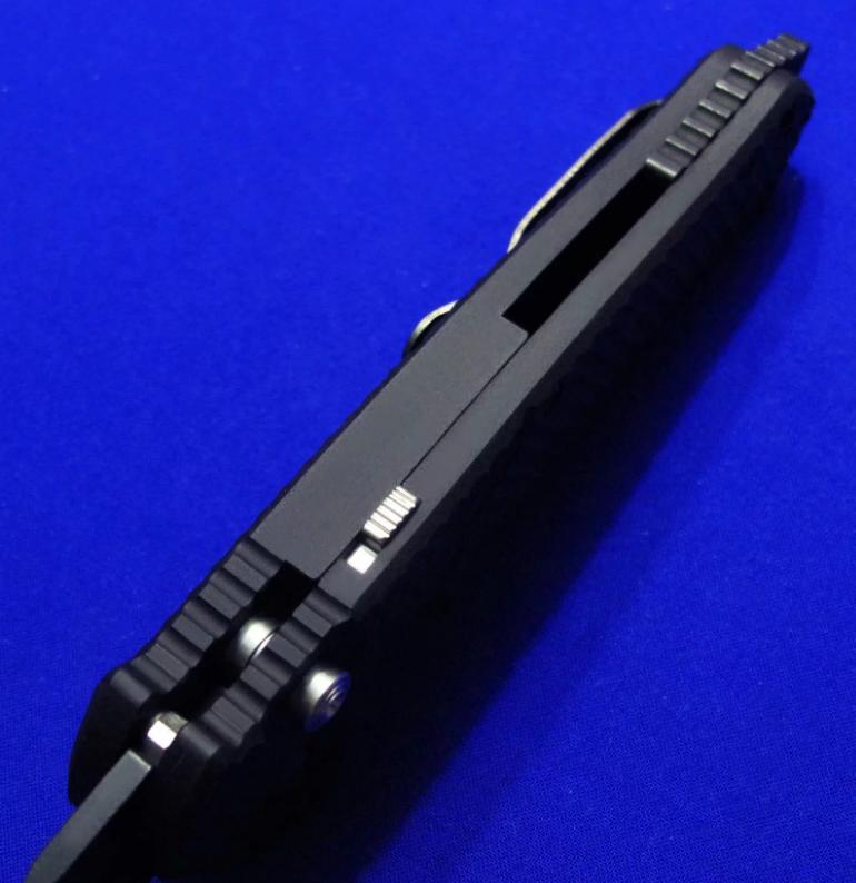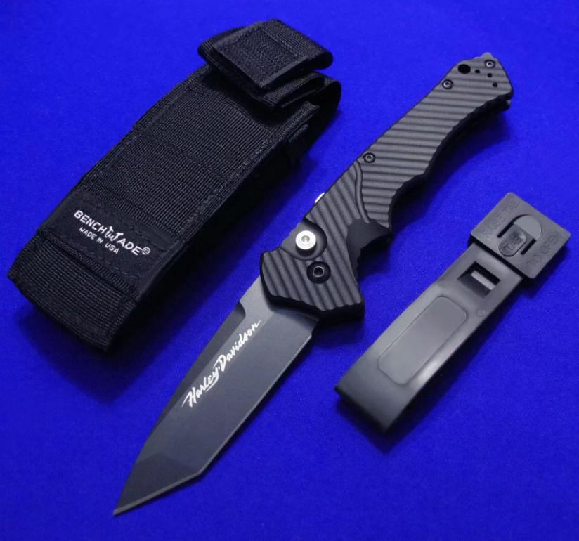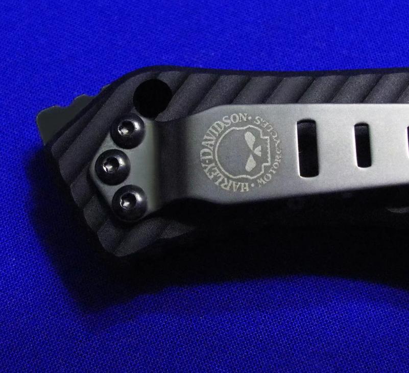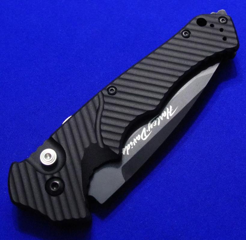 蝴蝶 & 哈雷.戴维森 合作 13801SBK 鲨鱼 全自动军警侧跳,柄背有保险锁,柄尾有击锤,已绝版。全长:21.6cm。刃厚:3mm。刃材:154CM。硬度:60-62。柄材:T6 6061。产地:美国。