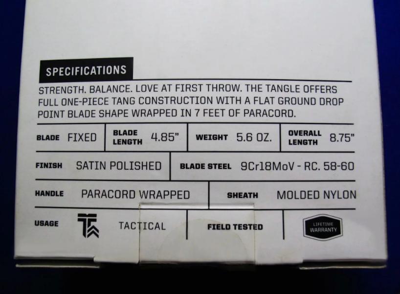握感、重心俱佳。 全长:22.3cm。 刃厚:4.8mm。 刃材:9CR18MOV。 硬度:58-60。 鞘材:K鞘。 产地:中国 代工。