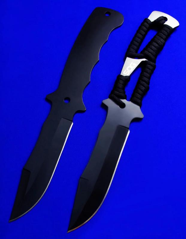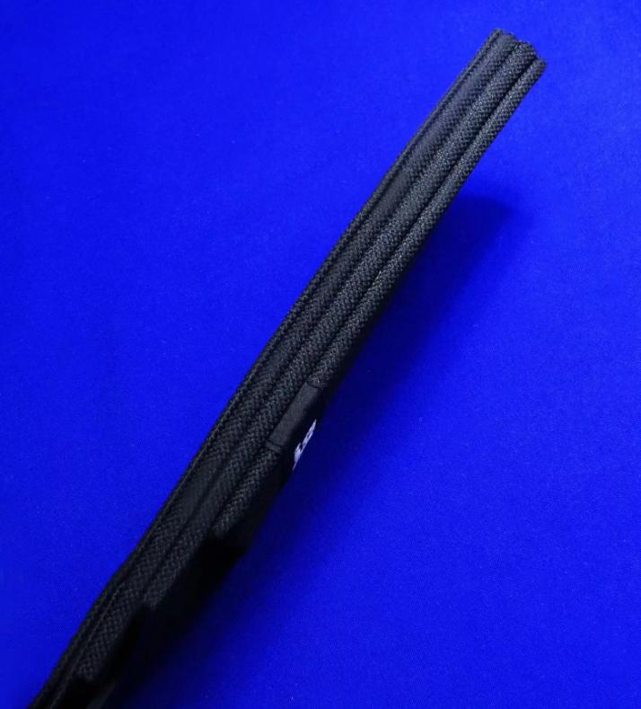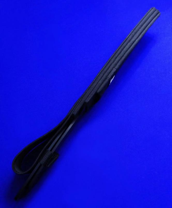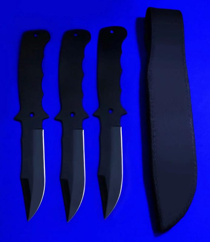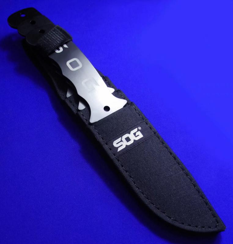 两点说明:1,投掷类兵器硬度必须低(提高韧性),以抵御抛出后常有的硬碰硬撞击,不致断裂。忌盲目追硬度,陶瓷刀最硬,飞出去…2,关于刀鞘。相信国内刀友多被阳江软塌塌的馄饨皮尼龙薄鞘恶心过,此鞘厚实硬挺(见图6、7),绝非馄饨皮,镖入鞘后合槽牢靠,不晃不摇。