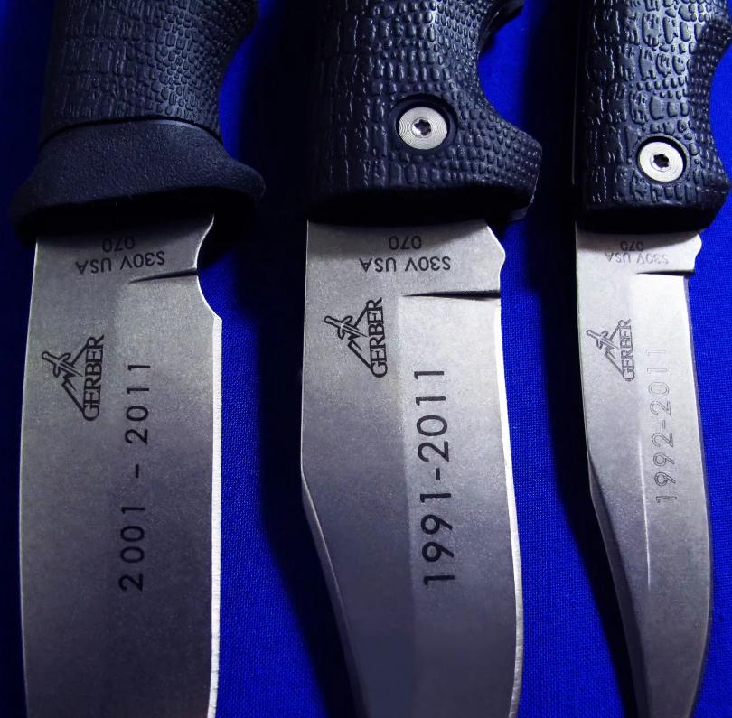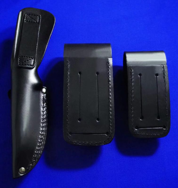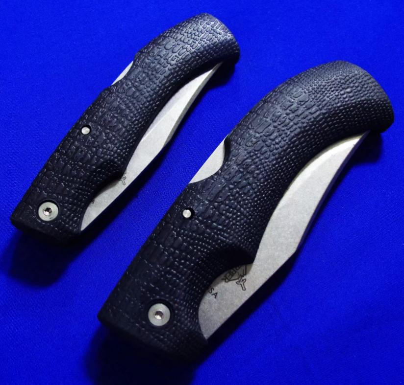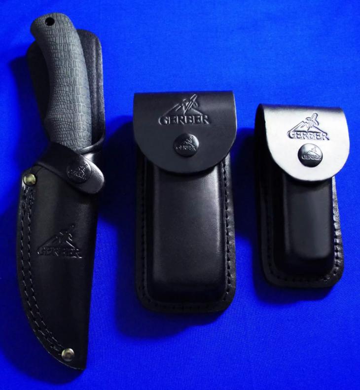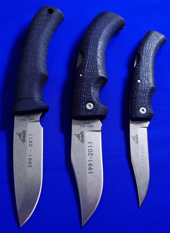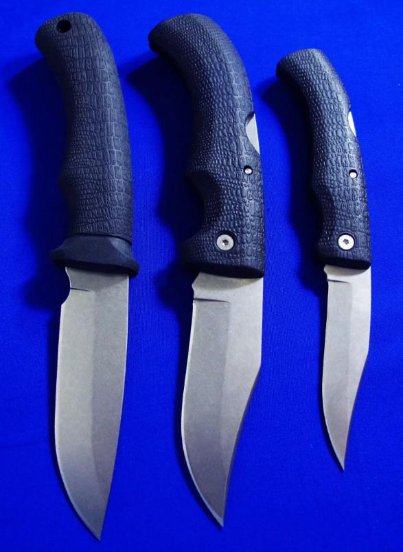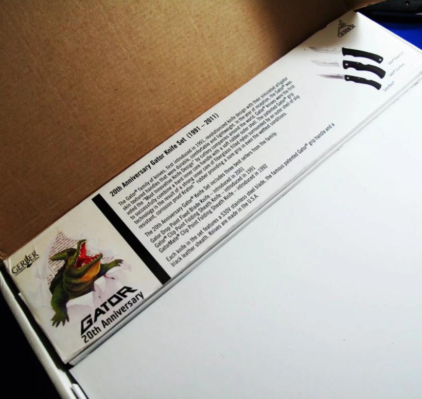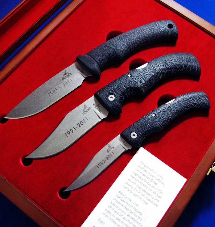戈博 限量纪念版 鳄鱼套装,已绝版,亦是鳄鱼系列的顶配版本。全长:22.5(左,直刀)22(中,折刀)18.5(右,折刀)cm。刃厚:3(左、中)2.5(右)mm。刃材:S30V。硬度:60-62。柄材:Kraton。鞘材:牛皮。附件:木质玻璃盖展盒一件。产地:美国。