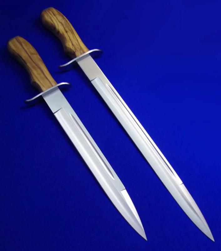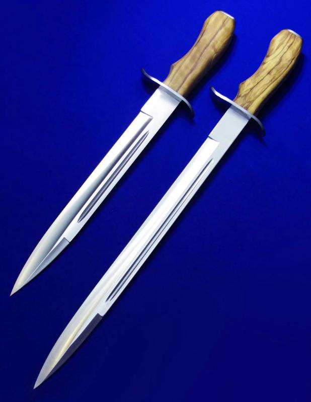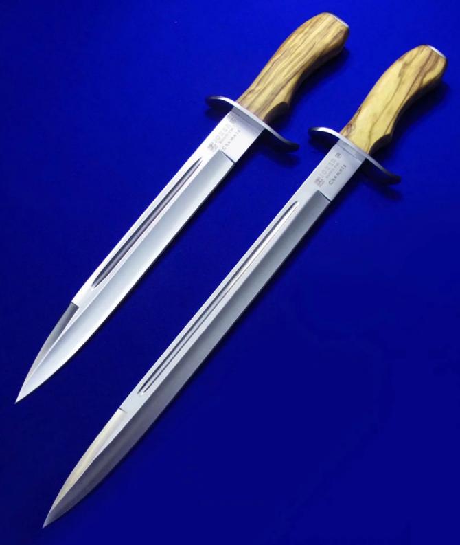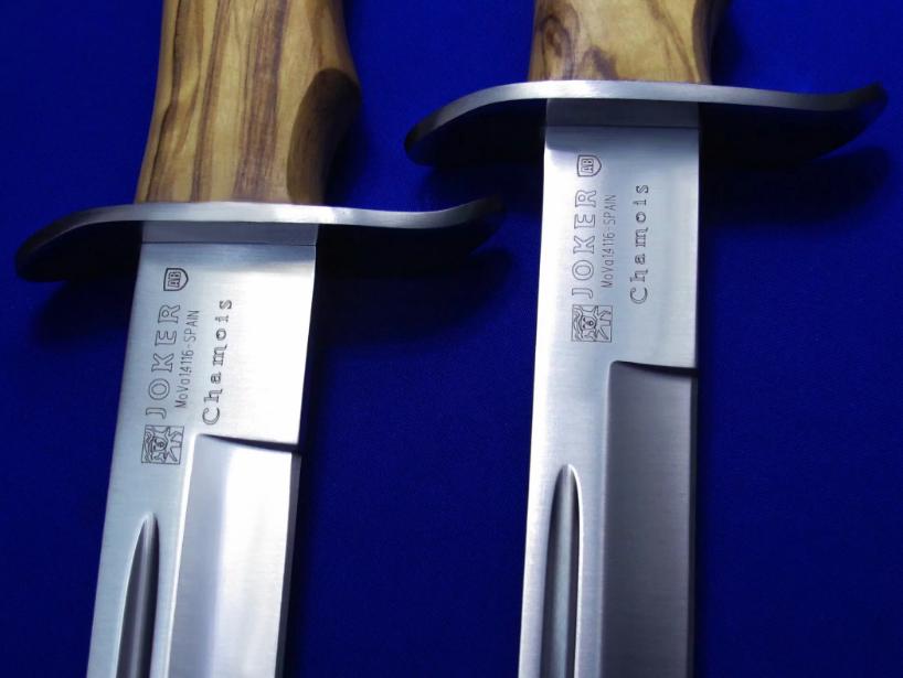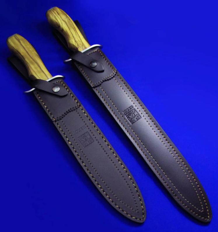 Joker 木柄单手刺。 全长:36.8(小)44.6(大)cm。 刃厚:4.5mm。 刃材:Molibdeno Vanadio1.4116工具钢。 硬度:58。 柄材:实木。 鞘材:牛皮。 产地:西班牙。