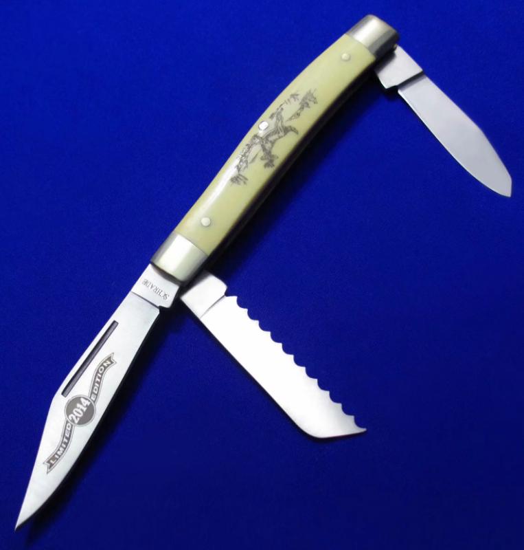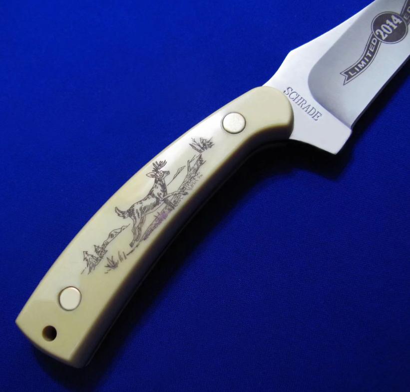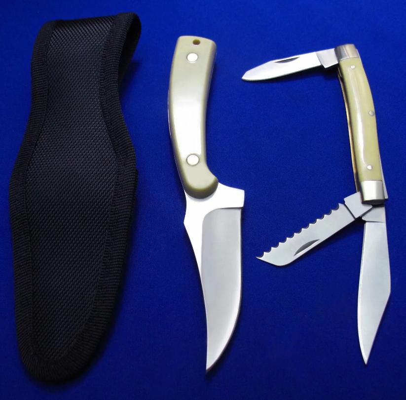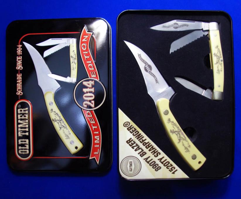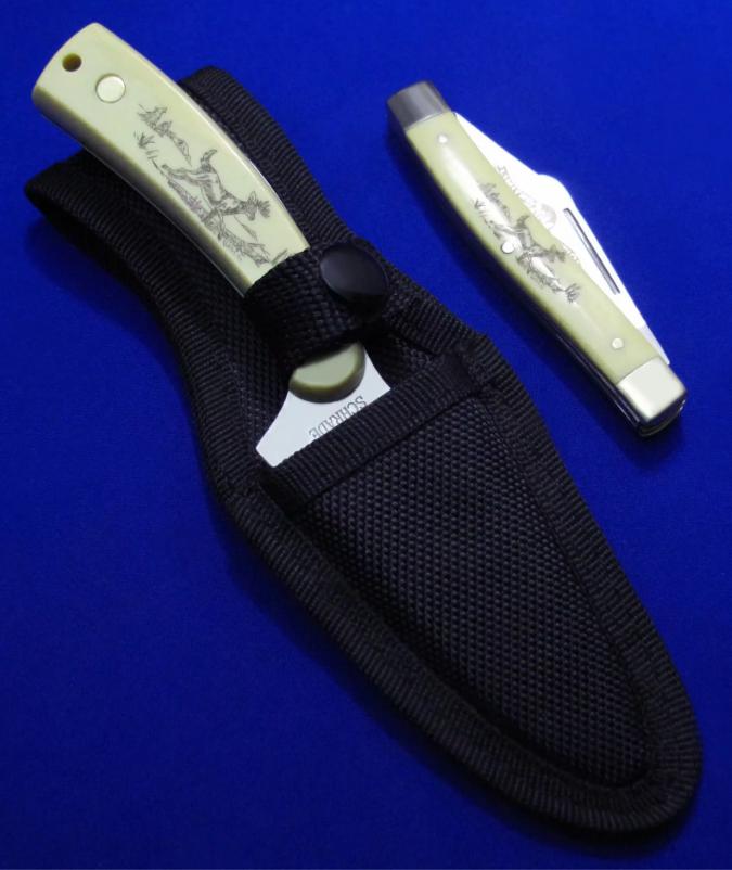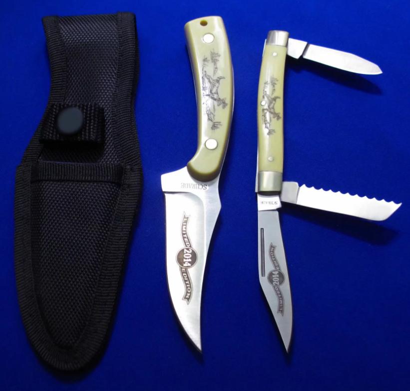 Schrade 110周年 纪念收藏版 双刀套装。 价格亲民,送礼佳品。折刀配有全齿刀片,属于口袋折刀中的罕见款式。 全长:17.8(直刀)17.2(折刀单侧主刀展开)22.2(折刀双侧展开)。 刃厚:3.5(直刀)2(折刀)mm。 刃材:AUS 8。 柄材:树脂,镊银,黄铜。 鞘材:Codura。