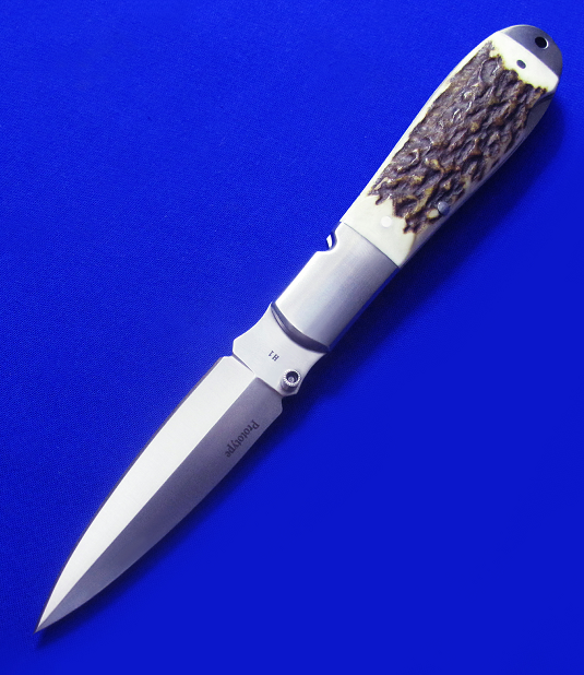 提示:非双刃,是单刃。 全长:17.5cm。 刃厚:2.8mm。 刃材:H1。 硬度:58。 柄材:鹿角。 产地:美国。