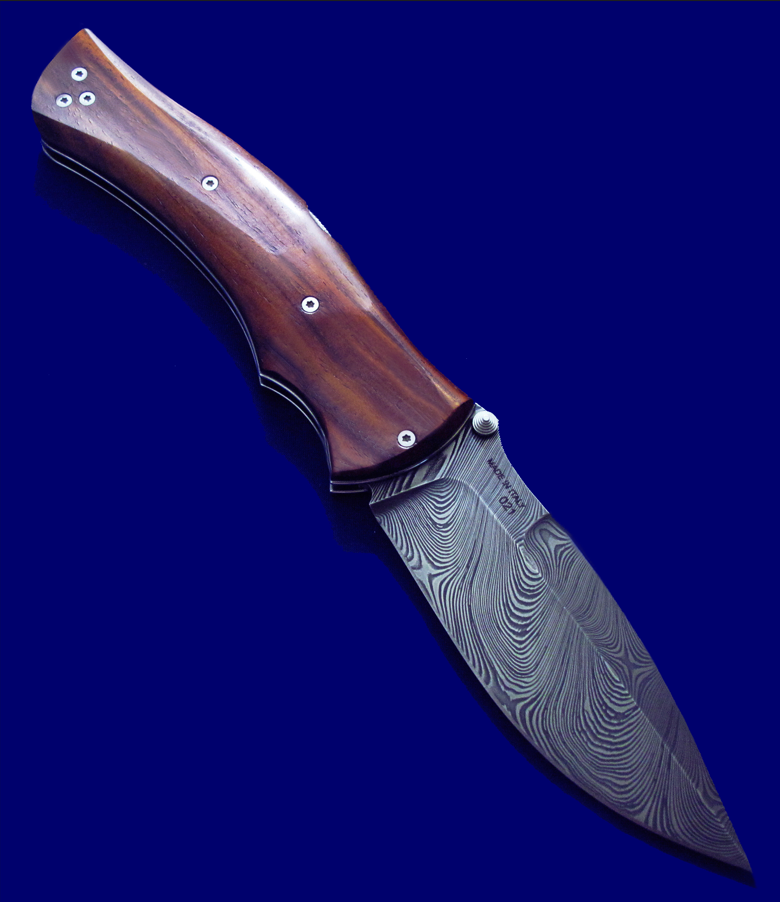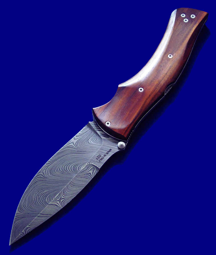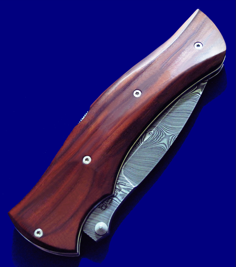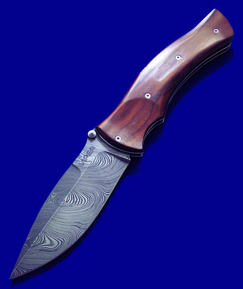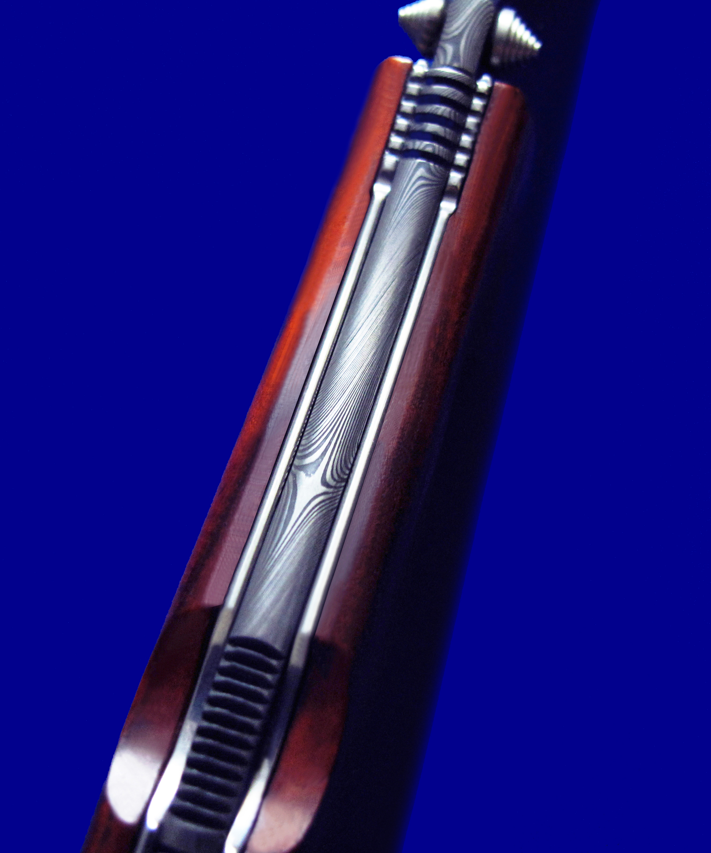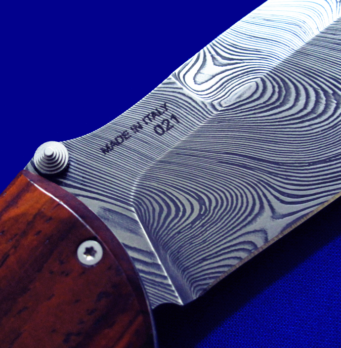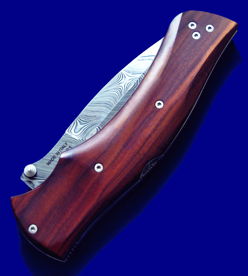 Viper 限量版 大马士革高档折刀。 背簧也是一整块大马士革(见图3特写)。 全长:23.8cm。 刃厚:3.5mm。 刃材:大马士革。 硬度:60-62。 柄材:COCOBOLO WOOD。 产地:意大利。