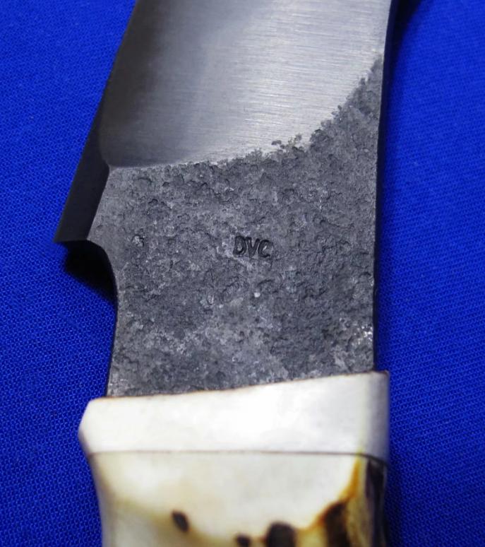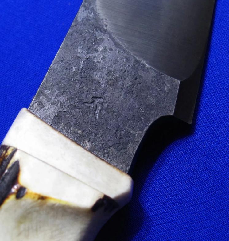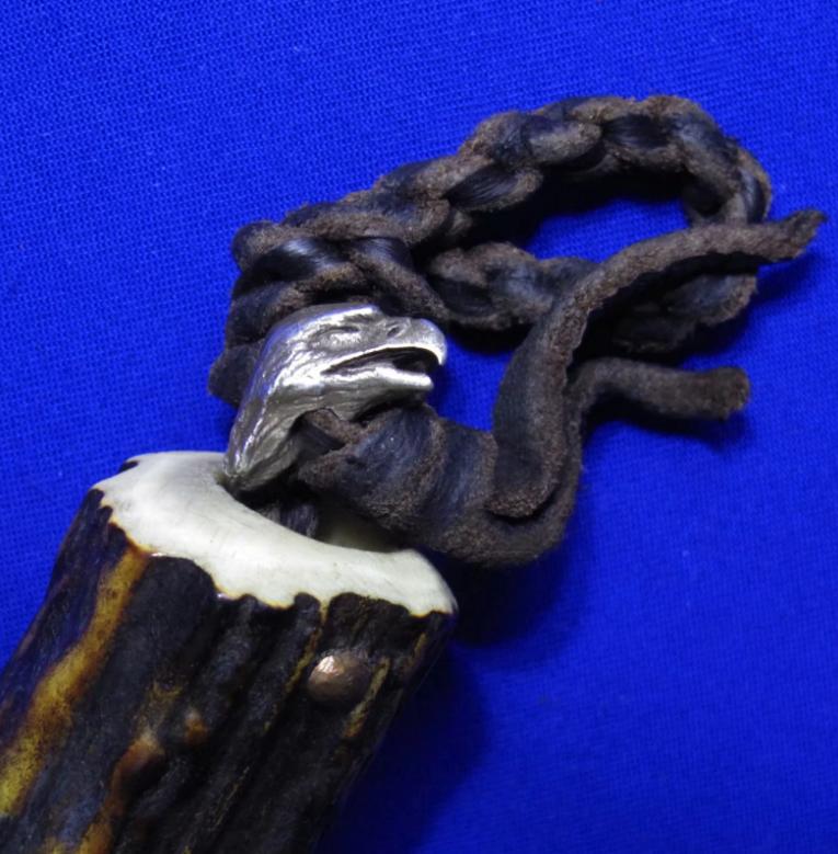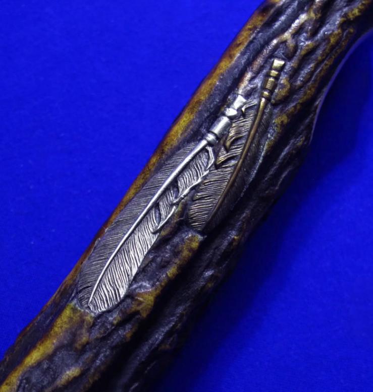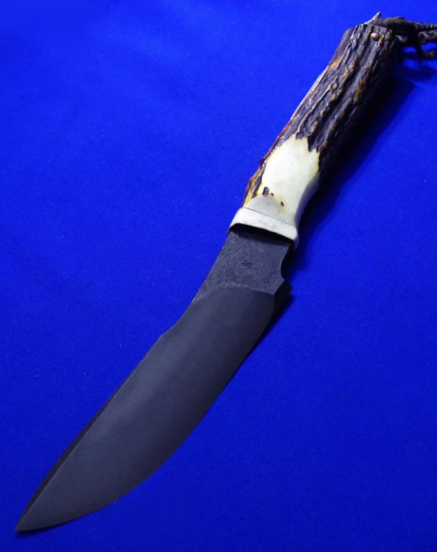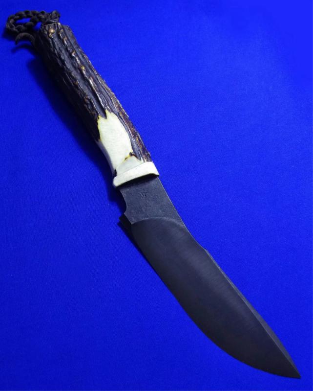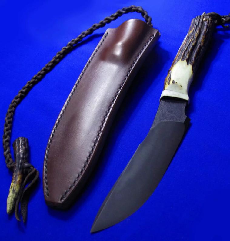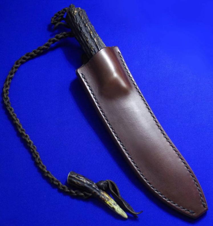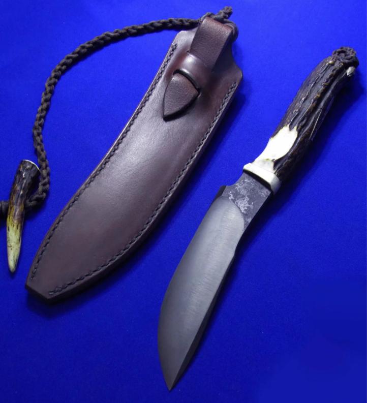 岛田英承 & 秋友义严 大师合作版手工生存刀,孤品唯一。全长:27.3cm。刃厚:5.3mm。刃材:青纸夹钢(甲伏锻),秋友义严热处理。硬度:63-65。柄材:鹿角。柄尾手工银鹰刀坠,柄背镶嵌两枚手工羽毛(一银一铜)。鞘材:牛皮。产地:日本。