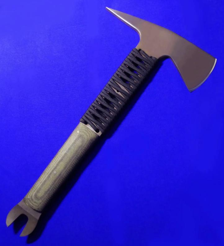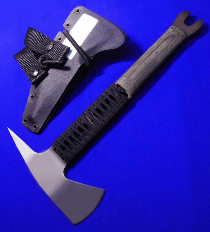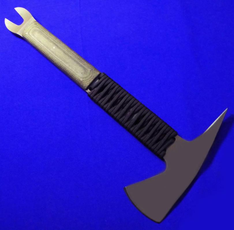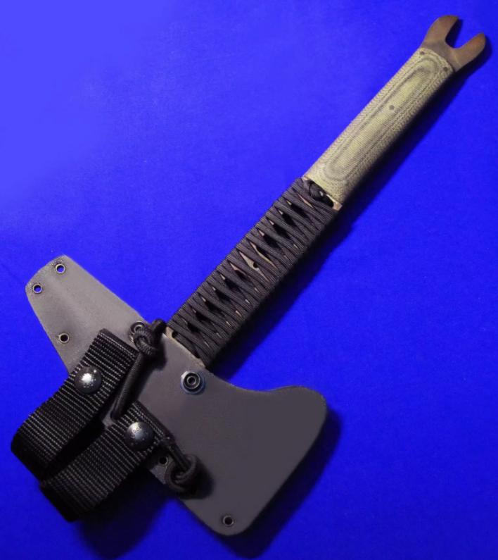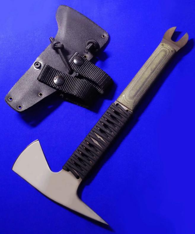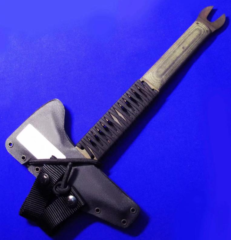 Daniel Winkler 丹尼尔.温克勒(ABS MS)手斧,稀有款(带撬棍功能)。 全长:32cm。 刃厚:6.5mm。 刃材:80CRV2。 硬度:60。 柄材:米卡塔。 鞘材:皮K混合静音鞘(K鞘,内衬鹿皮)。 产地:美国。