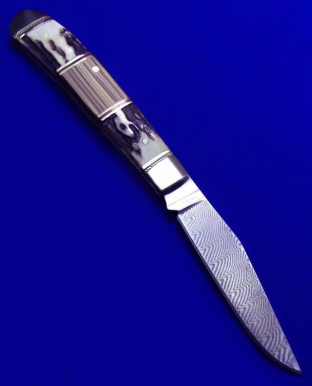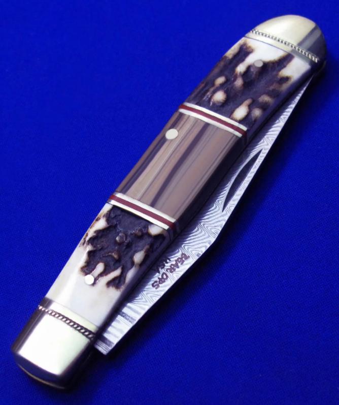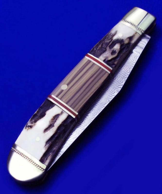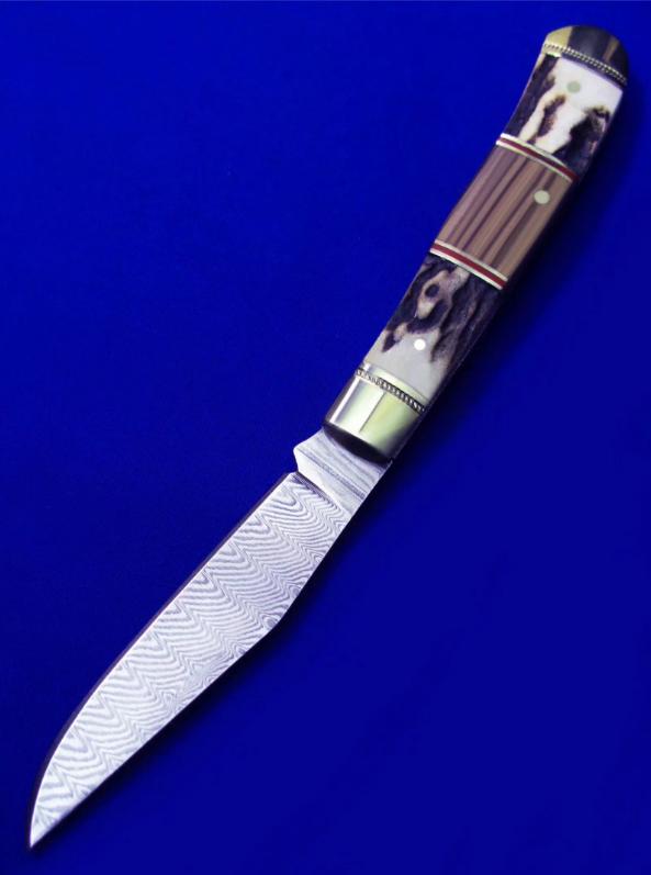 柄材:鹿角(贴片),实木(贴片),镊银(刀枕),黄铜(内衬)。