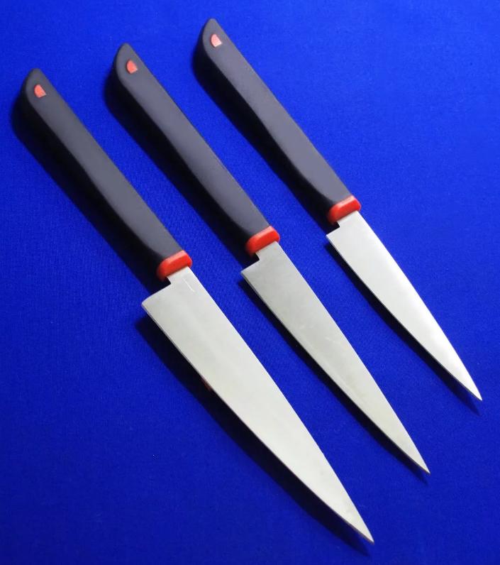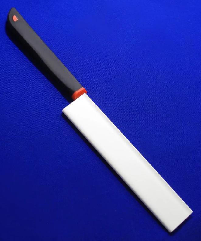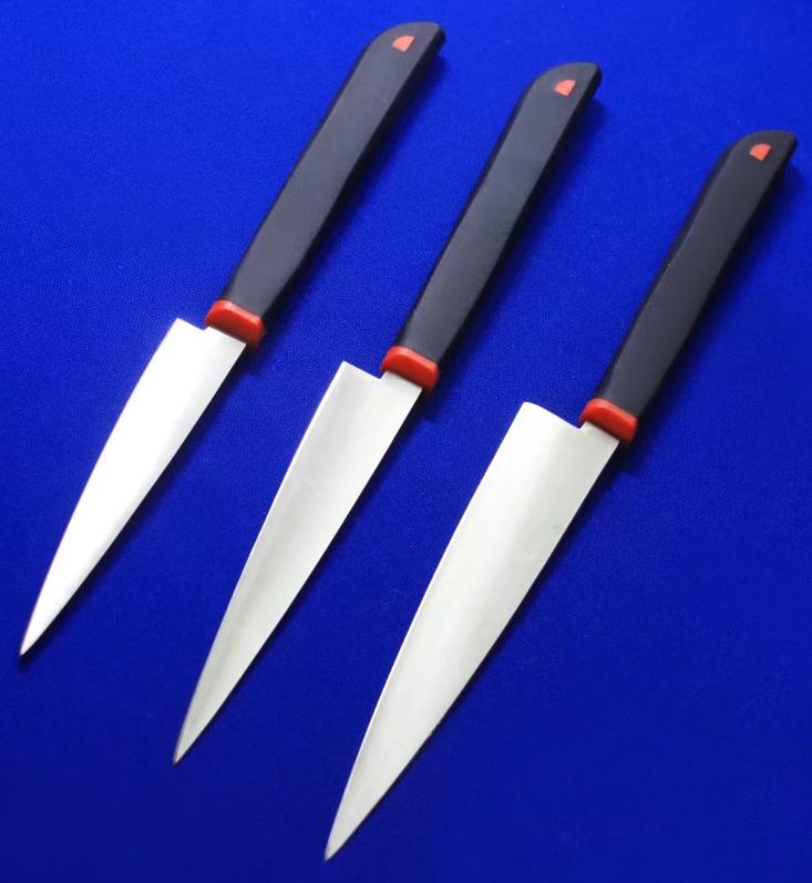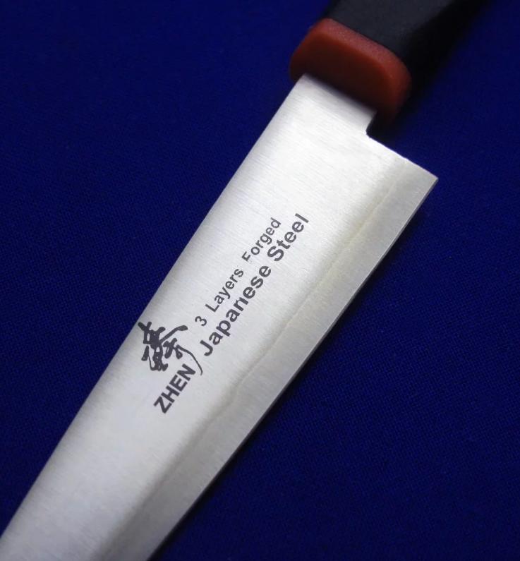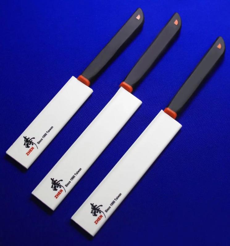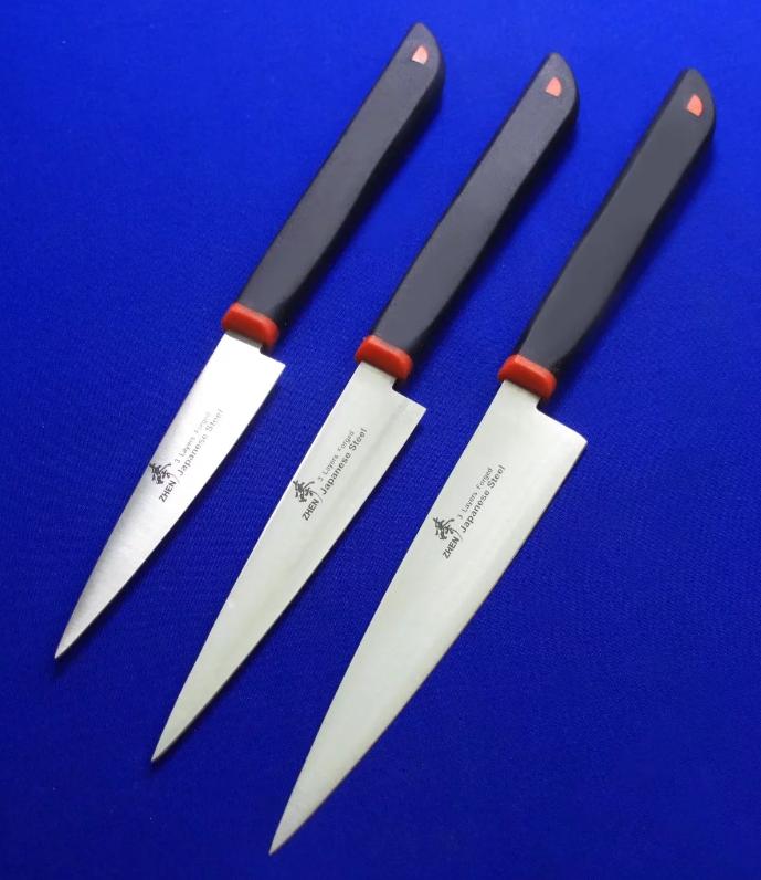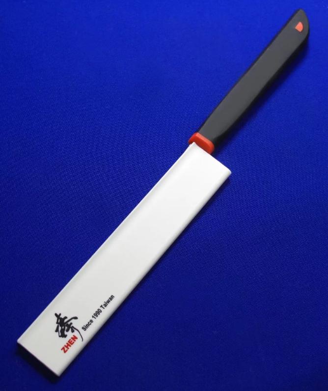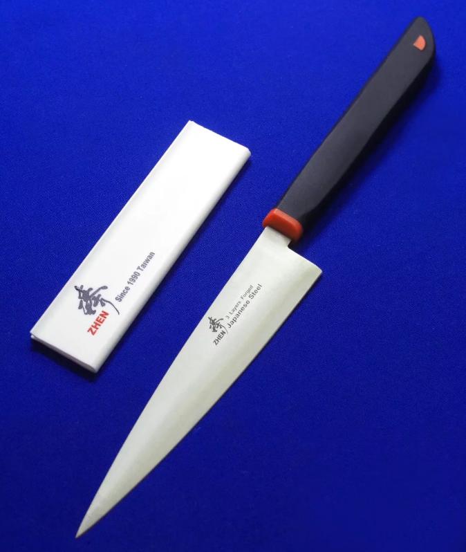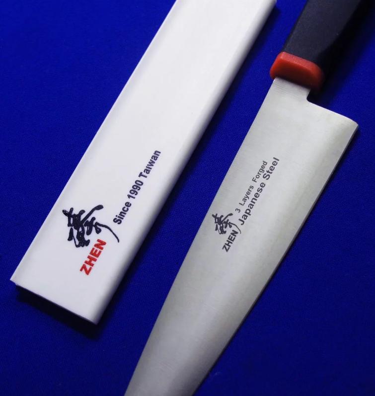 臻 三美钢 日用刀(带鞘)。 全长:20.2(小)21.8(中)23.5(大)cm。 刃厚:1.8mm。 刃材:日产 VG-10 San Mai(三美钢)。 硬度:60-62。 柄材:Zytel。 鞘材:白色弹性尼龙纤维。 产地:台湾。