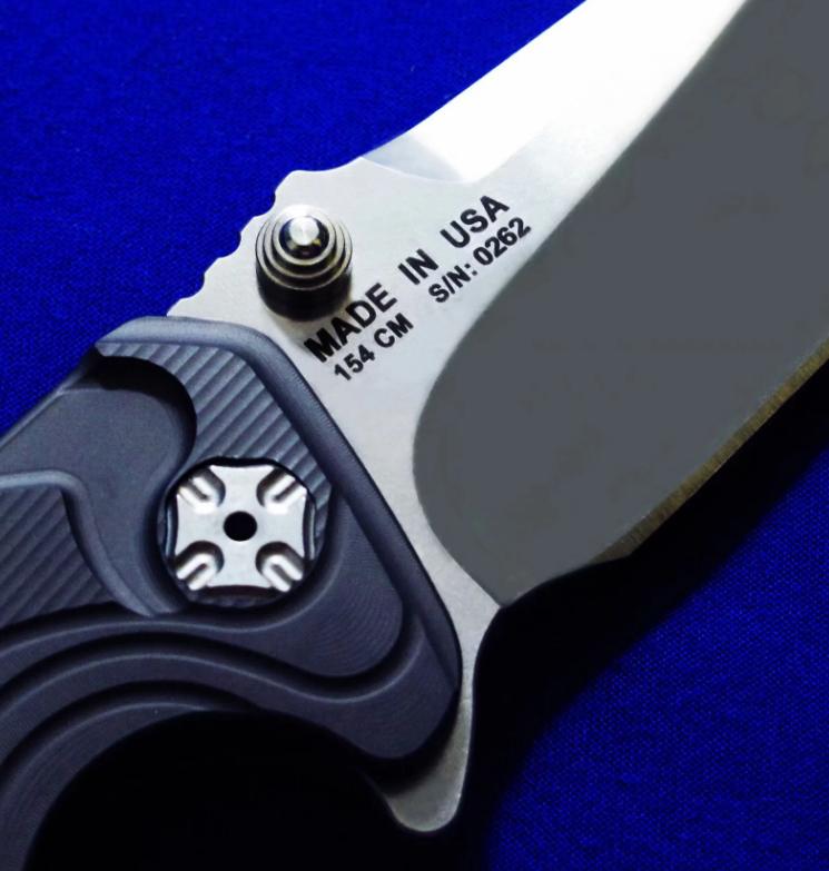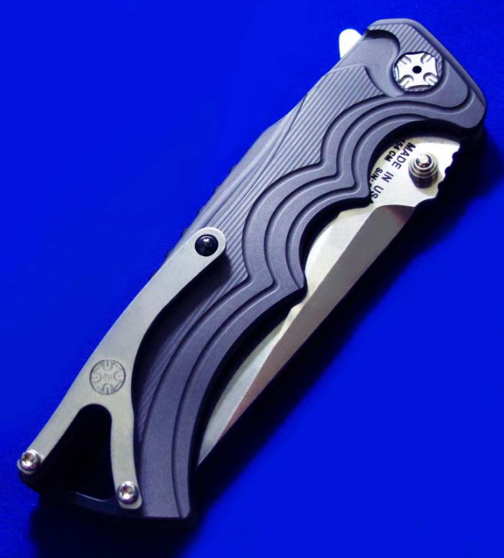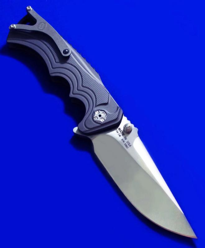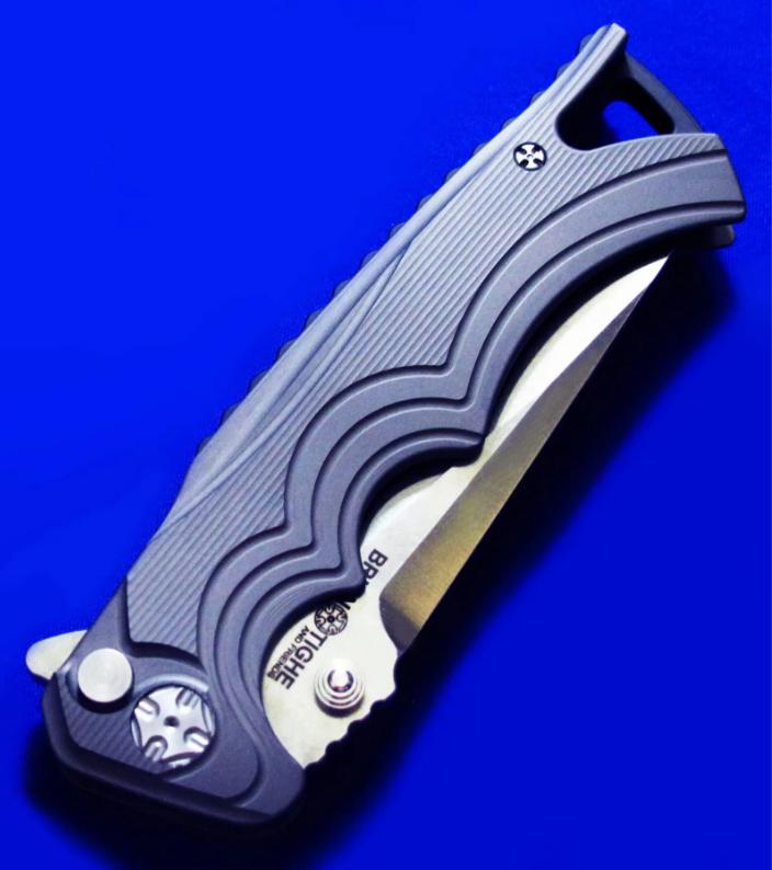 两种开刀方式,既可Flipper快开,也可传统(推刀钮)手动开启。 全长:22.8cm。 刃厚:5mm。 刃材:154CM。 硬度:60-62。 柄材:钛合金,腰夹镶嵌赤铁矿石。 产地:加拿大。