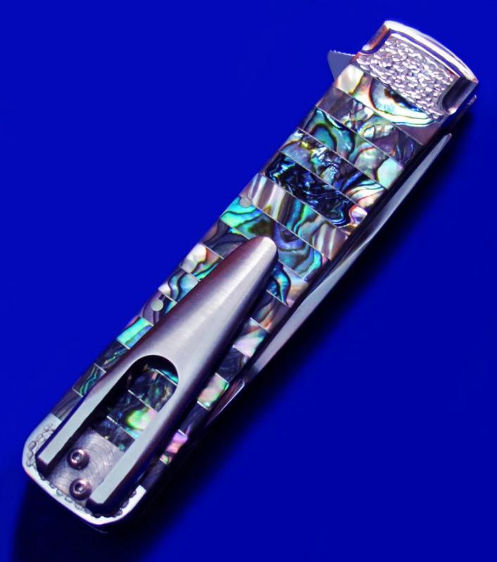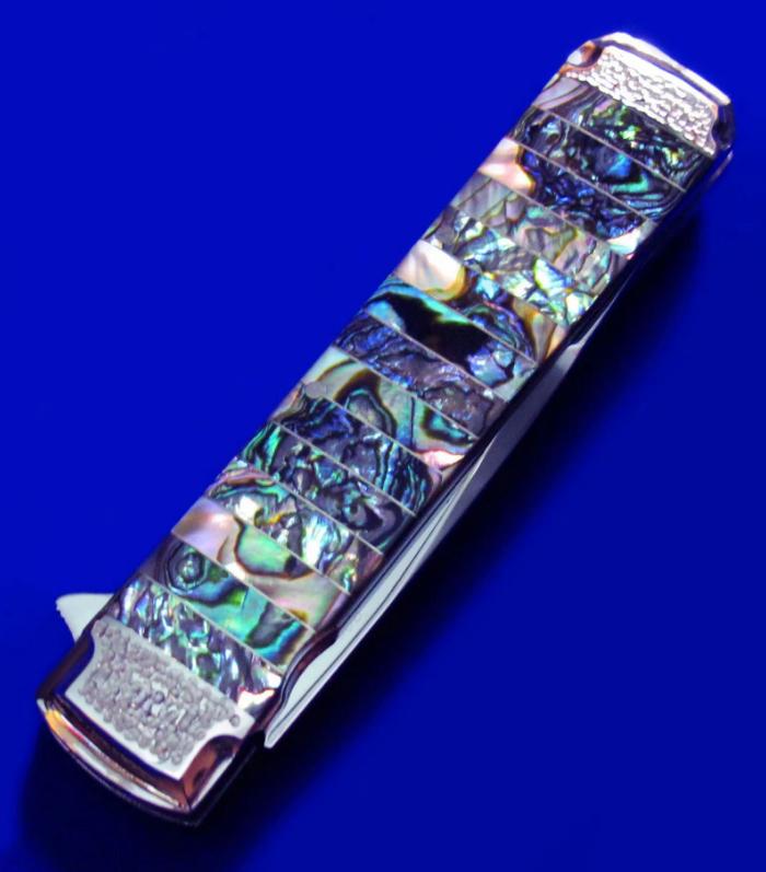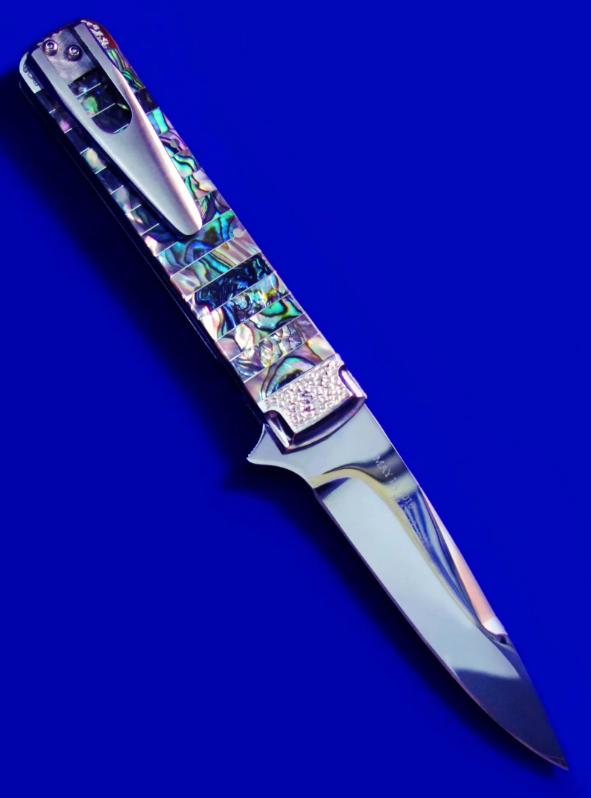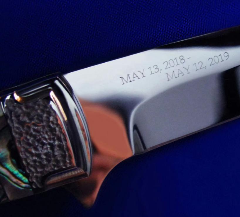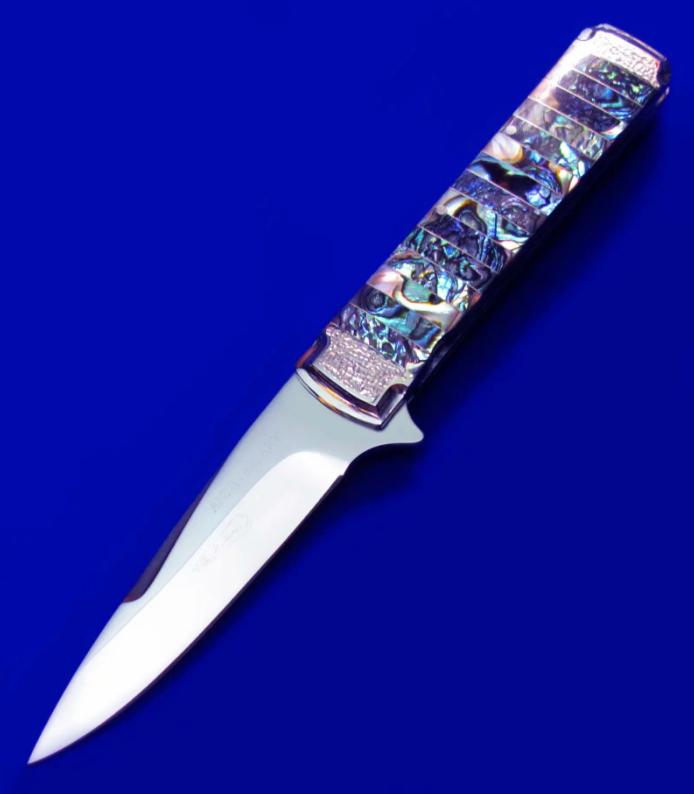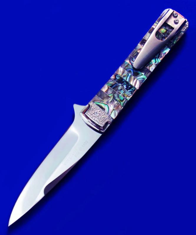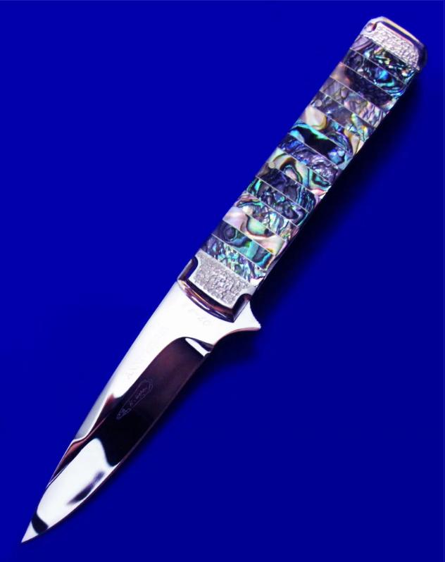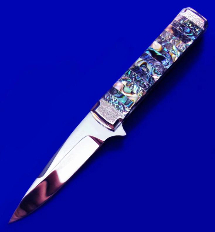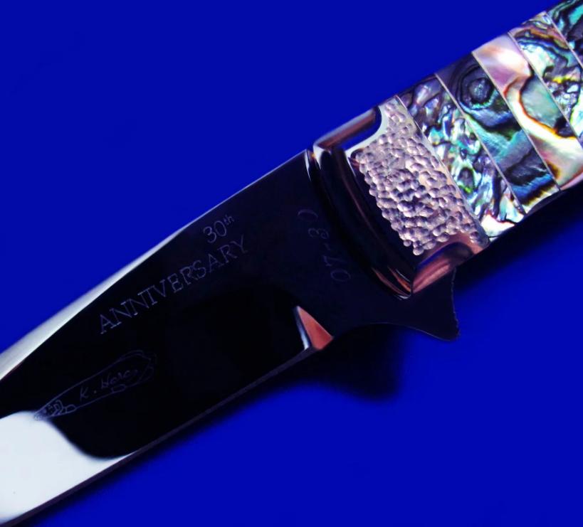 原幸治(日本刀匠协会前任主席,国宝级大师刀匠,目前已71岁高龄)30周年限量纪念版 镜面手工折刀。 限量30支,本支编号7。全长:18cm。 刃厚:2.6mm。 刃材:COWRY-Y。 硬度:63-65。 柄材:鲍鱼壳。 产地:日本。