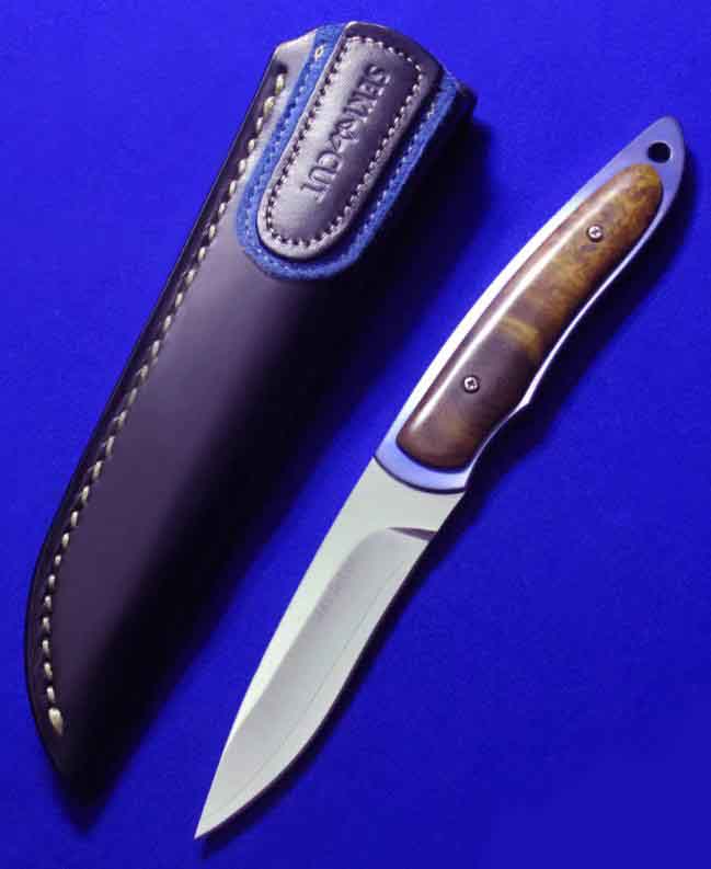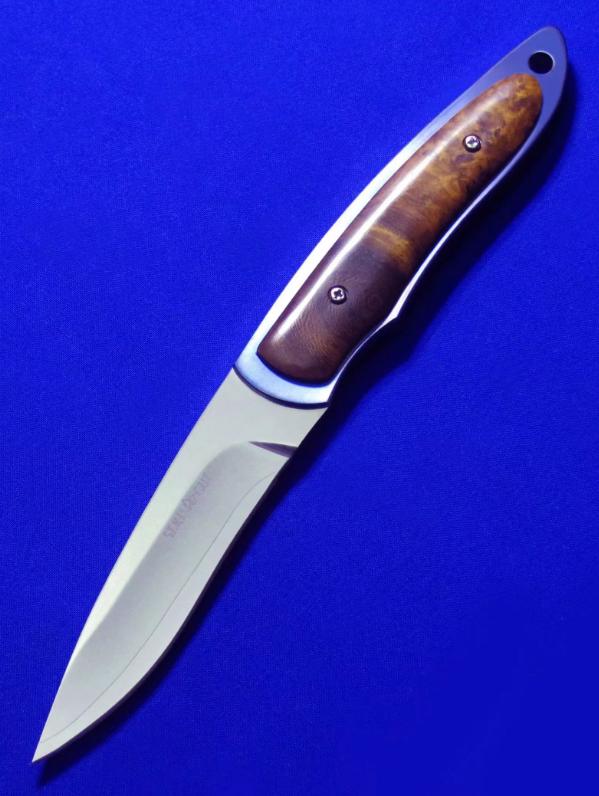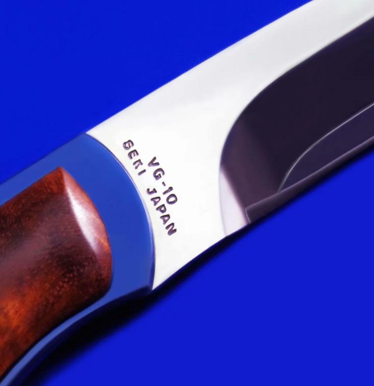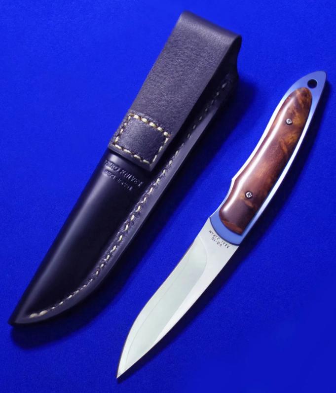 HIRO & G.SAKAI 合作小直。 全长:18.5cm。 刃厚:3.5mm。 刃材:VG-10 SAN MAI(三美钢)。 硬度:60-62。 柄材:钛合金,枫木瘤。 鞘材:牛皮。 产地:日本。