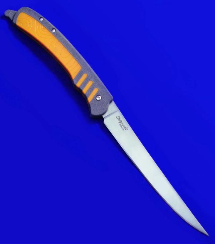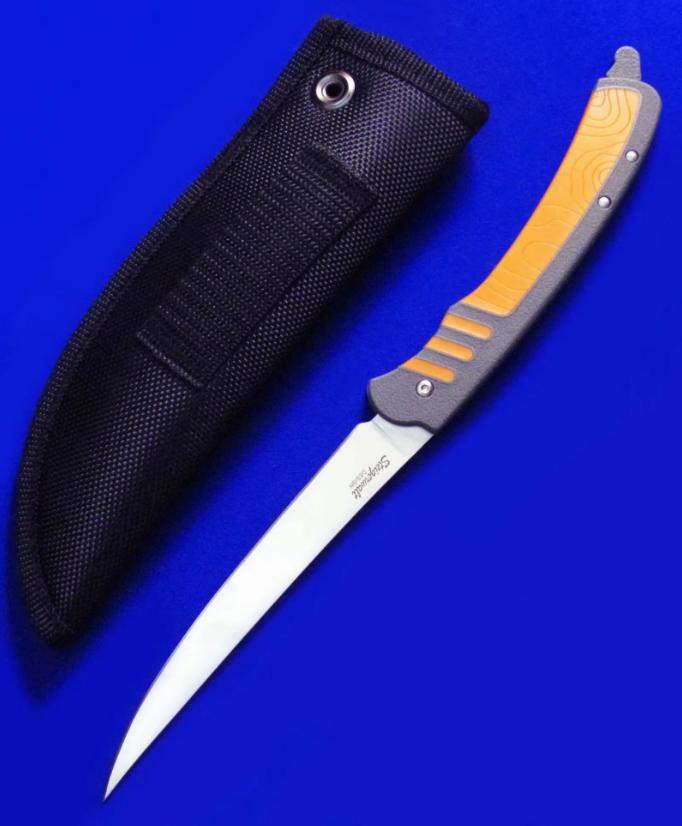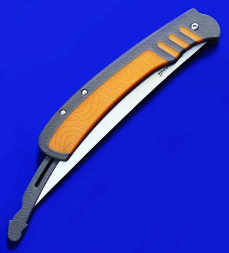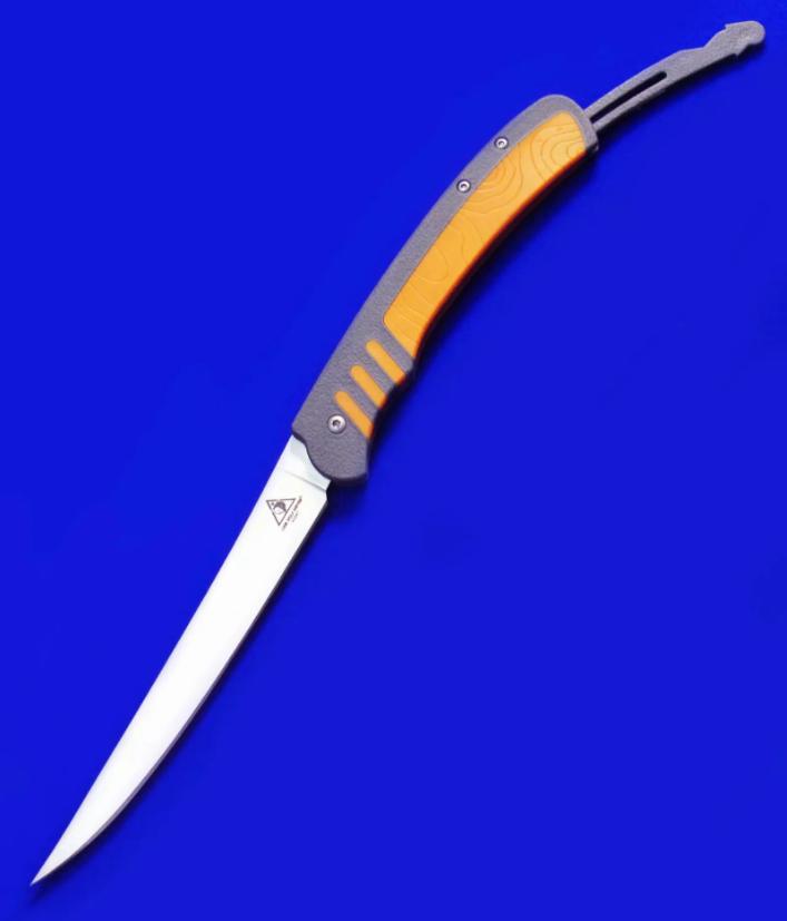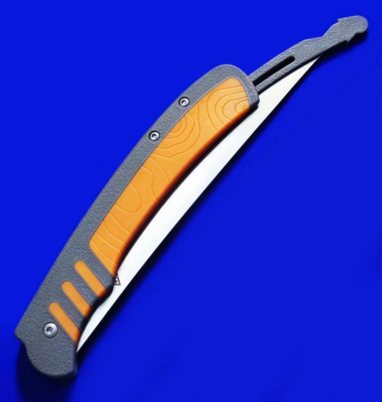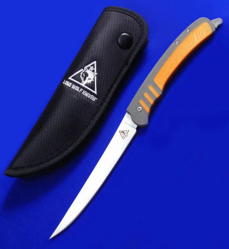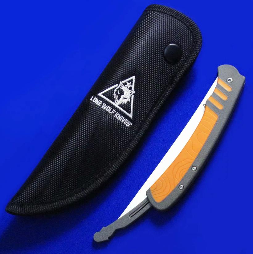 LoneWolf 独狼 轻量化折叠渔猎刀,已绝版。尾杆锁定:刀片展开后,向前推入尾杆即锁定,拉出尾杆即解锁。刀片折叠闭合后,向前推尾杆锁定(此时将无法打开刀片),拉尾杆解锁(即可打开刀片)。全长:27cm(锁定态,即尾杆推入状态,图1)。刃厚:2mm。刃材:N680。硬度: 58-60。柄材:FRN(灰色区域),KRATON(橙色区域)。鞘材:Nylon。产地:美国。